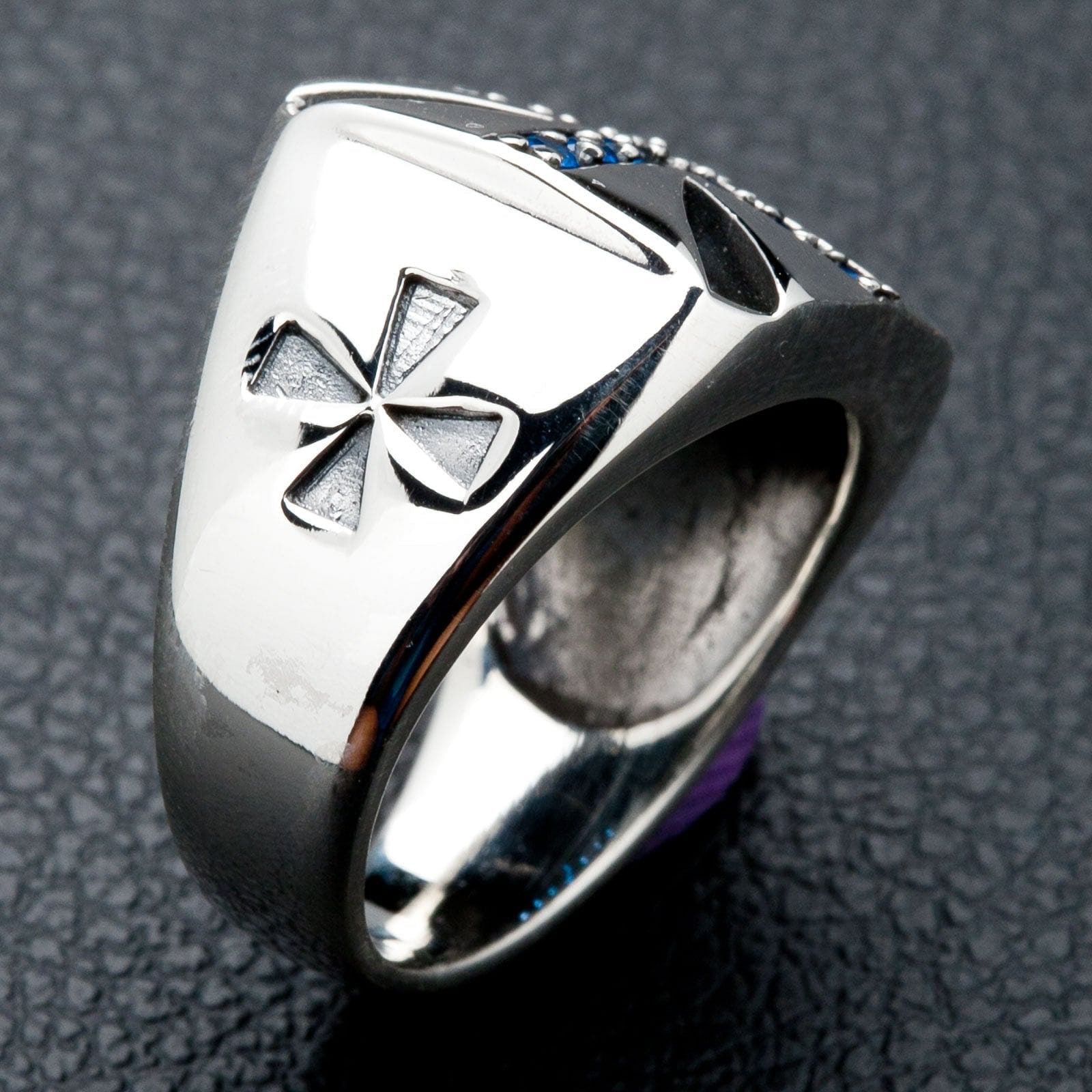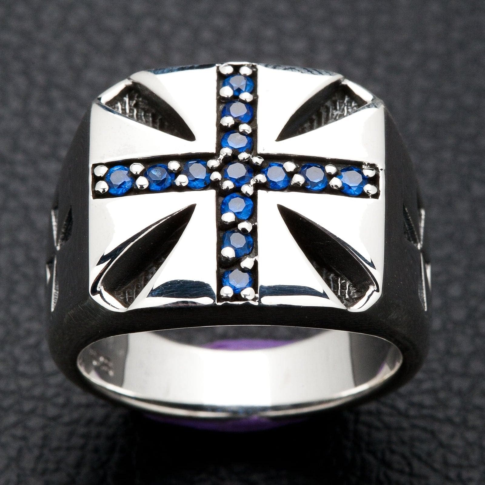 Carry a timeless symbol of courage, honor, and protection with this striking maltese cross ring. Masterfully forged from solid .925 sterling silver and brilliantly illuminated with deep blue stones, this ring is a modern tribute to the ancient code of chivalry. It's a powerful statement piece for the modern-day knight, the biker, and any man who lives by a code of strength and integrity.