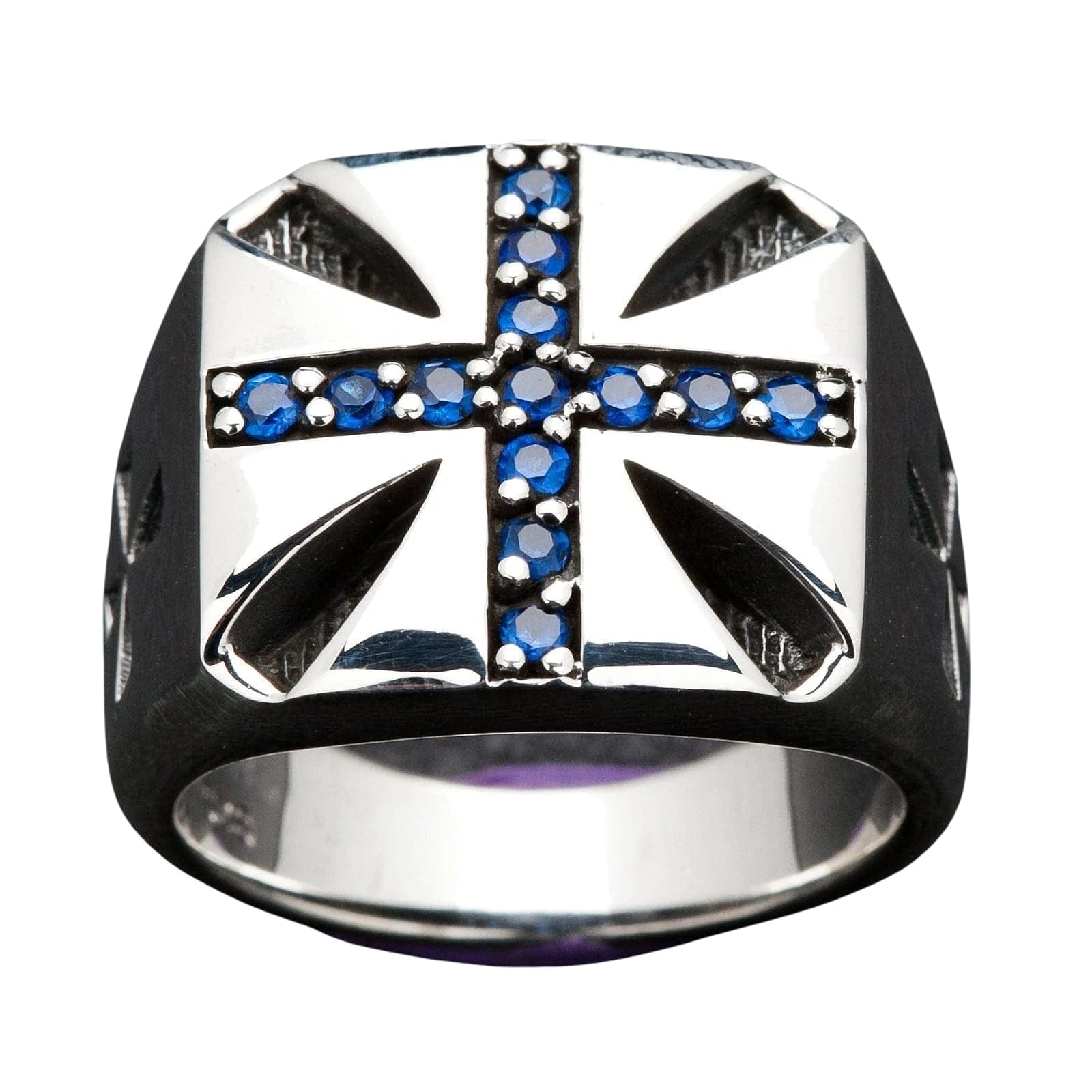 The Maltese Cross is a legendary emblem, historically worn by the noble Knights of Malta as a symbol of their eight sacred obligations. Today, it has been adopted by warriors of all kinds—from firefighters to bikers—as a proud badge of bravery and protection. This ring presents the iconic cross in a bold, clean, and powerful design, its arms brilliantly paved with deep blue stones that symbolize loyalty, wisdom, and faith.