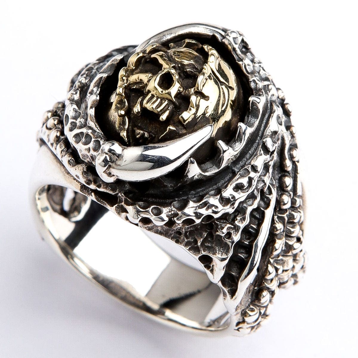 This ring is a stunning narrative of power and possession, cast in solid metal. The entire piece is a masterfully sculpted monster's claw, its surface covered in a rough, bio-mechanical texture reminiscent of an alien predator's hide. From this dark, oxidized silver base, sharp, polished talons rise up to clutch their prize: a grim, golden brass skull. This dramatic two-tone design creates a powerful visual story—the cold, silver predator capturing the warm, precious essence of life. Weighing a colossal 25 grams, this solid silver and brass masterpiece has a formidable, premium feel that is as powerful as the story it tells.