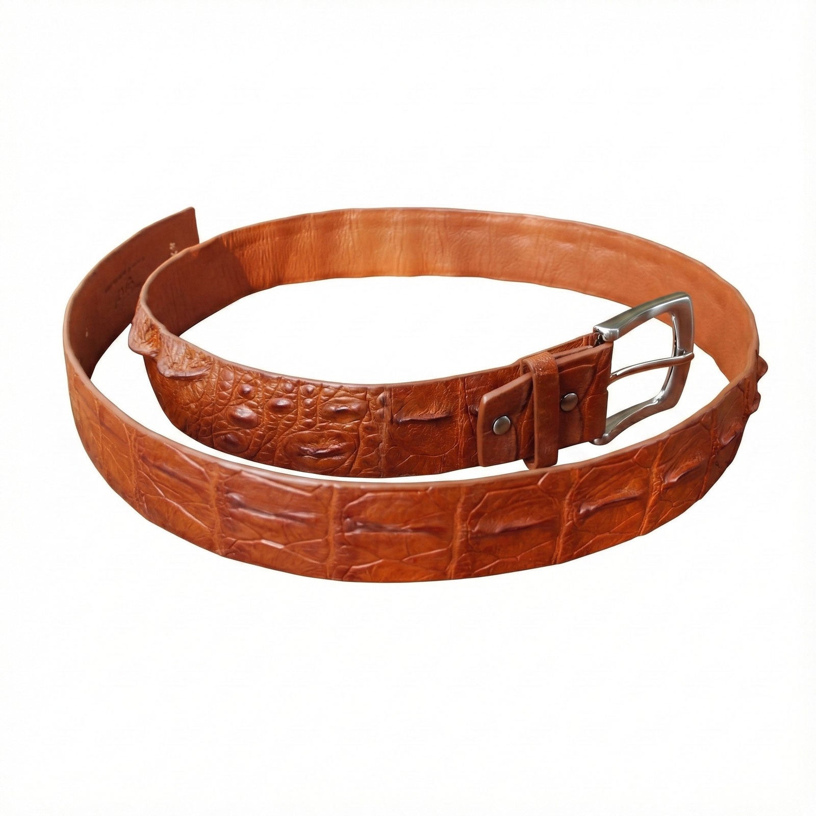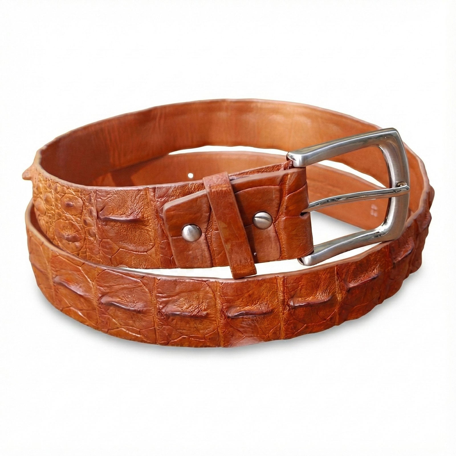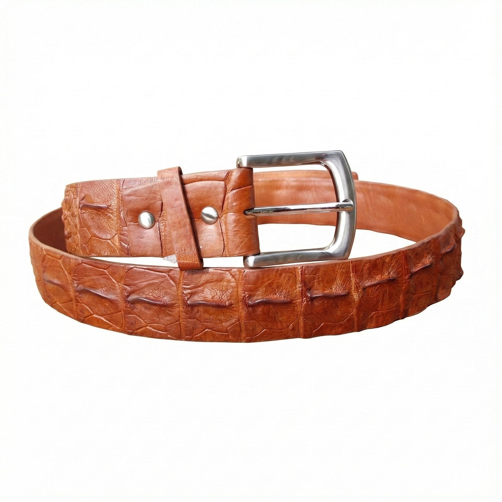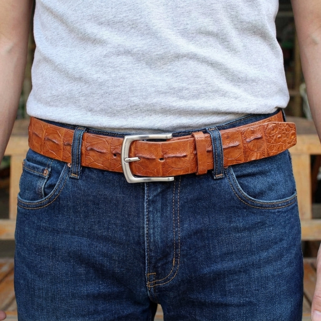 The allure of this belt lies in its raw, organic beauty and high-quality craftsmanship. Unlike standard embossed cowhide, genuine crocodile leather possesses a unique scale pattern—specifically the raised ridges known as osteoderms—that ensures no two belts are ever identical. The deep cognac brown finish highlights the natural peaks and valleys of the hide, creating a dynamic visual texture that evolves over time.