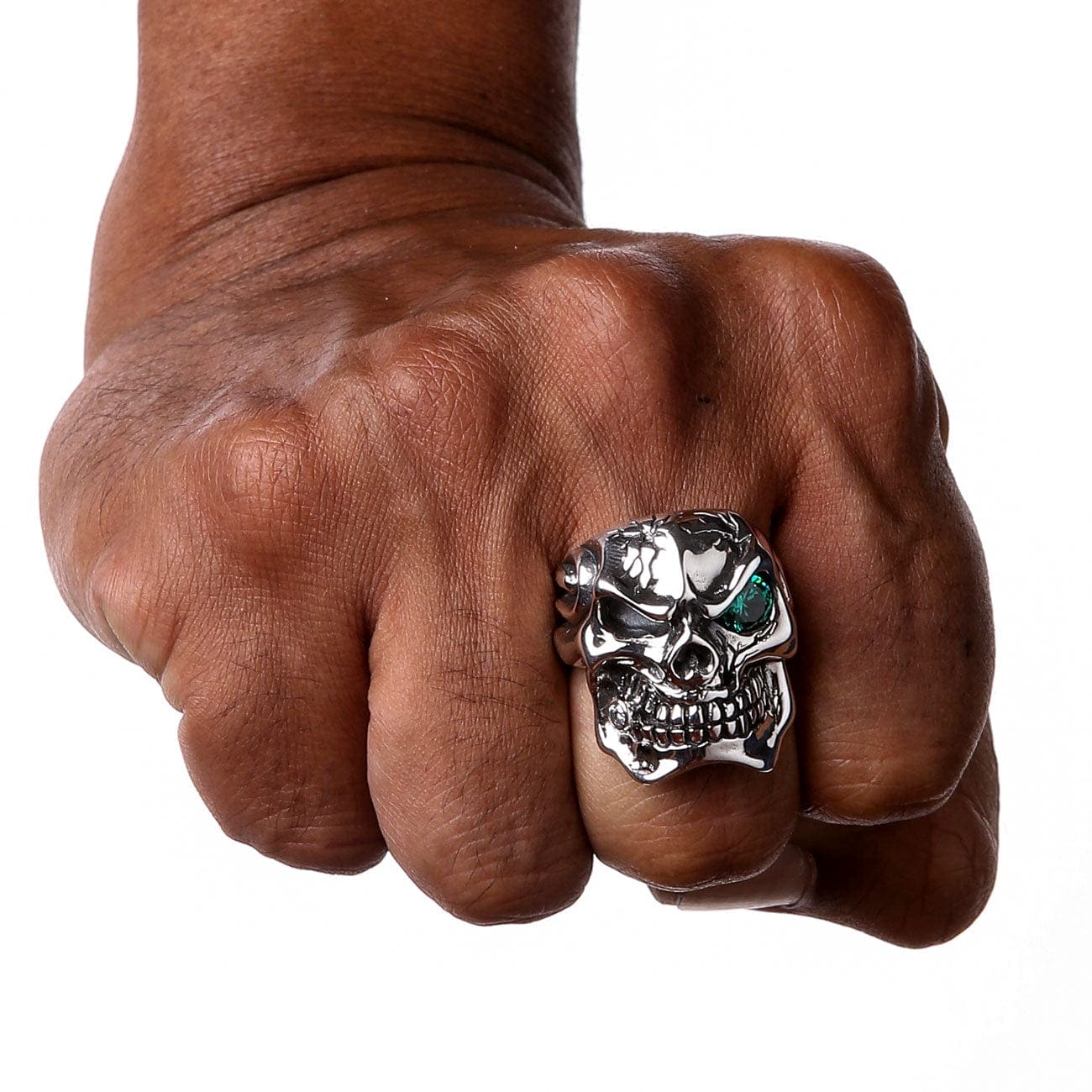 The soul of this piece is its single, captivating eye, set with a brilliant, round-cut emerald green CZ stone that glares with sinister intensity. The unexpected sparkle of the clear diamond accent tooth adds another layer of unique character. This beast of a ring is forged from a massive 30 grams of solid sterling silver, giving it a powerful heft that defines the authentic rocker style. For more formidable designs, explore our complete collection of Skull Rings.