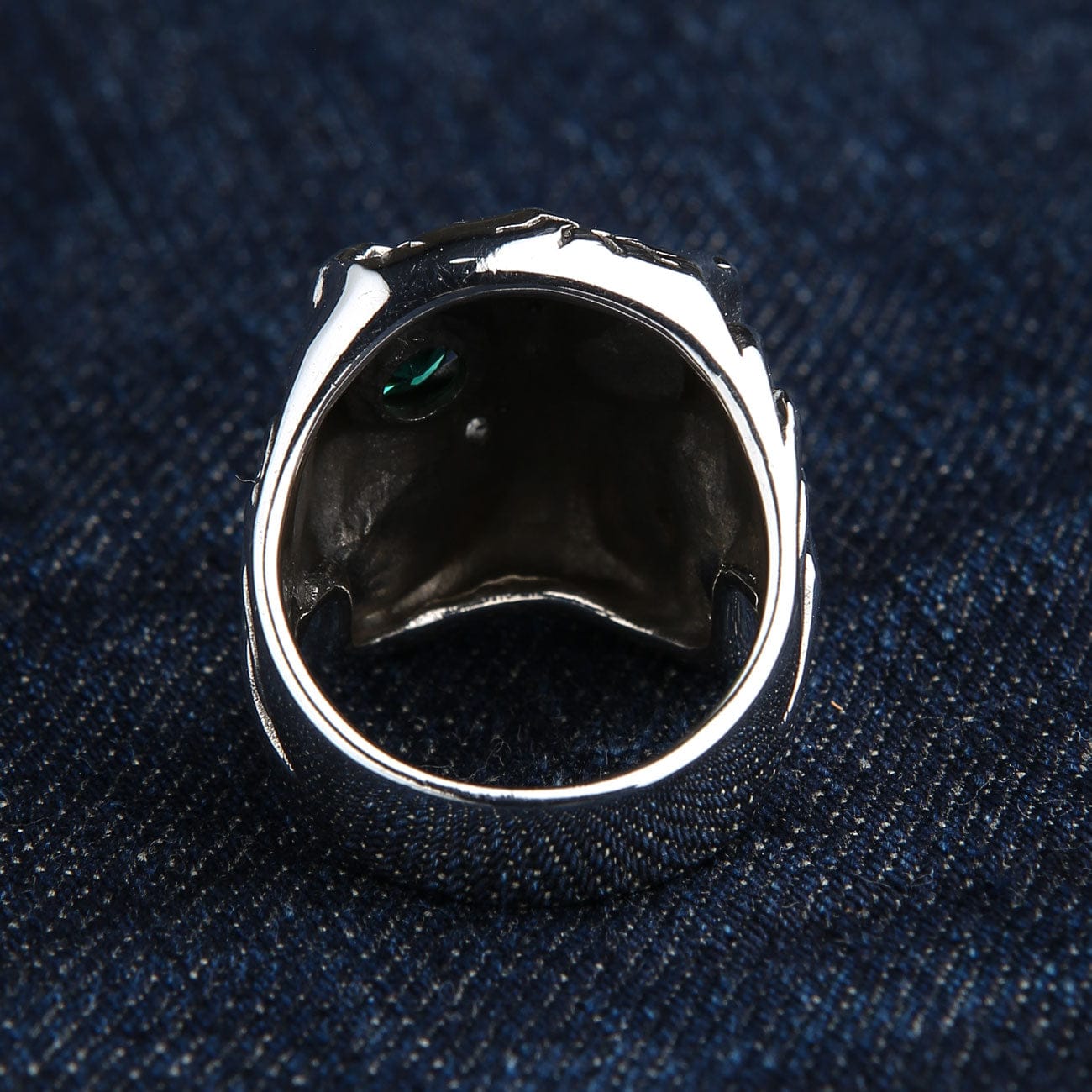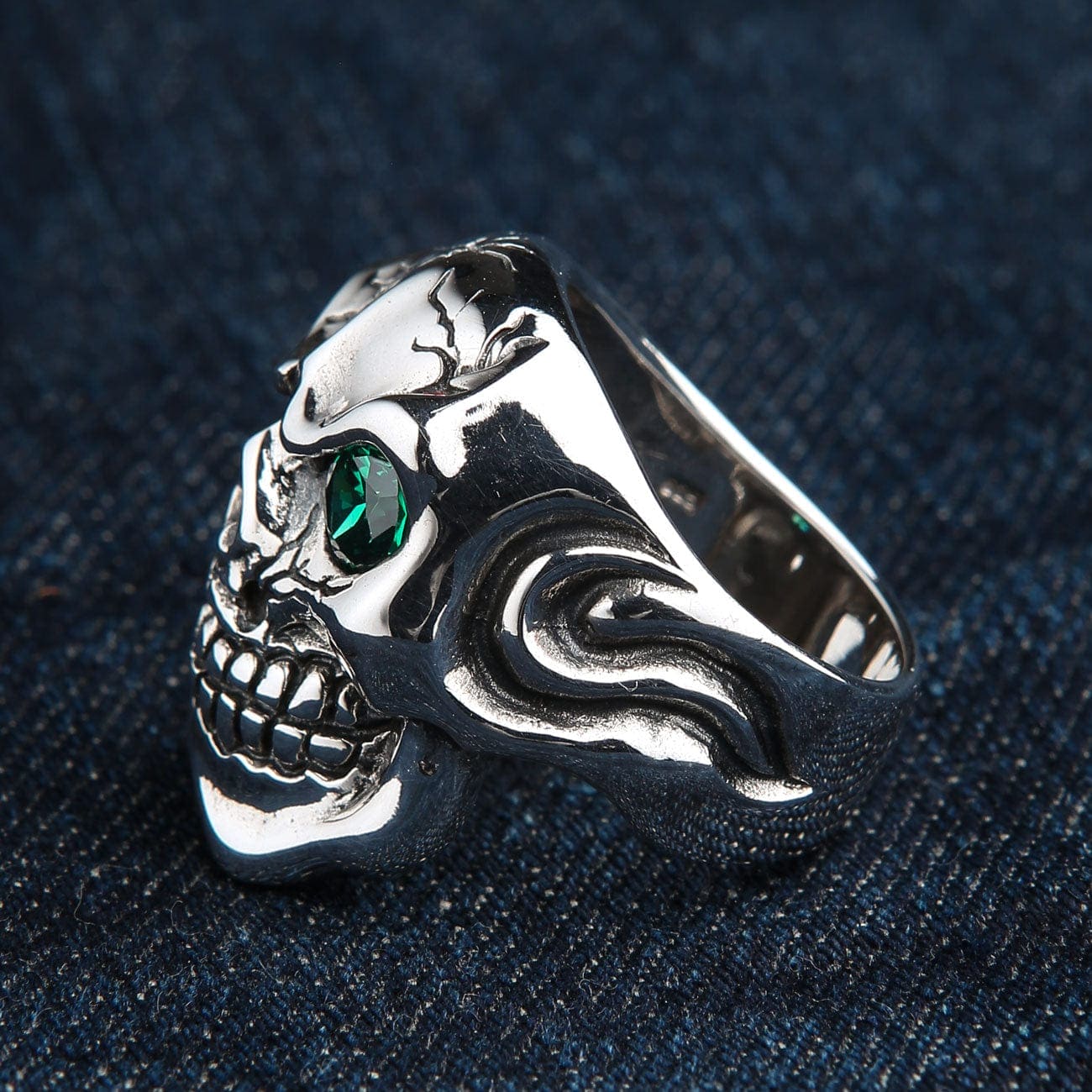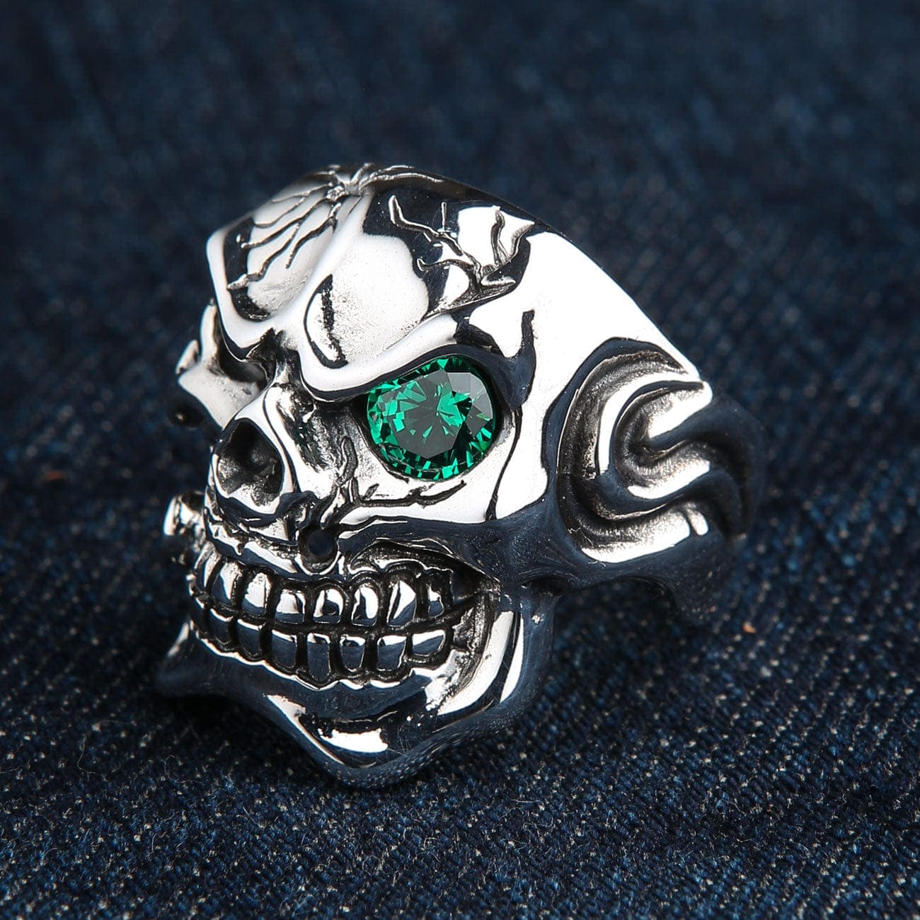 Unleash a look of pure intimidation with this colossal Green Eye Skull Ring. This is not just another piece of biker jewelry; it's a massive, battle-damaged statement ring that tells a story of survival and defiance. With its cracked cranium and a single, piercing green eye, this ring is a testament to raw, untamed power.