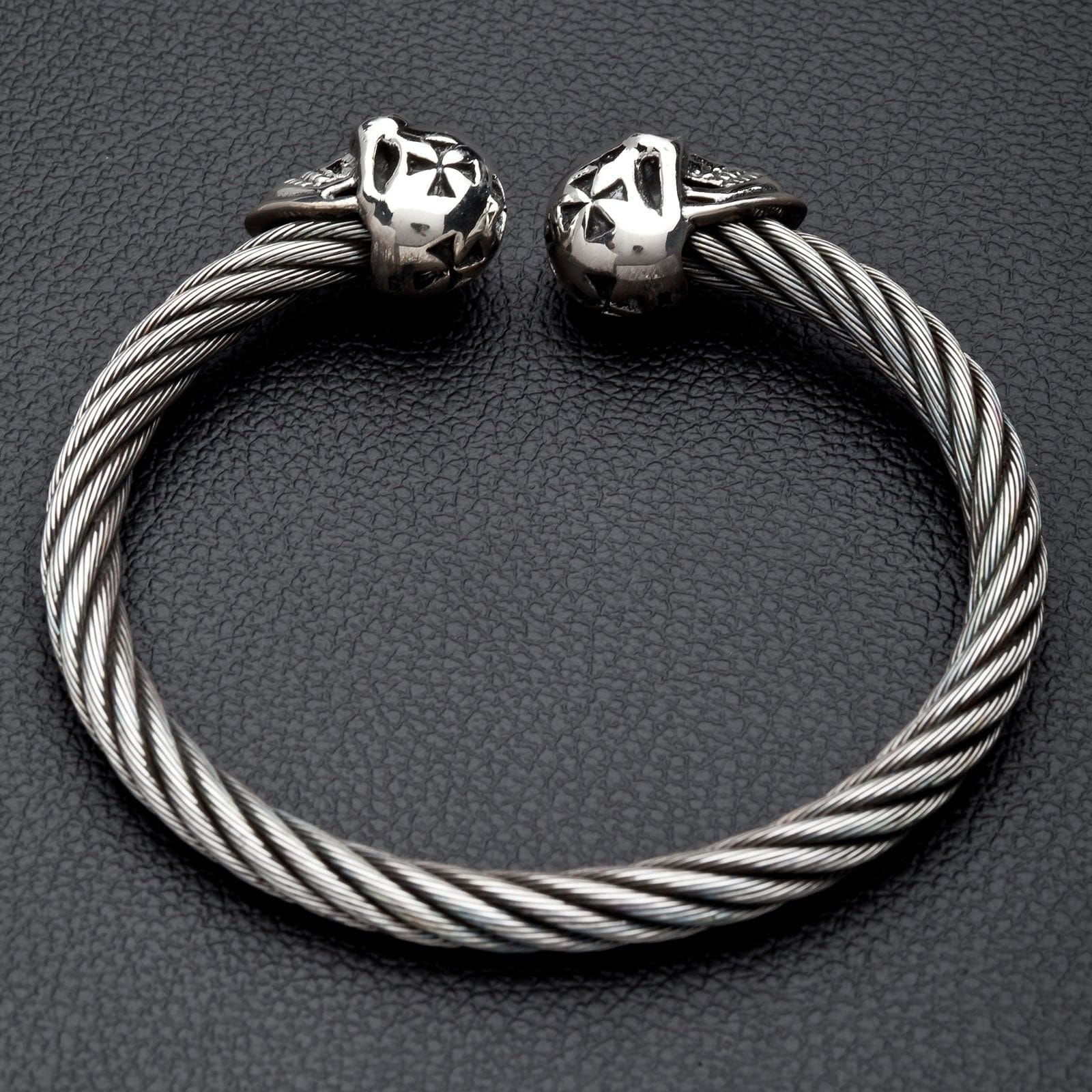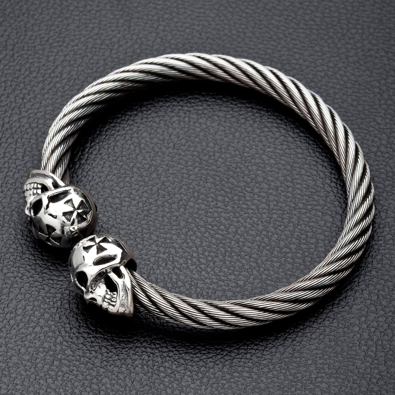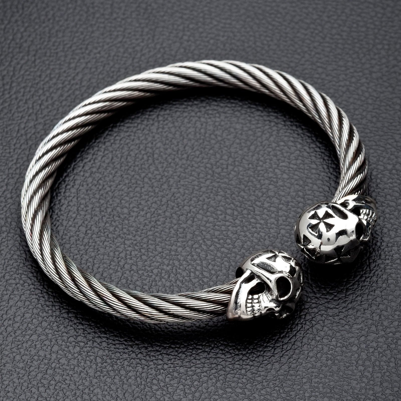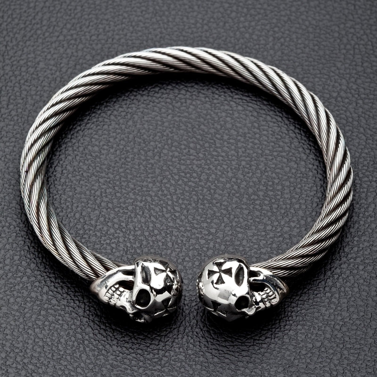 Embrace the perfect blend of gothic edge and industrial power with our Biker Skull Cuff Bracelet. This isn't your average cuff. It's a bold, 50-gram mixed-metal statement, featuring two fierce, polished solid 925 sterling silver skulls. They cap off a rugged, twisted stainless steel cable band, creating a look that is pure biker style and built to last.