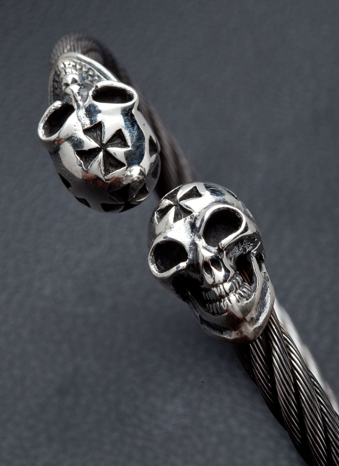 The attitude is all in the details. Each gothic skull is a work of art, with oxidized details that make the memento mori features pop. But the true symbol of honor is the Iron Cross (or Maltese Cross) carved directly into the forehead of each skull, a timeless nod to rebellion and freedom. The brilliant shine of the polished silver skulls creates a stunning contrast against the dark, twisted wire of the stainless steel band. It’s a Cross Skull Bracelet designed for the open road.
