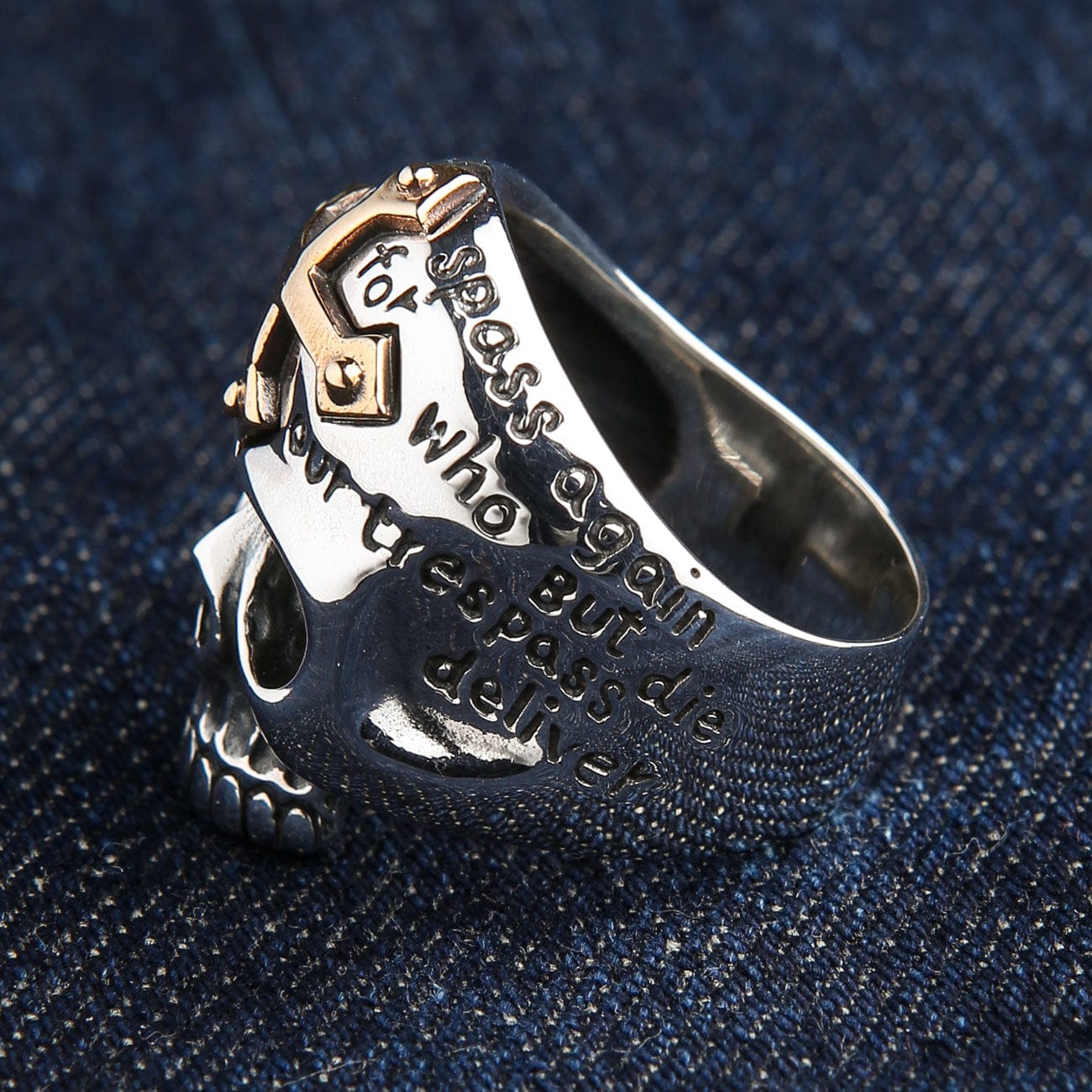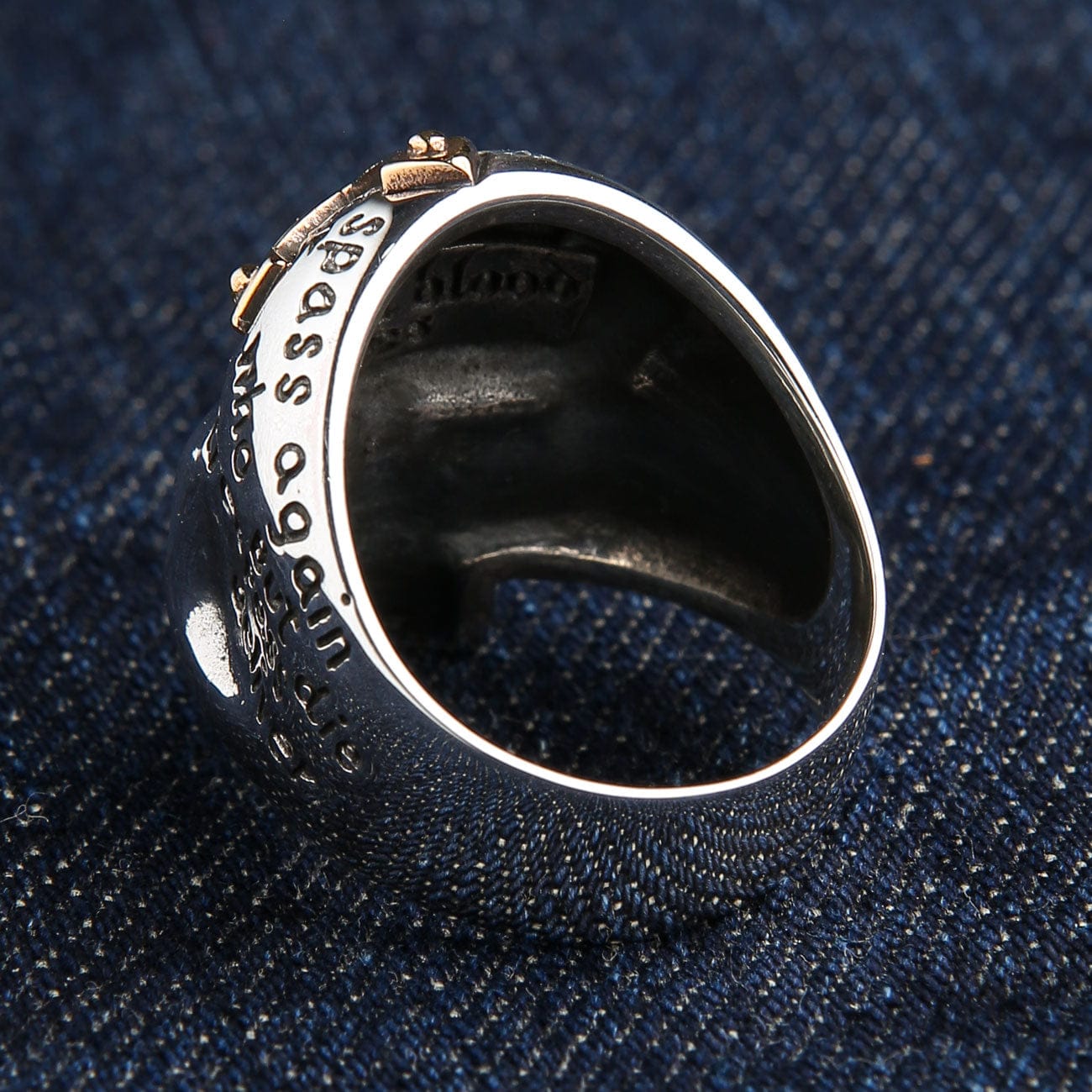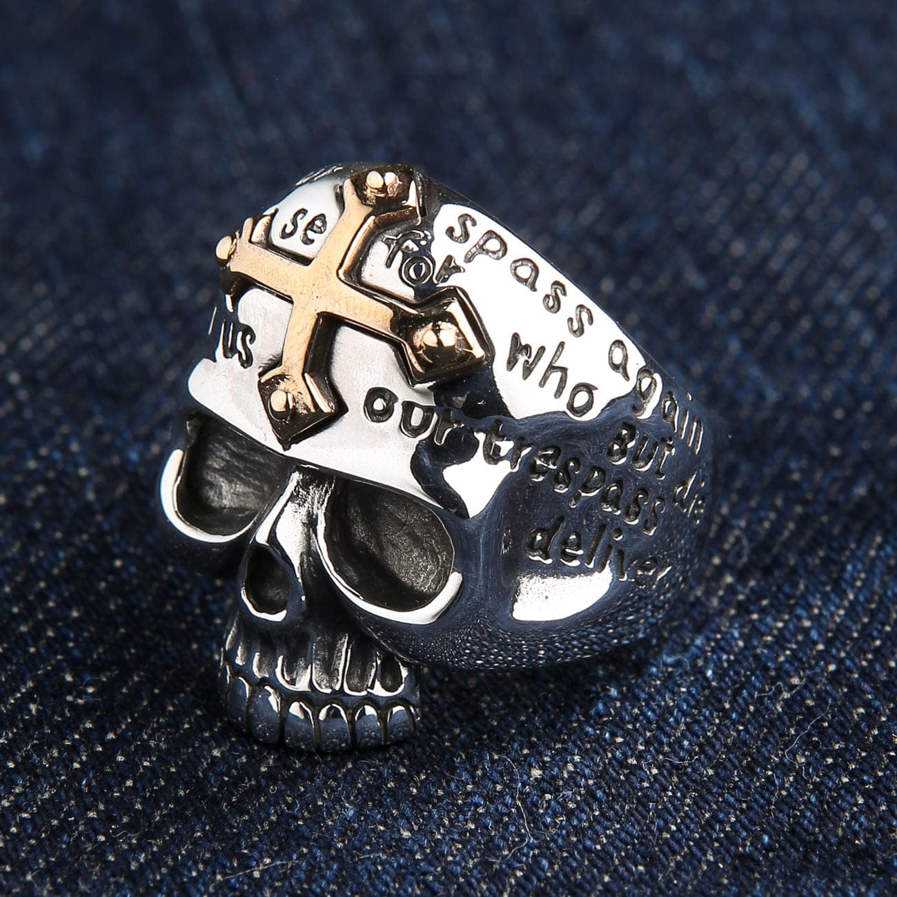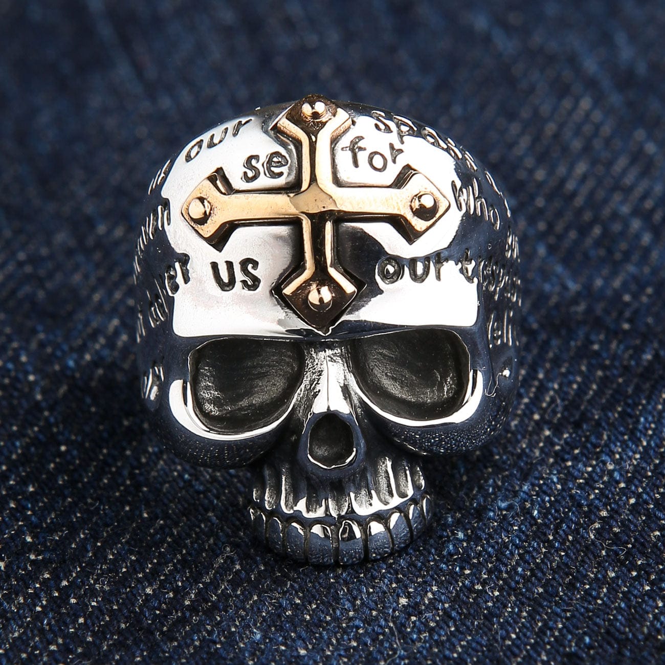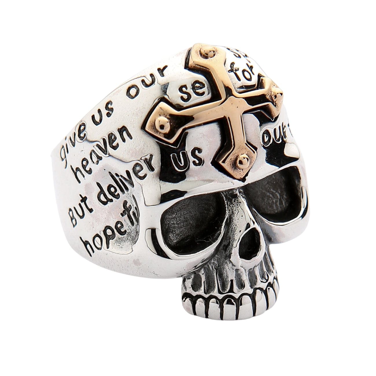 This ring tells a powerful story from every angle. The face is a grim, polished sterling silver skull, the ultimate symbol of mortality and fearlessness. Crowned atop its head is a bold, contrasting 14k gold-plated cross, an unmistakable emblem of faith. But the true genius of this piece is revealed on the sides. The entire cranium of the skull is masterfully engraved with the words of the Lord's Prayer, wrapping a sacred vow around a symbol of rebellion. This creates a stunning juxtaposition—a memento mori that is also a declaration of eternal faith. Weighing a colossal 21 grams, this solid silver ring has the authoritative heft and presence to match its profound message.