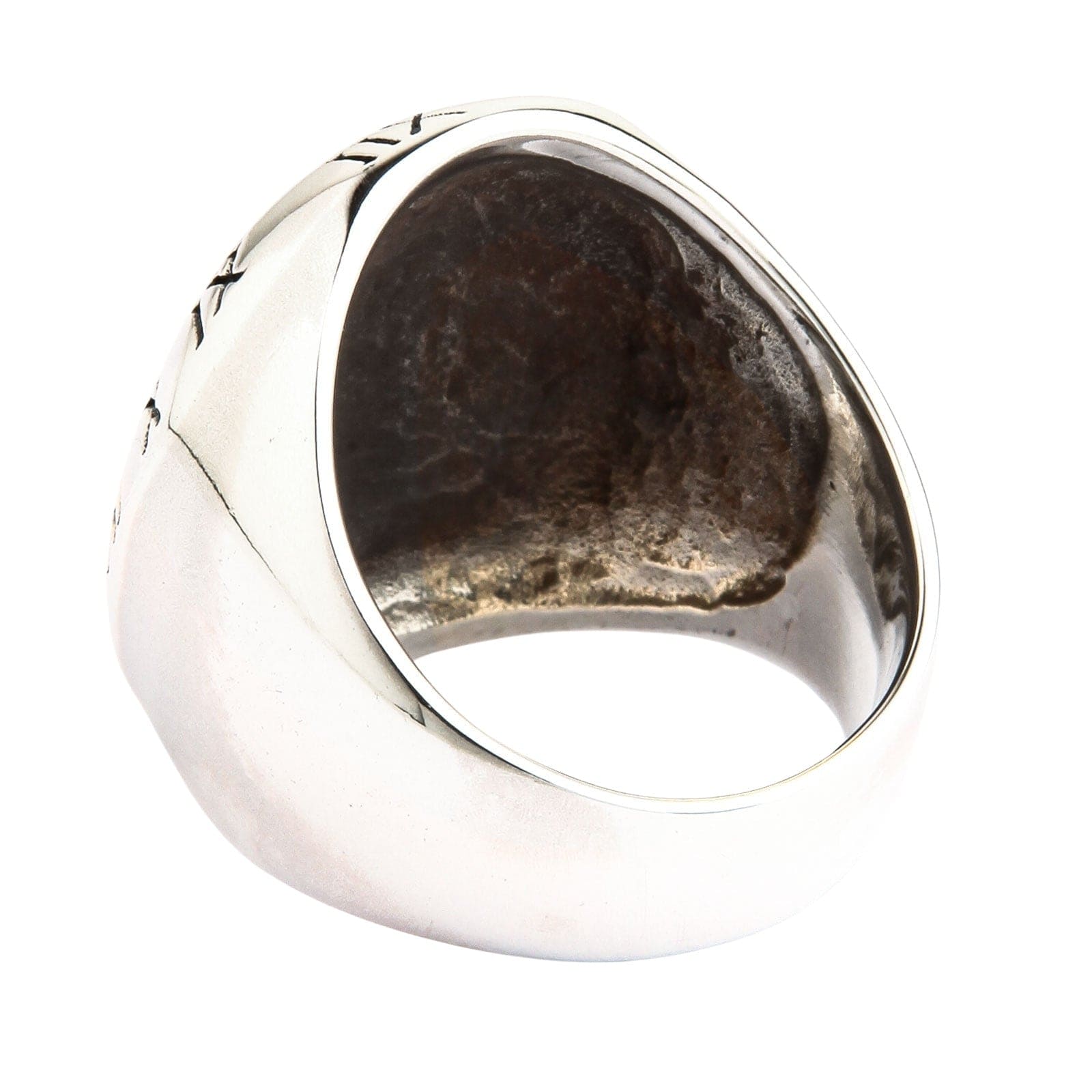 🖐️ Intricate Handcrafted Details: The central image is deeply carved and set against a dark, oxidized background, with a brilliantly polished bezel and band, all expertly hand-finished.
