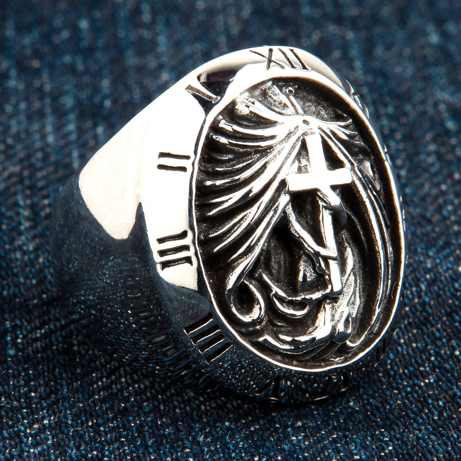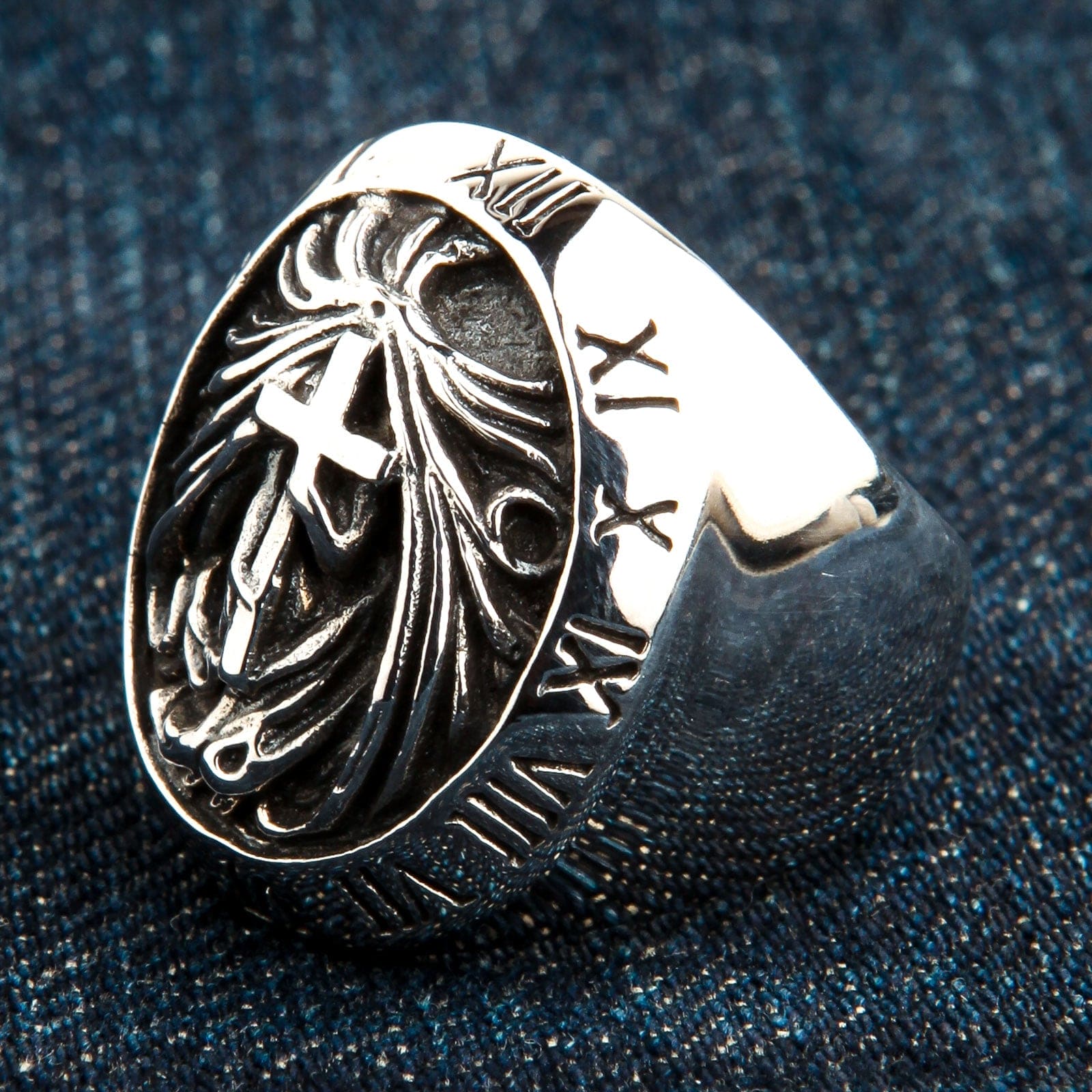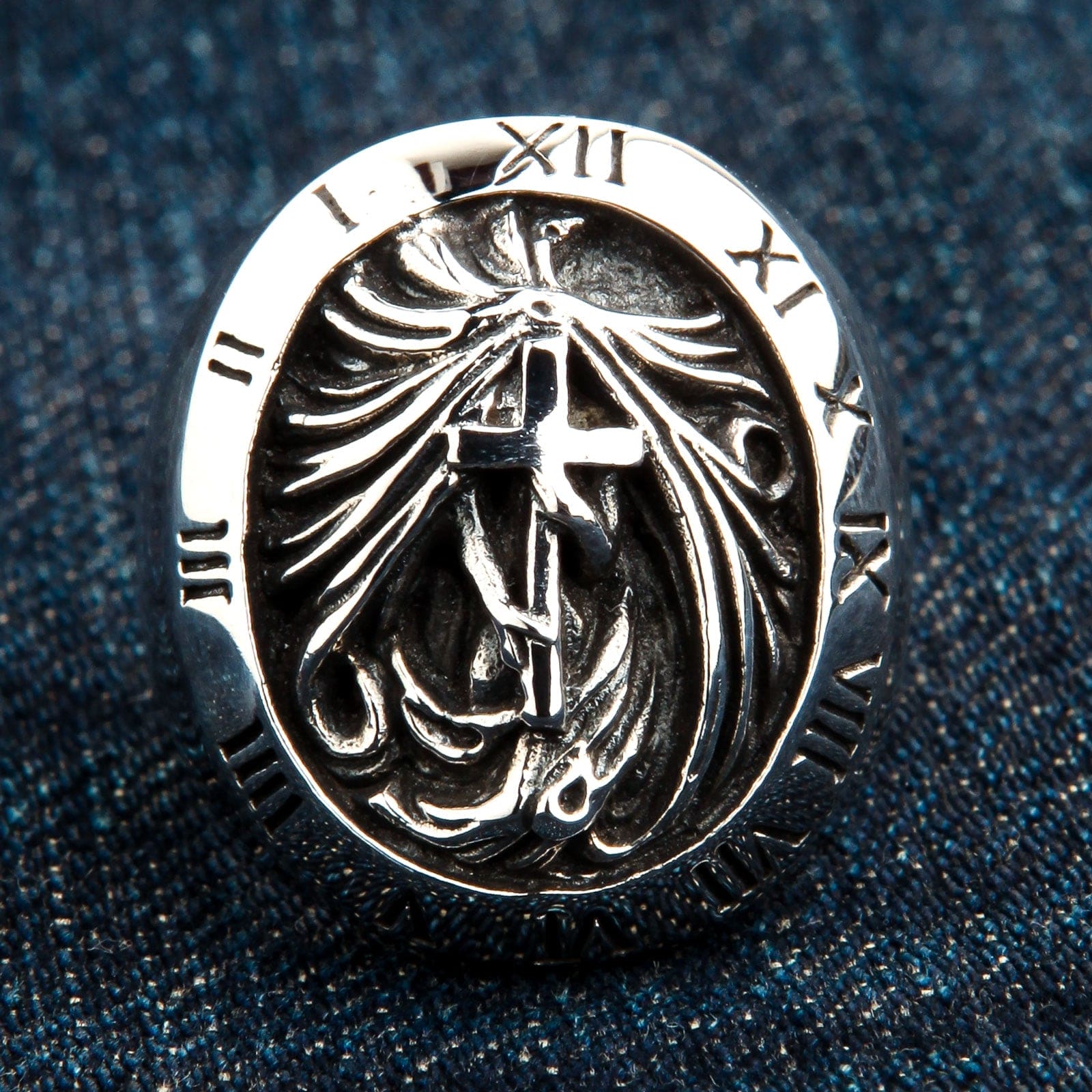 1. What does this Roman numeral and cross ring symbolize? This ring is a powerful memento mori. The Roman numeral clock face symbolizes the passage of time and mortality. The central image is a symbolic representation of the 'Struggle of Faith': a cross (faith) being held and fought for by hands and wings against a background of chaos or sin. Together, they symbolize the constant, timeless battle to hold onto one's beliefs throughout life.