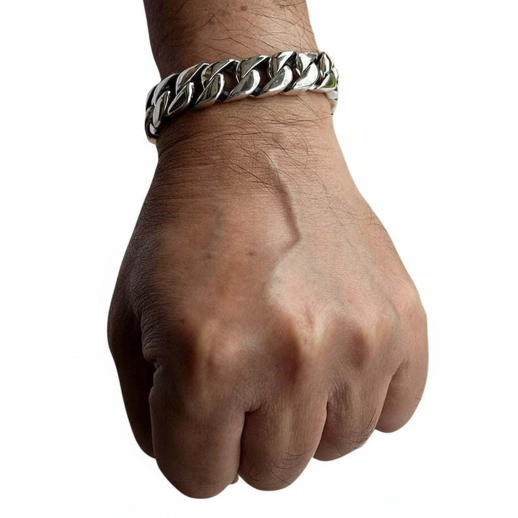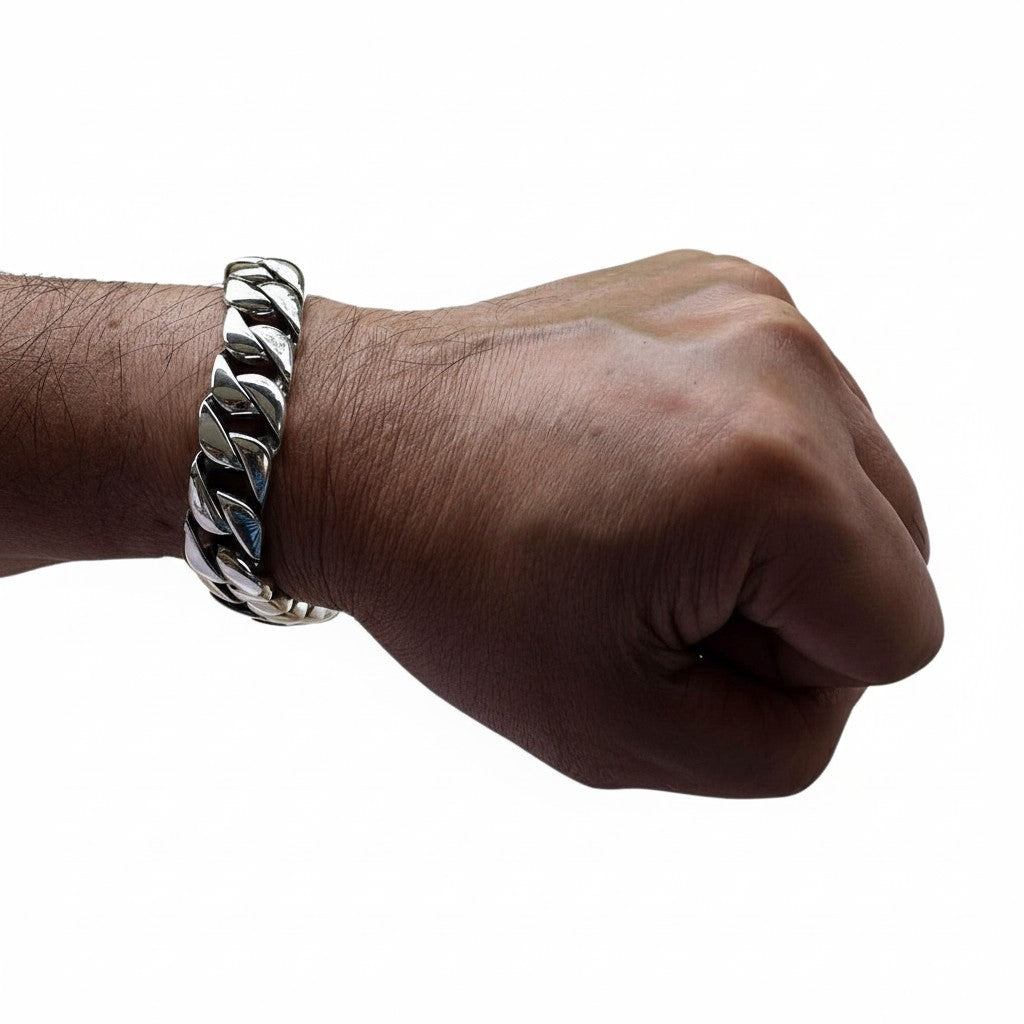 Command attention with the undeniable power of this heavy sterling silver Cuban link bracelet. More than just an accessory, this is an iconic statement piece, a symbol of confidence and timeless masculine style. Meticulously crafted for those who appreciate superior weight and uncompromising quality, its bold presence is felt the moment you lock the secure clasp.