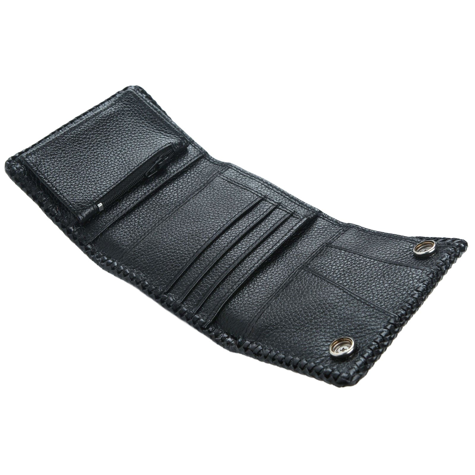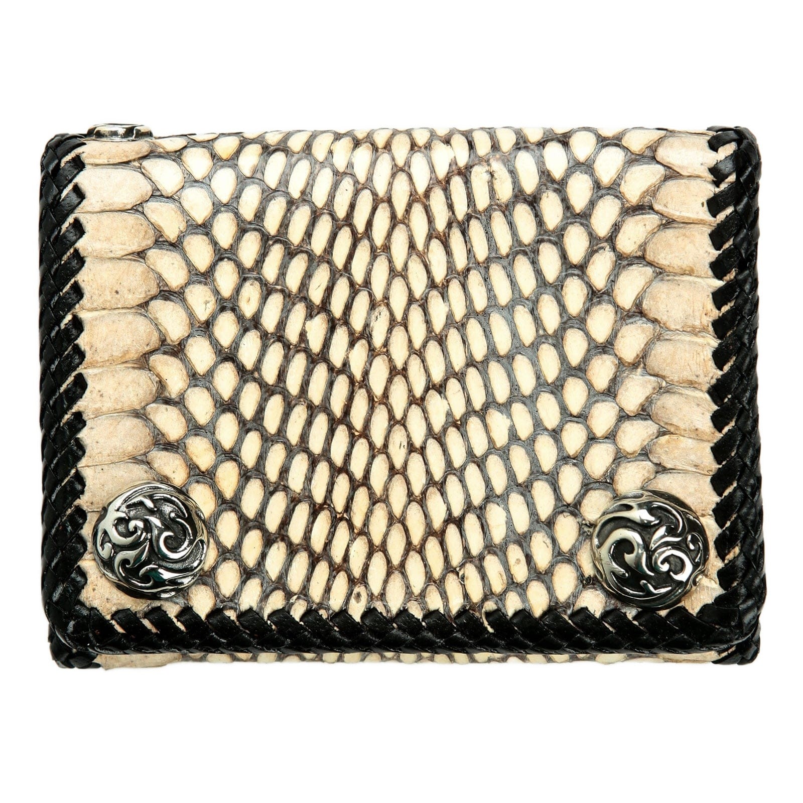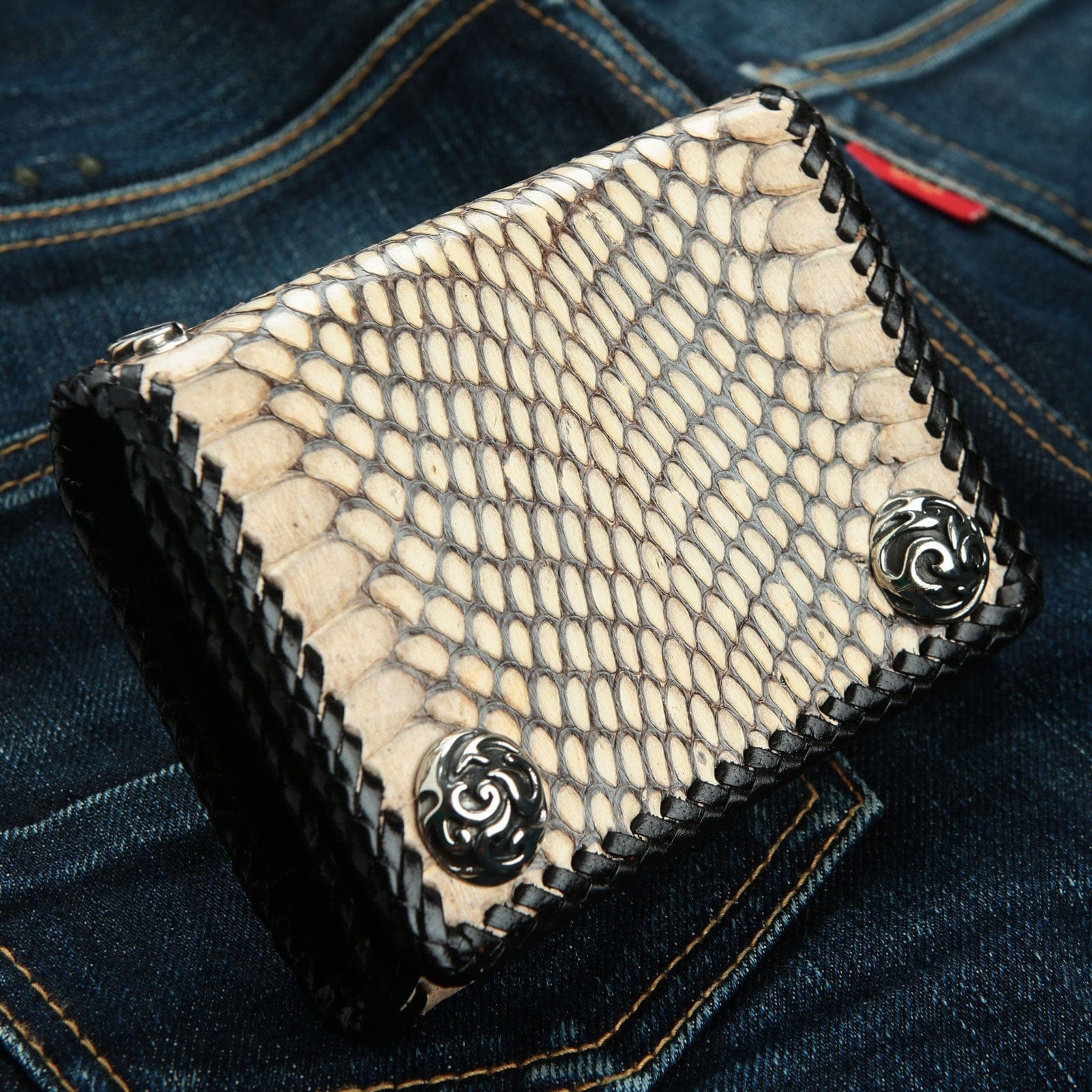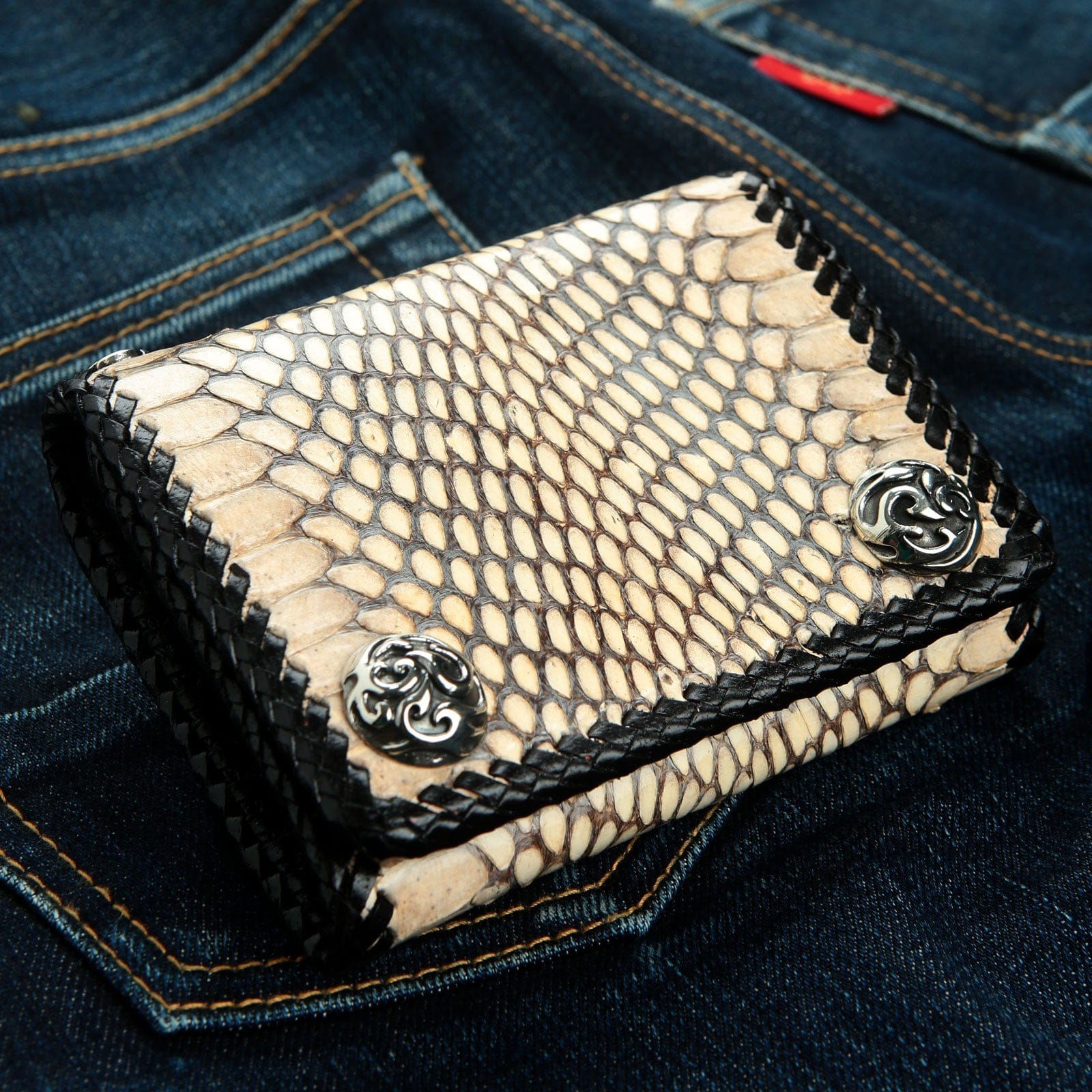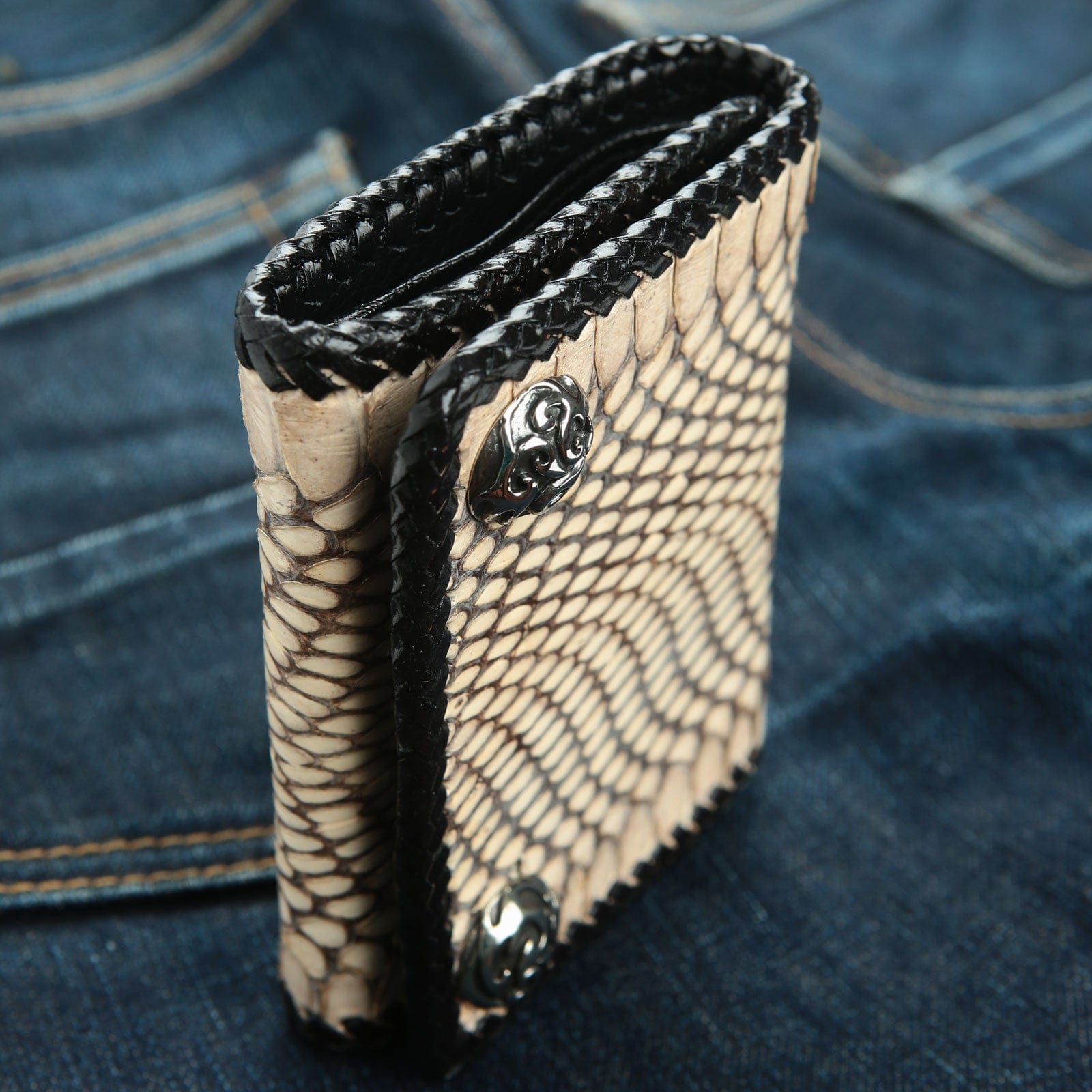 (Body of the Content) The star of the show is the genuine snake skin exterior, offering a unique pattern and durability that only real exotic leather can provide. The wallet is framed by meticulous hand-stitched braided black leather trim, adding strength and a classic biker aesthetic.