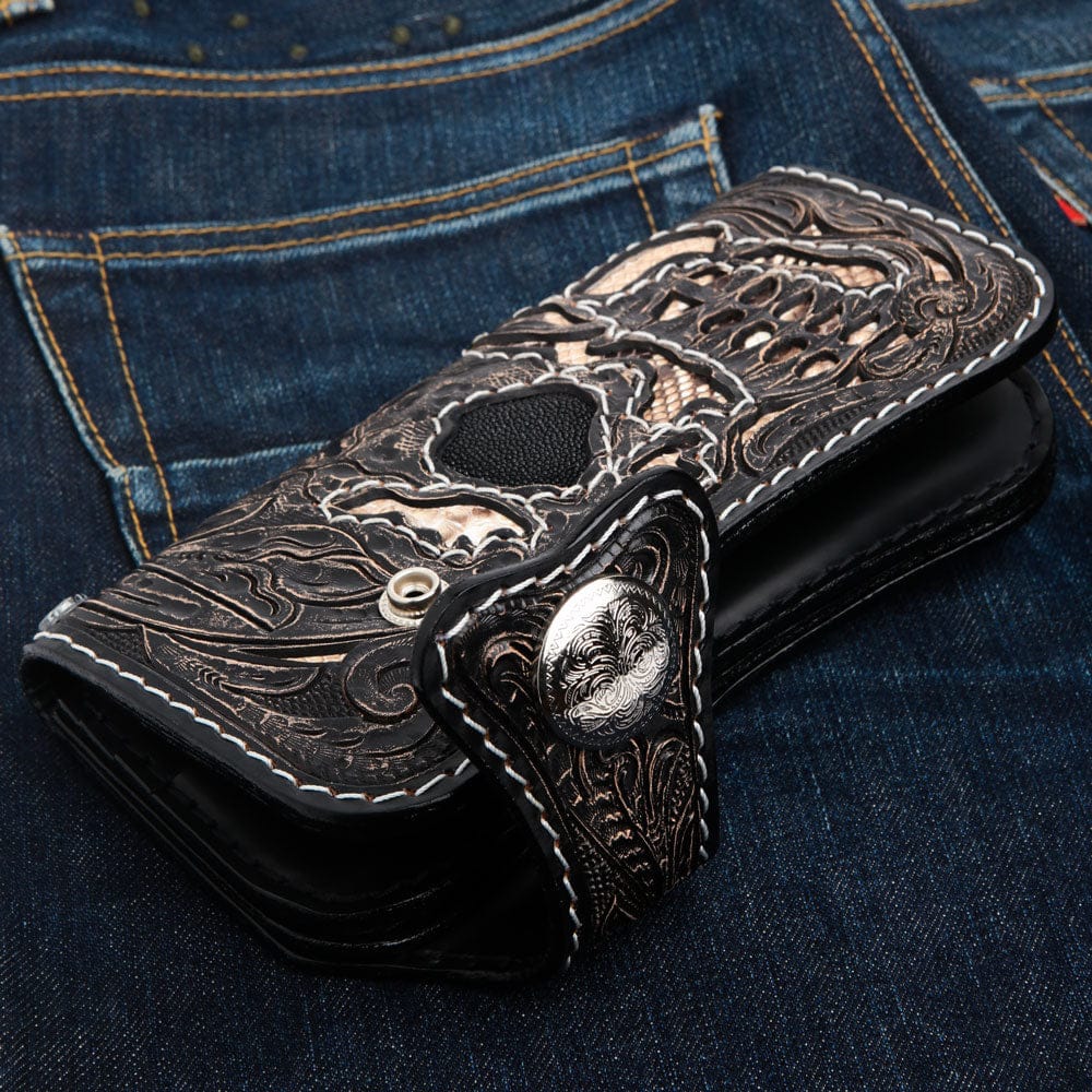 This tooled leather wallet is built for a lifetime on the road. The spacious interior offers incredible organization, and a solid sterling silver grommet makes it the perfect long biker wallet, ready to be secured with a chain. As the crown jewel of our Biker Wallet collection, this wallet is the pinnacle of custom, road-ready gear.