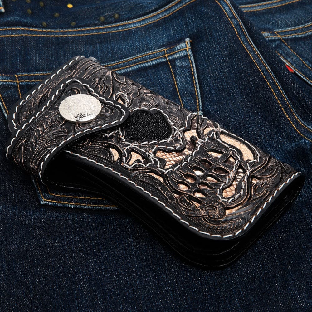 Q: What makes this devil skull biker wallet so unique? A: The uniqueness of this devil skull biker wallet comes from its complex, multi-leather construction. It masterfully combines hand-tooled cowhide with genuine stingray and snakeskin inlays to create a three-dimensional, multi-textured piece of art that you simply won't find anywhere else.