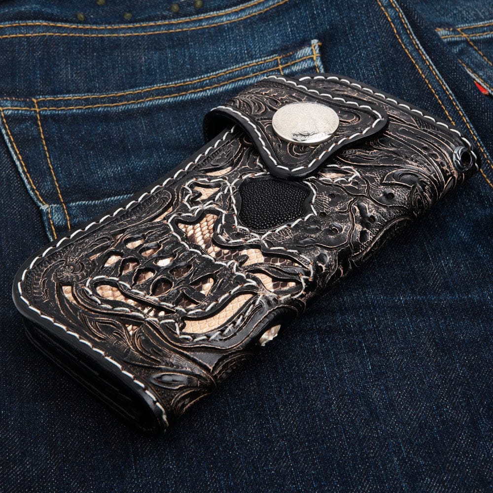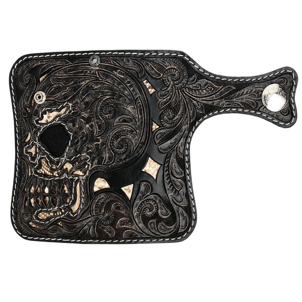 Hand-Tooled Leather Devil Skull Biker Wallet with Stingray & Snake Inlay