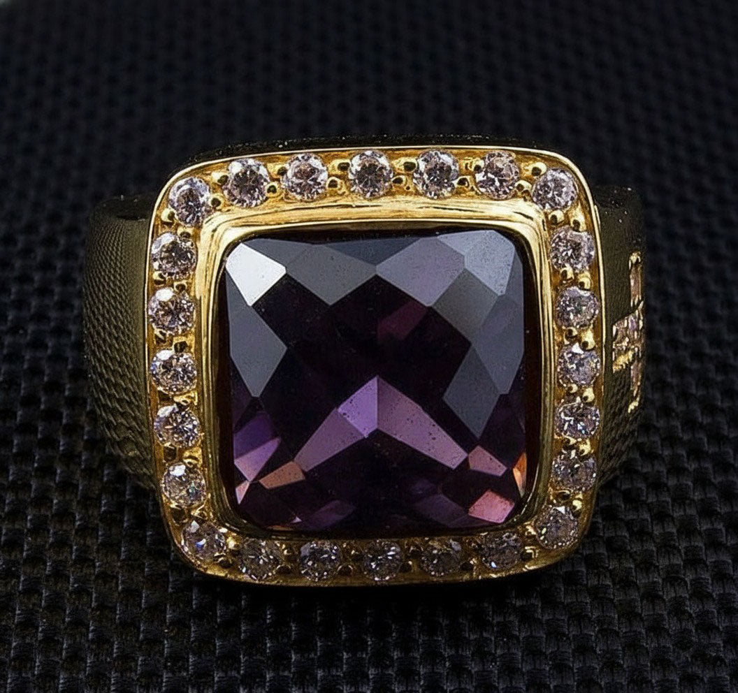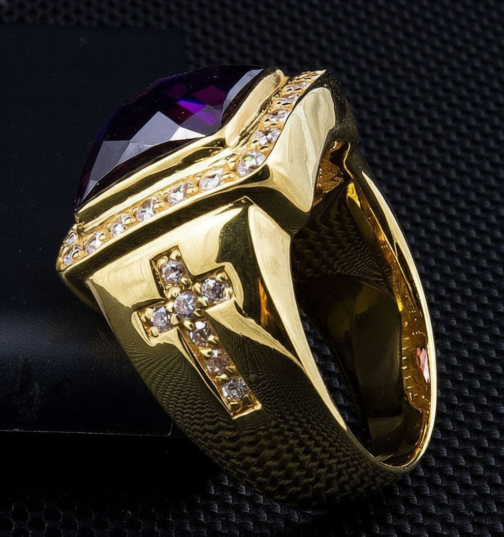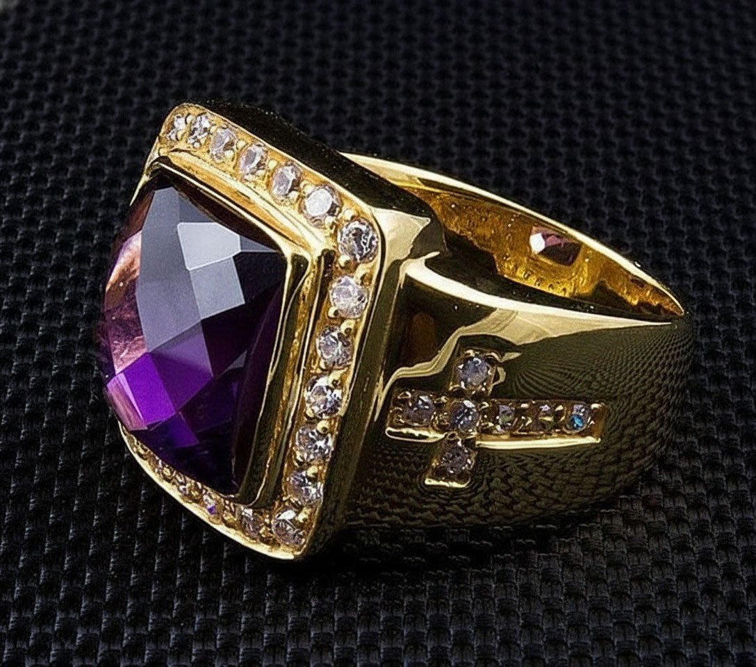 Declare your devotion with unparalleled style in our monumental Men's Cross Bishop Ring. This is more than a piece of religious jewelry; it's a profound symbol of faith and spiritual authority, captured in a design that is both opulent and deeply meaningful. With its massive 30-gram weight and brilliant amethyst, this ring carries a tangible presence.