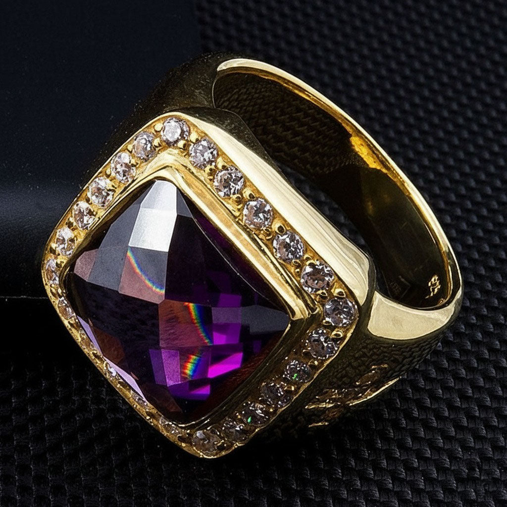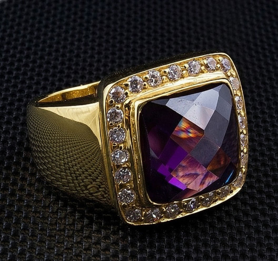 💎 Majestic Amethyst: A large, square-cut natural purple amethyst, delivering a bold statement with its royal color and brilliant facets.