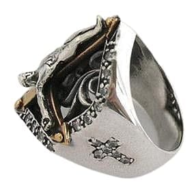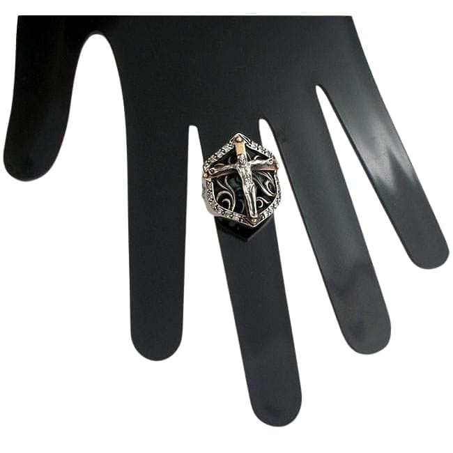 A gothic-style crucifix shield ring for men, featuring openwork scrollwork and a two-tone design.