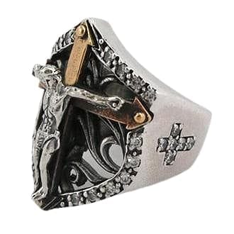 A two-tone Catholic ring featuring the body of Jesus (corpus) on a golden cross.