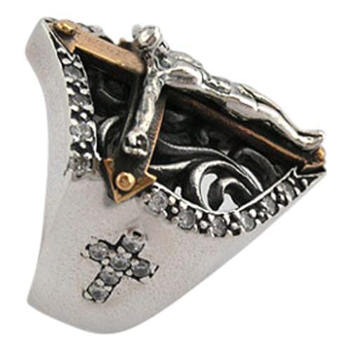 A men's sterling silver crucifix ring with a gold-plated cross and a shield-shaped border of CZ stones.