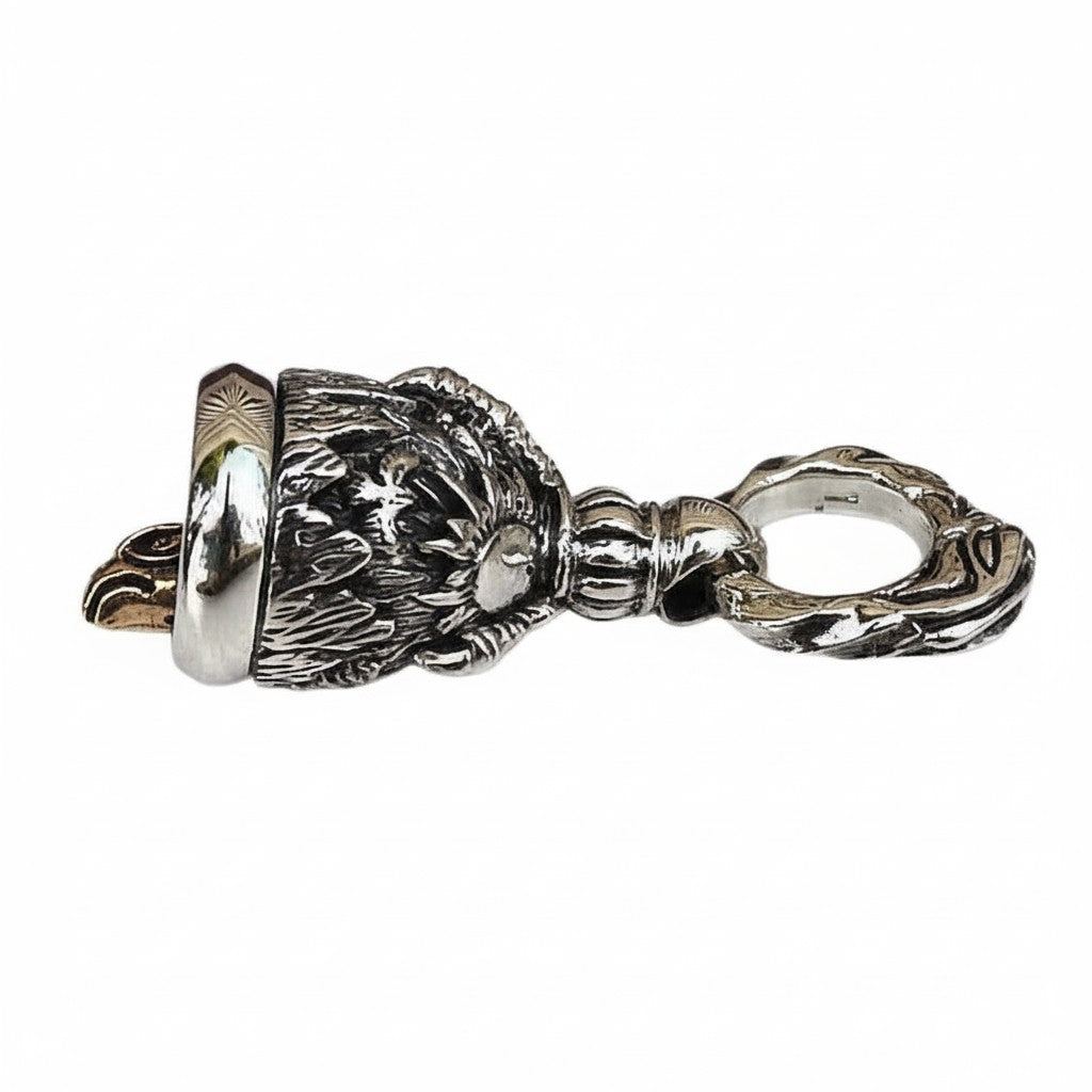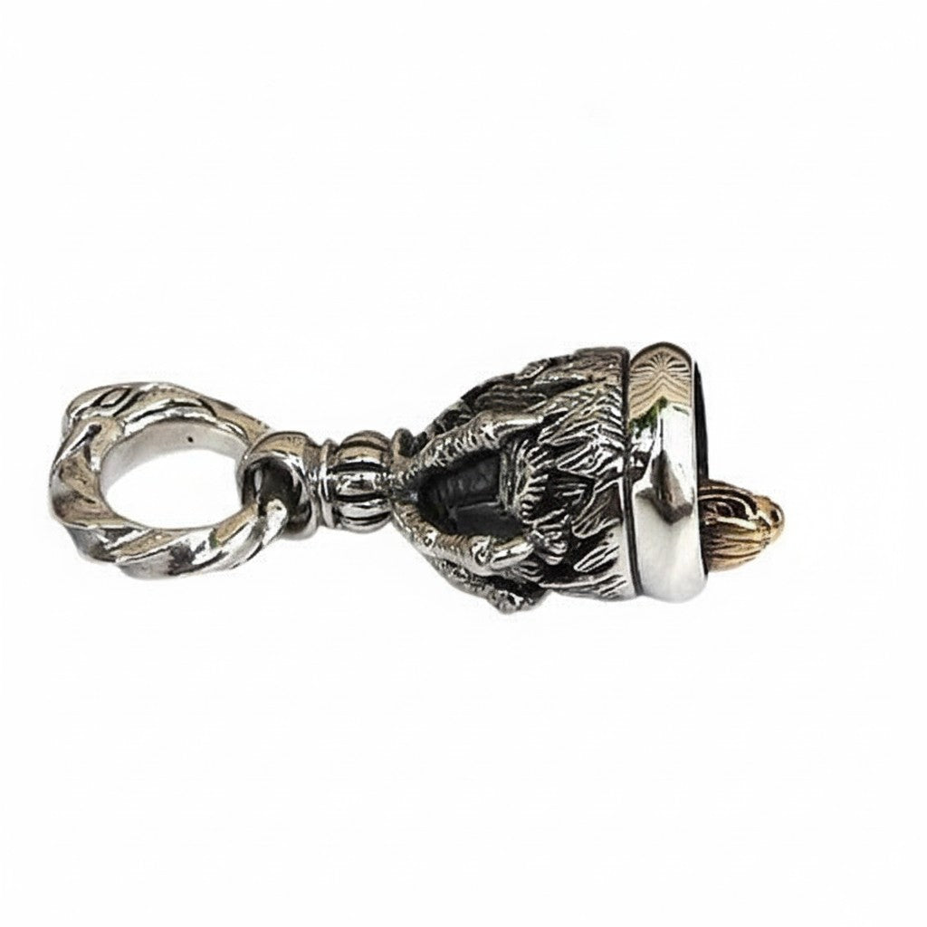 This pendant is a masterpiece of sculpture. The bell is powerfully clutched by a large, detailed eagle claw. The surface of the bell itself is intricately carved with a Native American-inspired design, featuring a soaring eagle and a radiant sun, symbols of power and spiritual vision. Inside, a tiny brass eagle head clapper creates a clear, sharp ring. The entire piece is handcrafted from a massive 25 grams of solid .925 sterling silver, with a polished and oxidized finish for incredible detail. Find more talismans in our Guardian Bells collection.