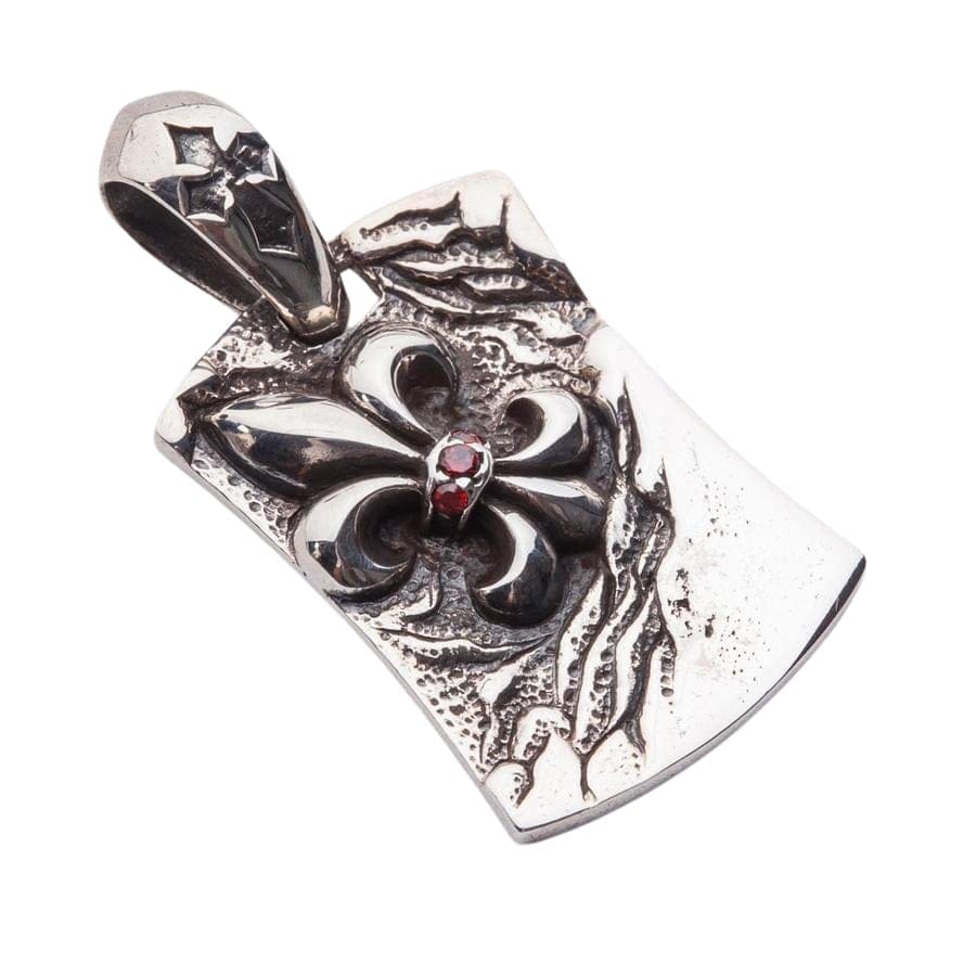 The texture of the silver mimics the look of ancient stone or beaten metal, providing a striking contrast to the smooth, polished curves of the lily flower. Embedded at the heart of the symbol are genuine Red Garnet stones. Often called the "Stone of Health" or the "Warrior’s Stone," the garnet adds a sophisticated pop of deep crimson color, symbolizing passion, fire, and courage. The bail itself is not an afterthought; it is engraved with a cross motif, further enhancing the Gothic jewelry appeal and ensuring the pendant sits perfectly on your chain of choice.
