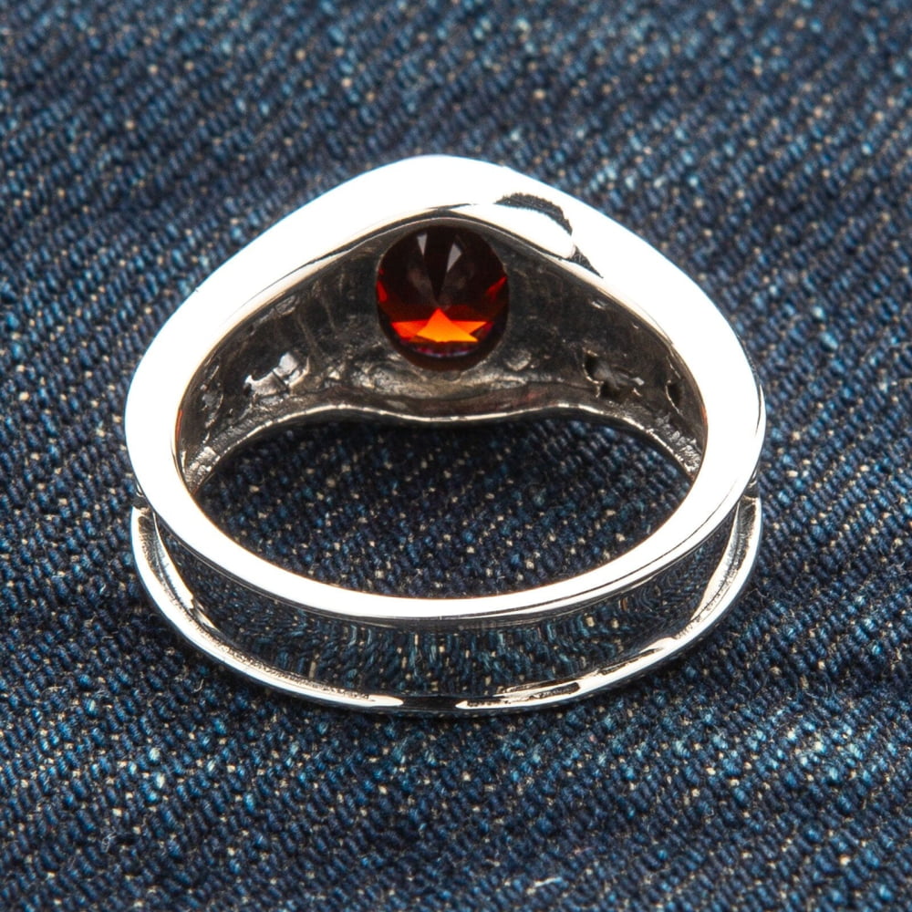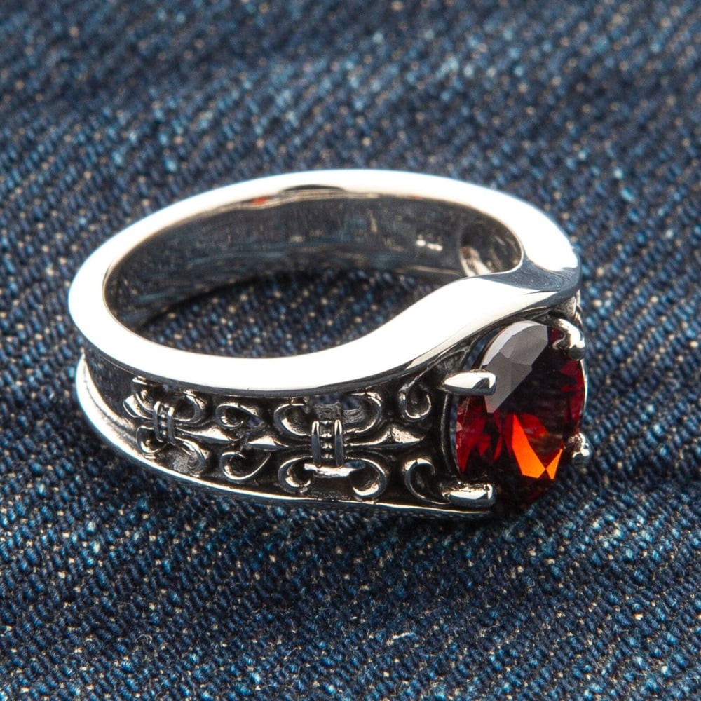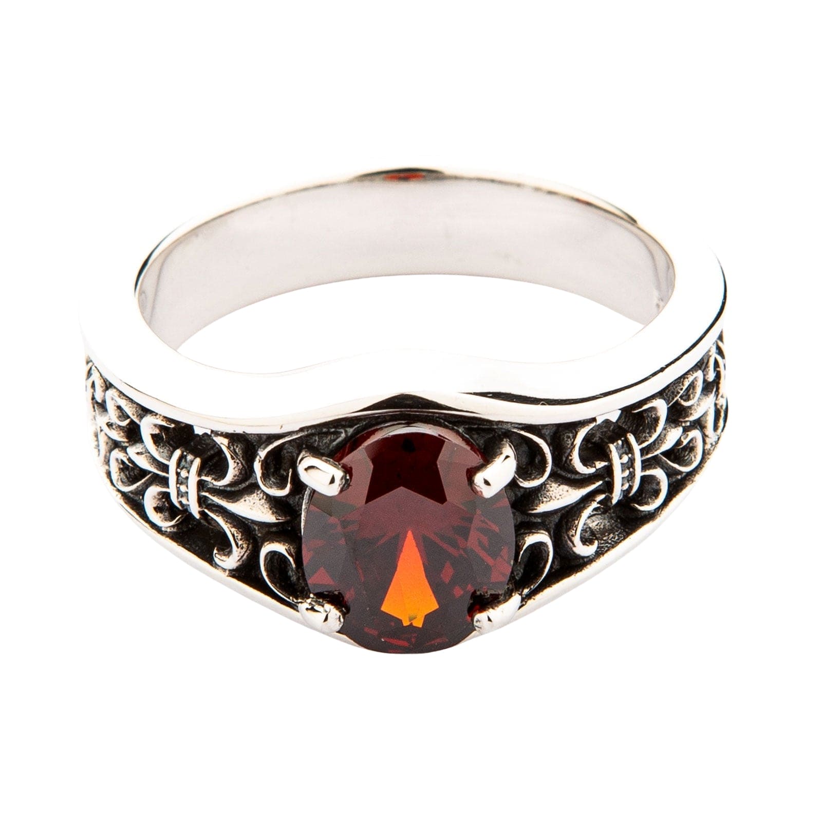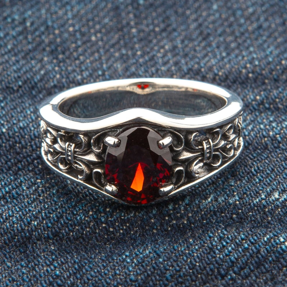At the heart of the design sits a stunning, oval-cut deep red gemstone. This genuine garnet, the traditional January birthstone, is a symbol of passion, commitment, and protection, its fiery color a perfect complement to the cool silver. The entire ring is expertly handcrafted from solid sterling silver, with a skillful oxidized finish that brings out the depth of the gothic scrollwork. Discover more heraldic pieces in our Gothic Rings collection.
