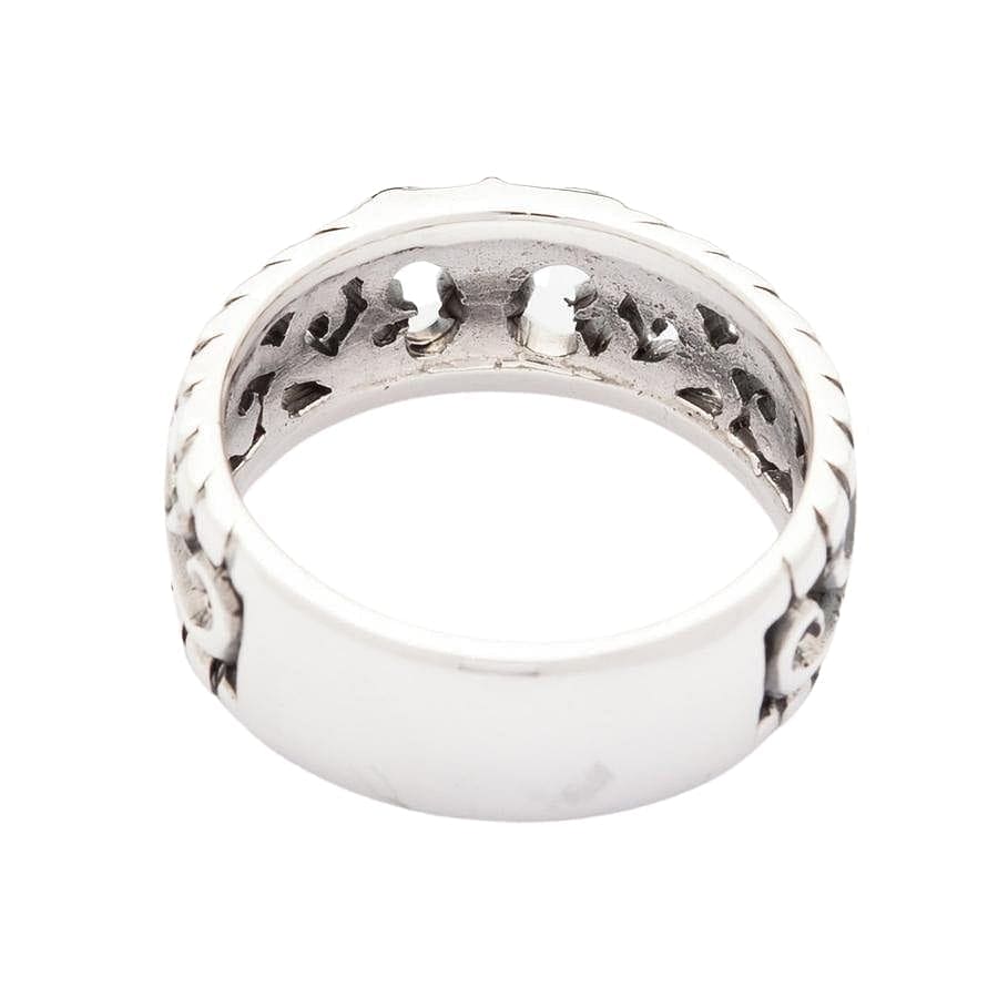 The silver is finished with a high-polish shine on the raised surfaces, while the inner recesses are treated with a dark oxidized finish. This contrast not only highlights the ornate filigree details but also gives the ring a distinct Gothic silver ring aesthetic. With a balanced 10mm width, it offers a substantial presence without being overpowering, making it perfect for daily wear or even as a unique alternative wedding band.