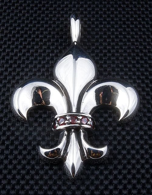 This pendant masterfully captures the iconic silhouette of the Fleur de Lis, a heraldic crest synonymous with French royalty and power for over a thousand years. Its three petals, representing faith, wisdom, and chivalry, are sculpted from solid silver and hand-polished to a flawless, mirror-like shine. Cinching the center of this noble emblem is a brilliant band of deep red, channel-set genuine garnet stones. A gem of passion and protection, the garnets add a vibrant, luxurious contrast, elevating the entire piece. With its substantial weight and bold dimensions, this pendant is a powerful statement of enduring strength and honor.