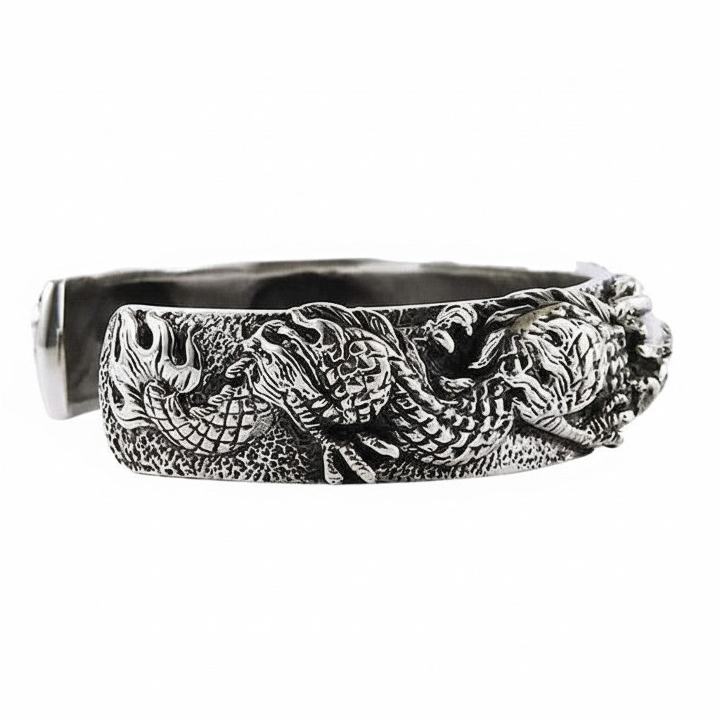 This is a truly heavy silver cuff bracelet, weighing an incredible 85 grams. Its substantial weight is a constant reminder of its solid silver construction and the potent symbolism it carries. Our master artisans use a stunning combination of high-polish finishes and dark, oxidized recesses to bring every scale and whisker to life. The open cuff design allows for a comfortable, adjustable fit, making this powerful men's dragon bracelet both a work of art and a piece of formidable armor for your wrist.