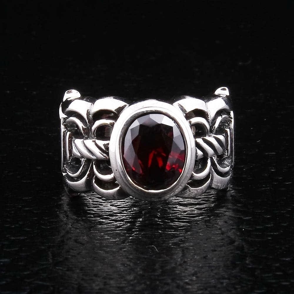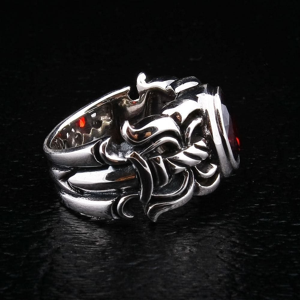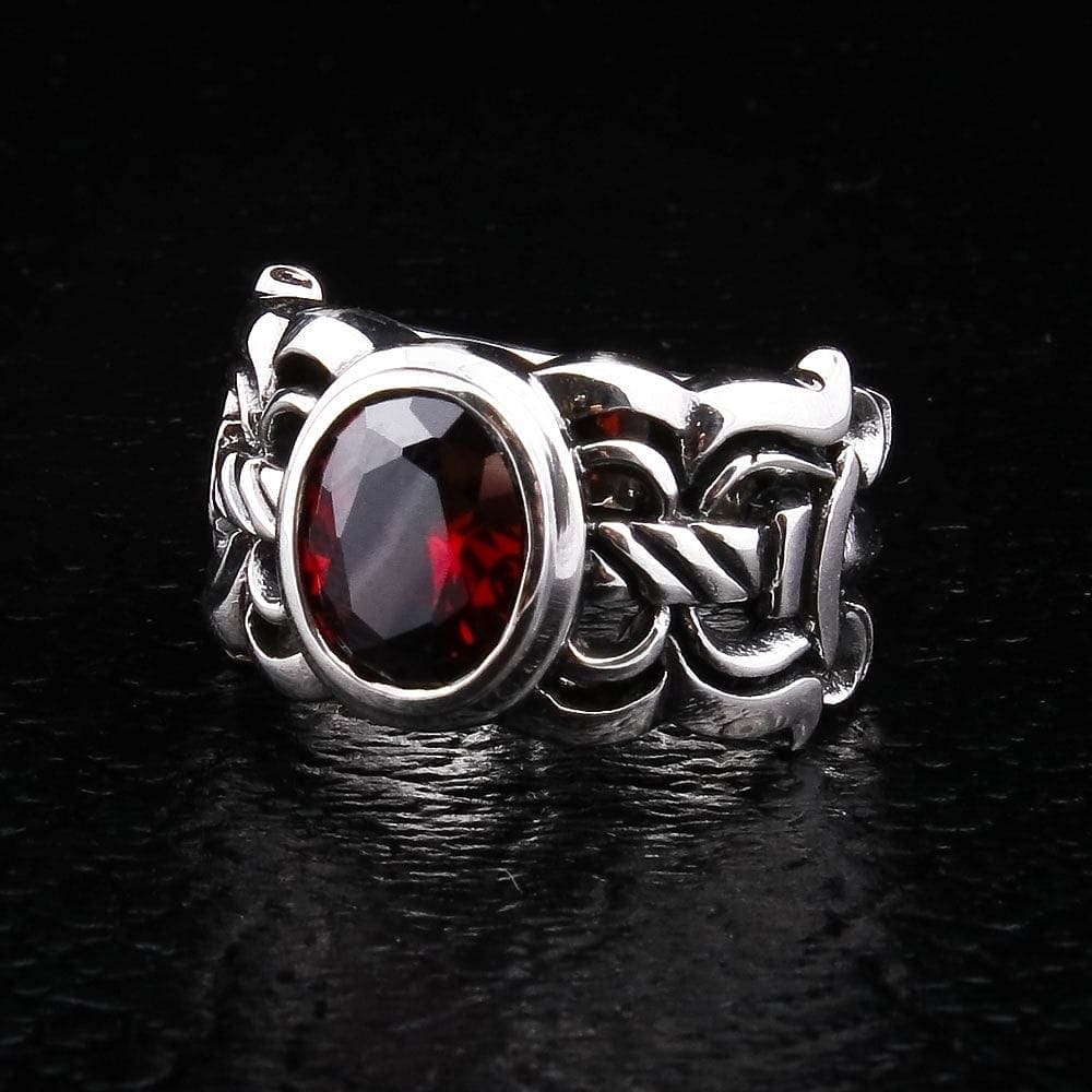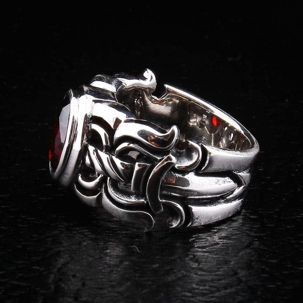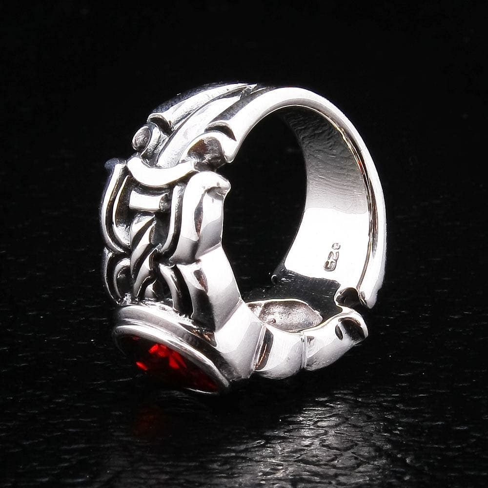 1. What does a sword ring with a red stone symbolize? This design is rich with warrior symbolism. The sword hilt band represents strength, justice, and the code of chivalry. The red garnet stone was historically known as the "warrior's stone," symbolizing protection, courage, and passion. Together, they create a powerful talisman of a noble warrior.