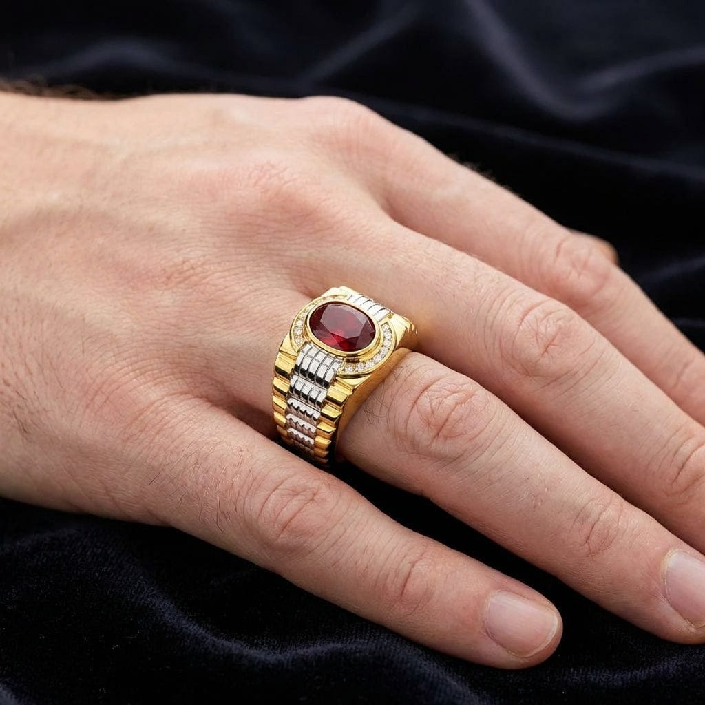 Close-up of a man's hand wearing a luxury two-tone gold Rolex-inspired ring featuring a large oval red garnet center stone and diamond halo, resting against a dark velvet background.