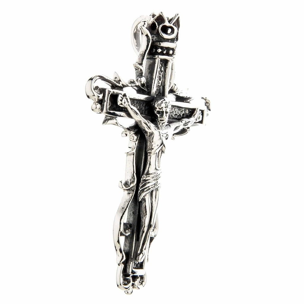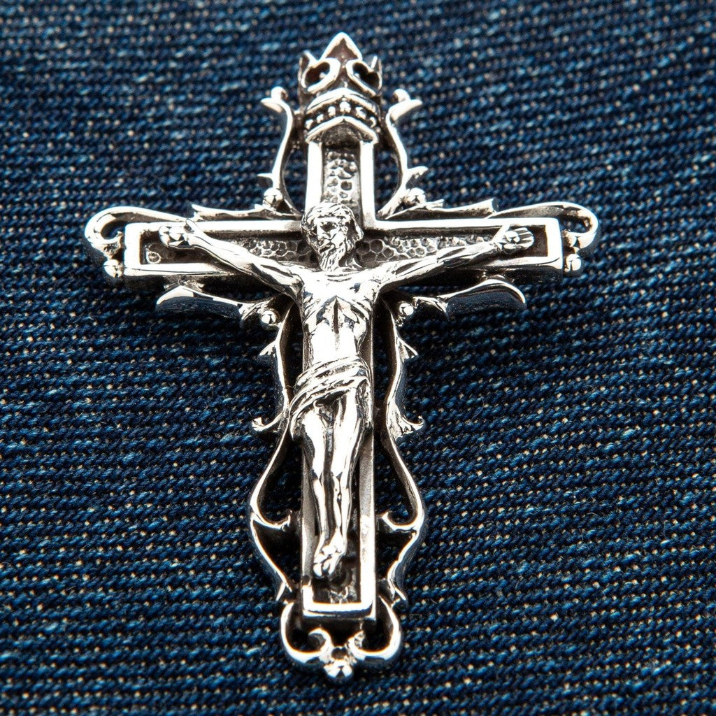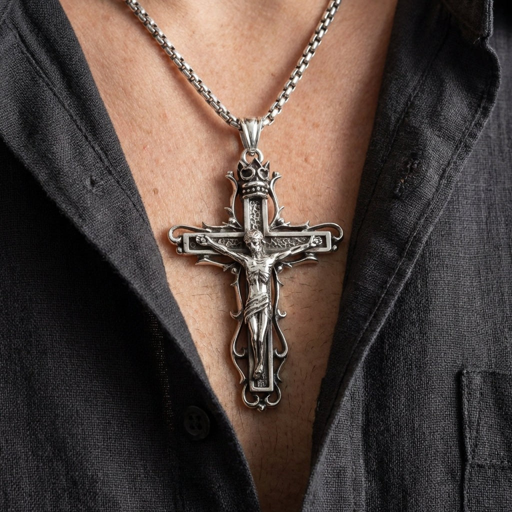 The term "gothic" here refers to the artistic style, not a subculture. This gothic crucifix pendant draws directly from the Gothic art period of the 12th through 16th centuries — the same era that produced the great European cathedrals. You can see it in the ornate scrollwork, the dramatic thorny vine motifs wrapping the cross, and the crowned top. A standard modern crucifix tends toward clean, minimal lines. This piece embraces the elaborate, narrative-rich detail that defined medieval religious art. It tells a story: suffering (the thorns), sacrifice (the corpus), and triumph (the crown).