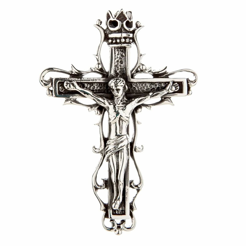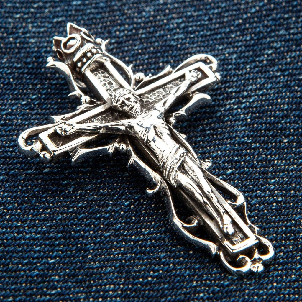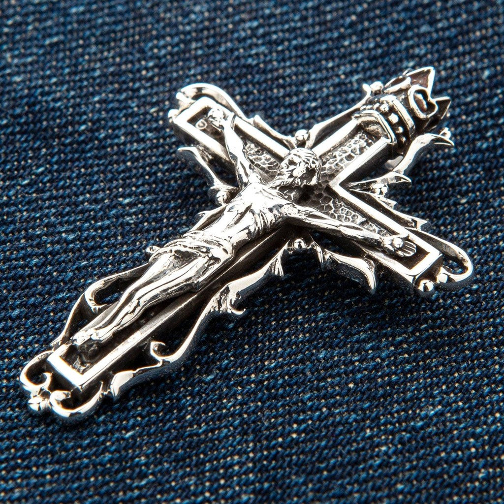 The term "gothic" here refers to the artistic style, not a subculture. This gothic crucifix pendant draws directly from the Gothic art period of the 12th through 16th centuries — the same era that produced the great European cathedrals. You can see it in the ornate scrollwork, the dramatic thorny vine motifs wrapping the cross, and the crowned top. A standard modern crucifix tends toward clean, minimal lines. This piece embraces the elaborate, narrative-rich detail that defined medieval religious art. It tells a story: suffering (the thorns), sacrifice (the corpus), and triumph (the crown).