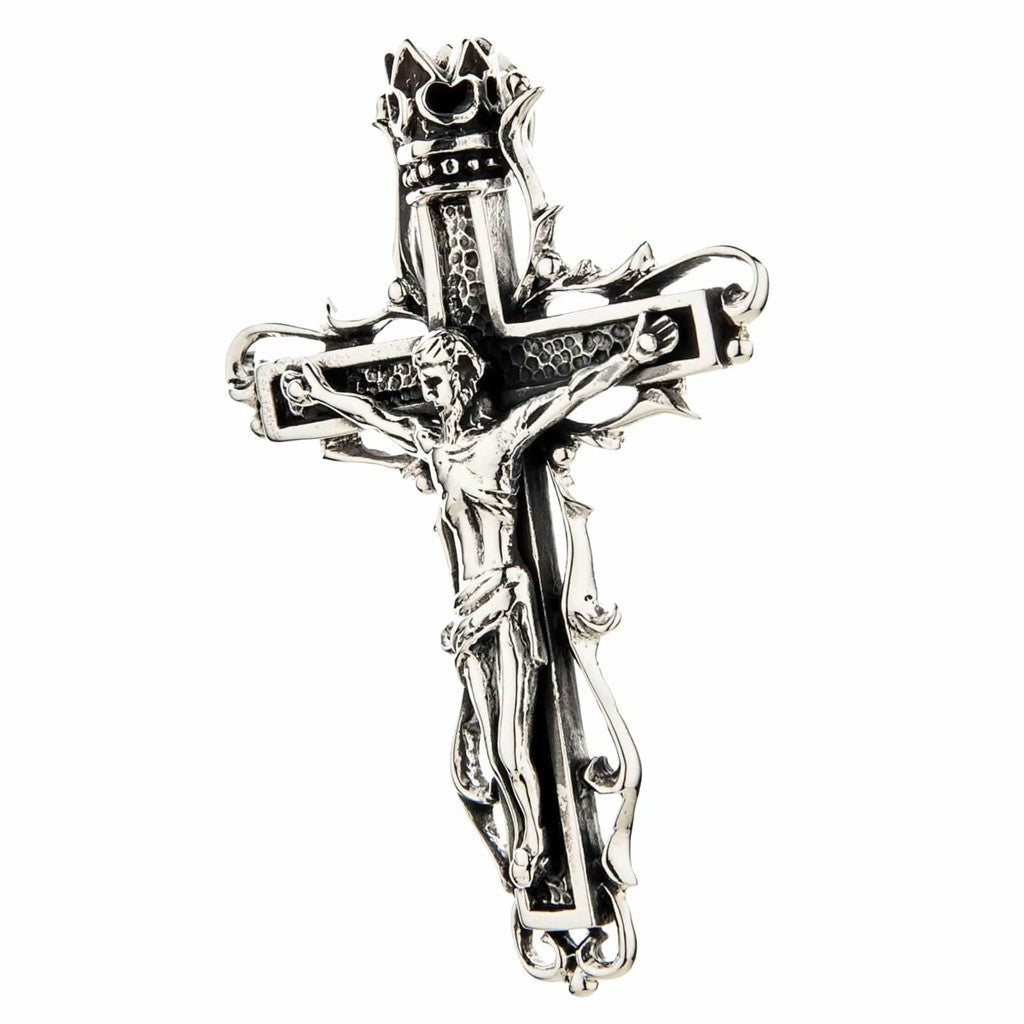 Front view of handcrafted 925 sterling silver gothic crucifix pendant with Jesus corpus and royal crown