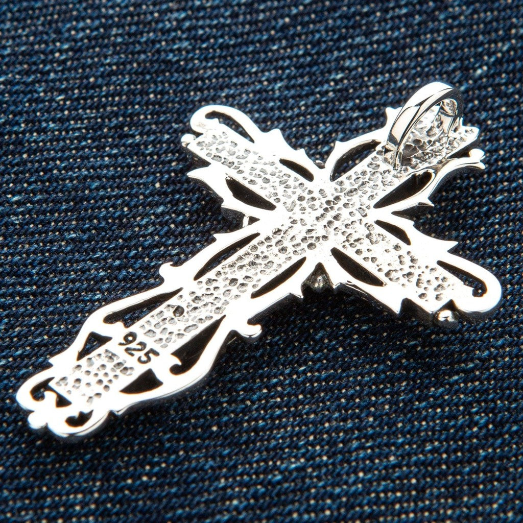 If you are drawn to the artistry of the Gothic period — the soaring arches, the gargoyles, the intricate stone carvings of Chartres or Notre-Dame — then this pendant speaks your language fluently. The design vocabulary is unmistakably medieval: the ornate scrollwork flanking the cross, the thorny vine motifs that recall illuminated manuscripts, the crown perched at the apex like a finial on a cathedral spire. As a piece of gothic jewelry for men, it pairs naturally with leather, dark fabrics, and silver chains. But it transcends any single aesthetic. Flip it over, and the back reveals a hammered, stippled texture and the clear .925 hallmark stamped into the silver — a small but crucial detail that confirms you are holding genuine sterling silver, not plated base metal. That hallmark is your guarantee of authenticity and longevity.