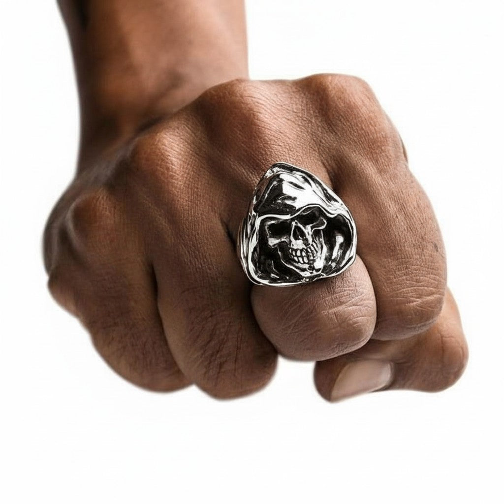 This is not just a ring; it's a confrontation with the inevitable. Our massive grim reaper skull ring is the ultimate emblem of fearlessness, a powerful memento mori for the man who understands that life is finite and meant to be lived to the fullest. Forged from a colossal weight of solid sterling silver, this ring is a tribute to the ultimate collector of souls and a bold statement for a life lived without regret.