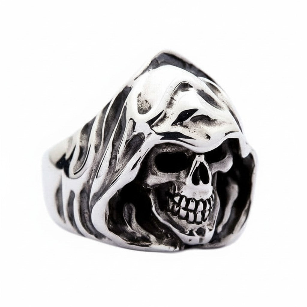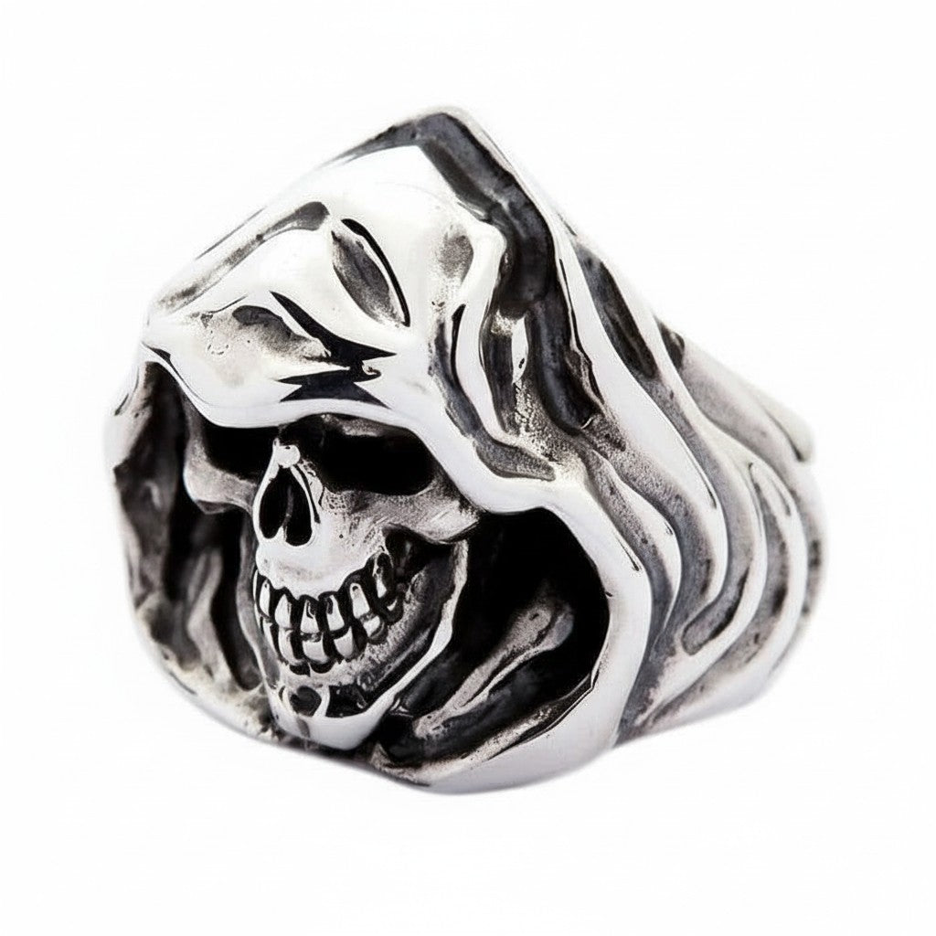 This ring masterfully captures the foreboding presence of the Grim Reaper. A menacing skull, with a sinister grin and hollow eye sockets, peers out from the deep, dark shadows of a flowing shroud. The expert use of a dark oxidized finish within the hood's folds creates a stunning three-dimensional effect, making the polished skull seem to float in the abyss. The craftsmanship is as uncompromising as the Reaper himself. Weighing a colossal 28 grams, this heavyweight ring is forged from solid 925 sterling silver, giving it the powerful, substantial feel of a true artifact. It’s a bold and unapologetic statement of accepting fate and living without fear.