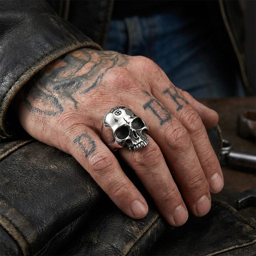 The skull face measures roughly 1 1/8" × 1 1/4". That's big enough to bump your adjacent fingers if you've never worn anything wider than a plain band. After three or four days, you stop noticing. But that first afternoon takes some getting used to.