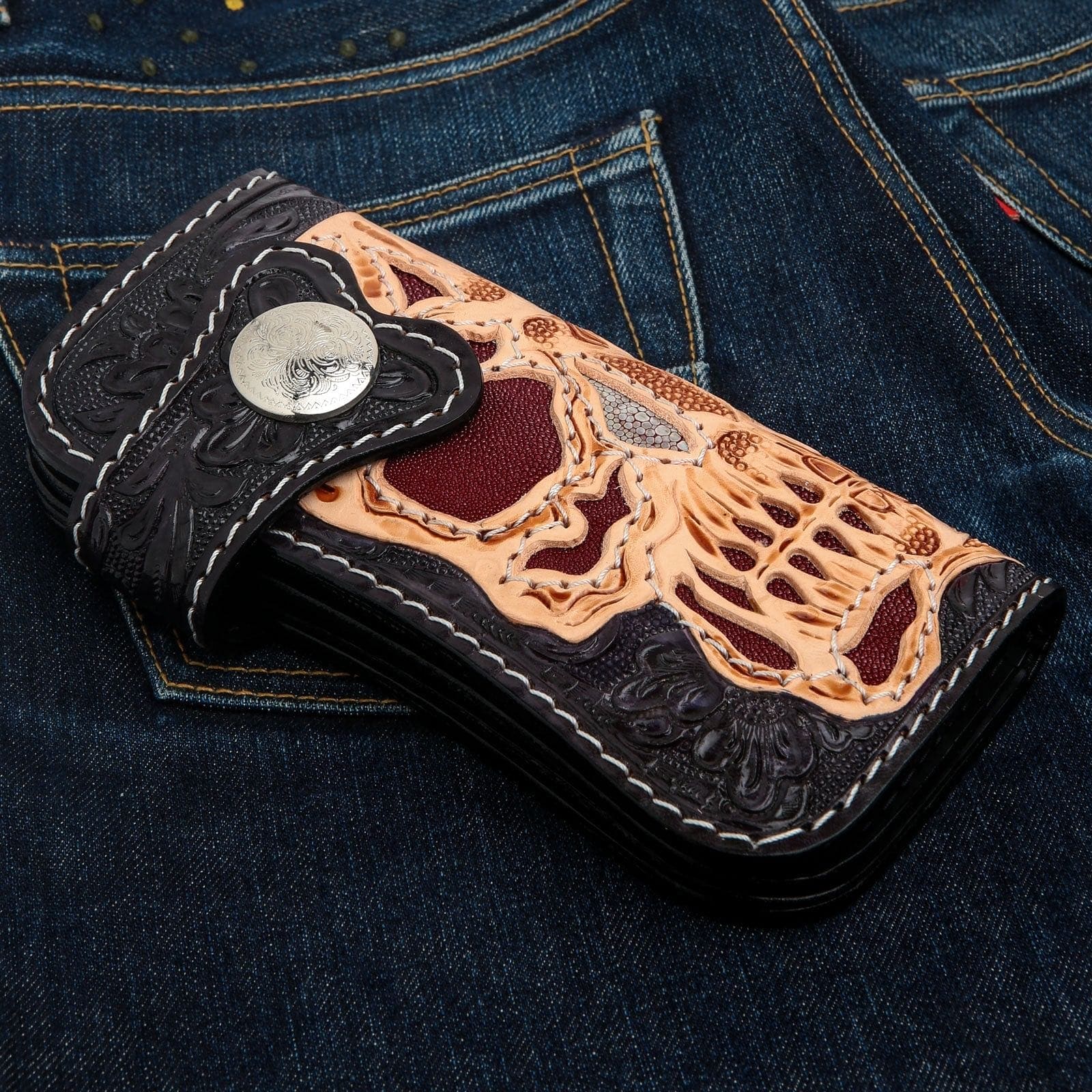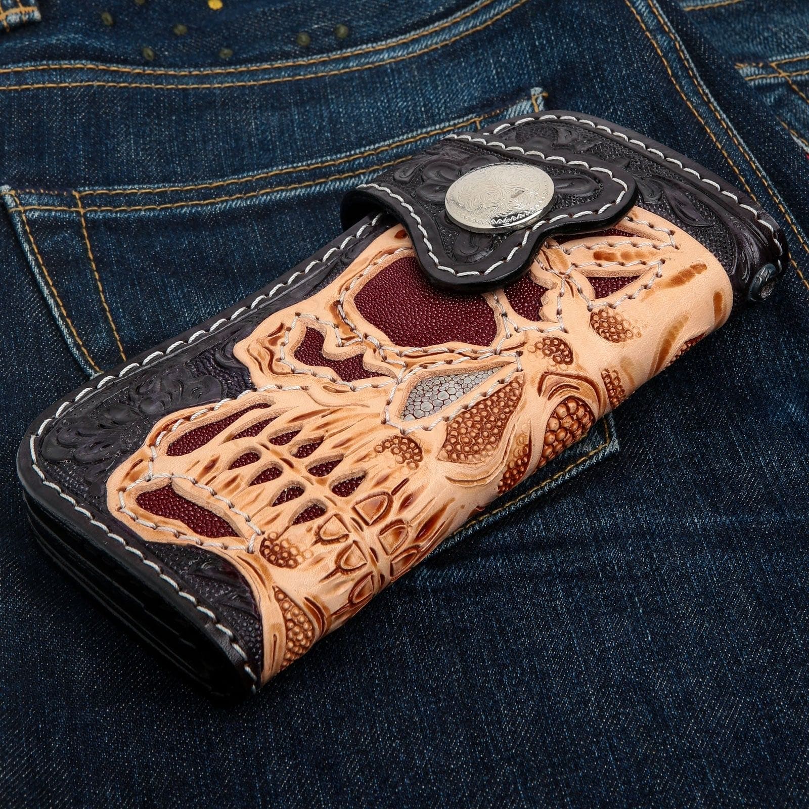 Ideal for motorcycle enthusiasts, biker style fans, or anyone appreciating bold, high-quality leather accessories.