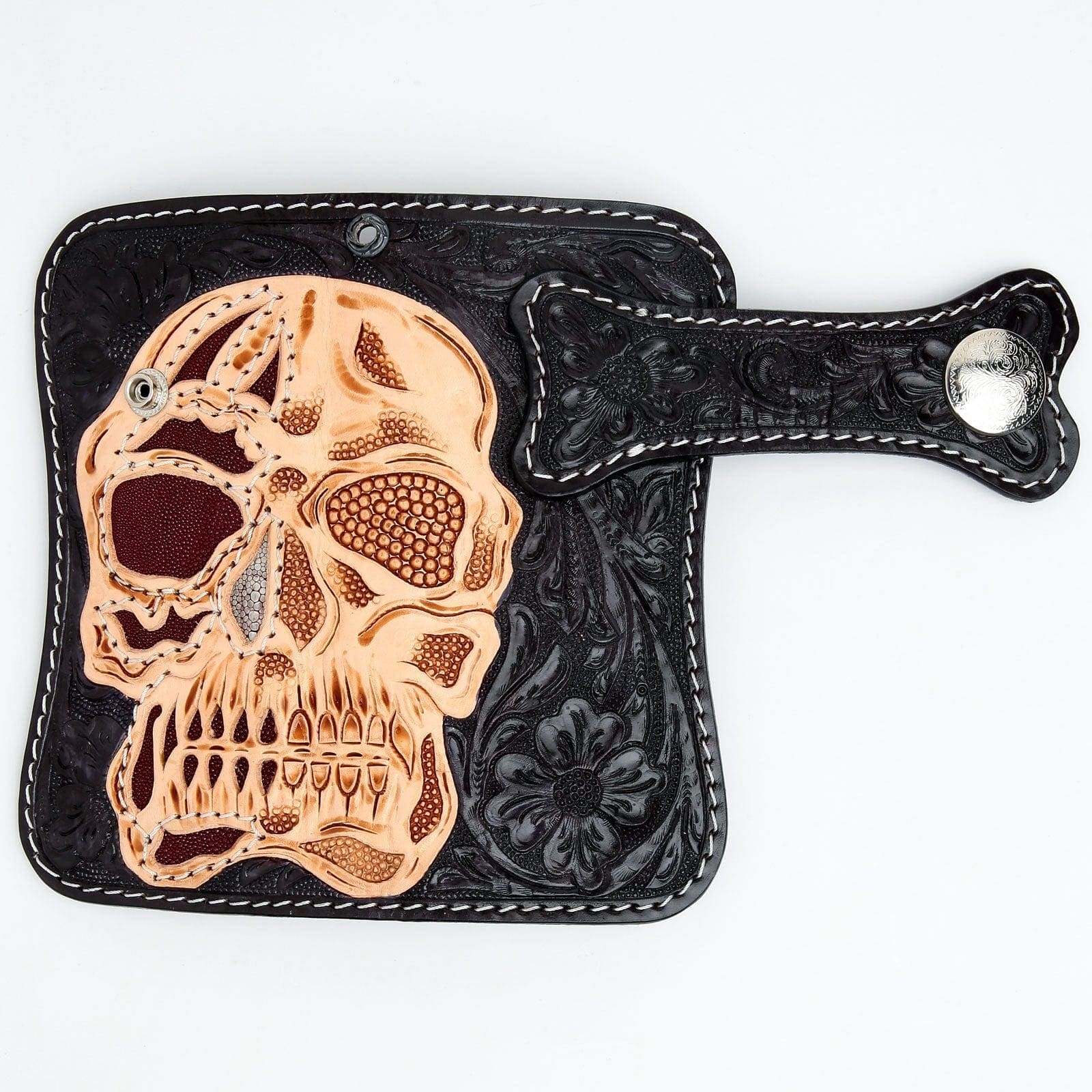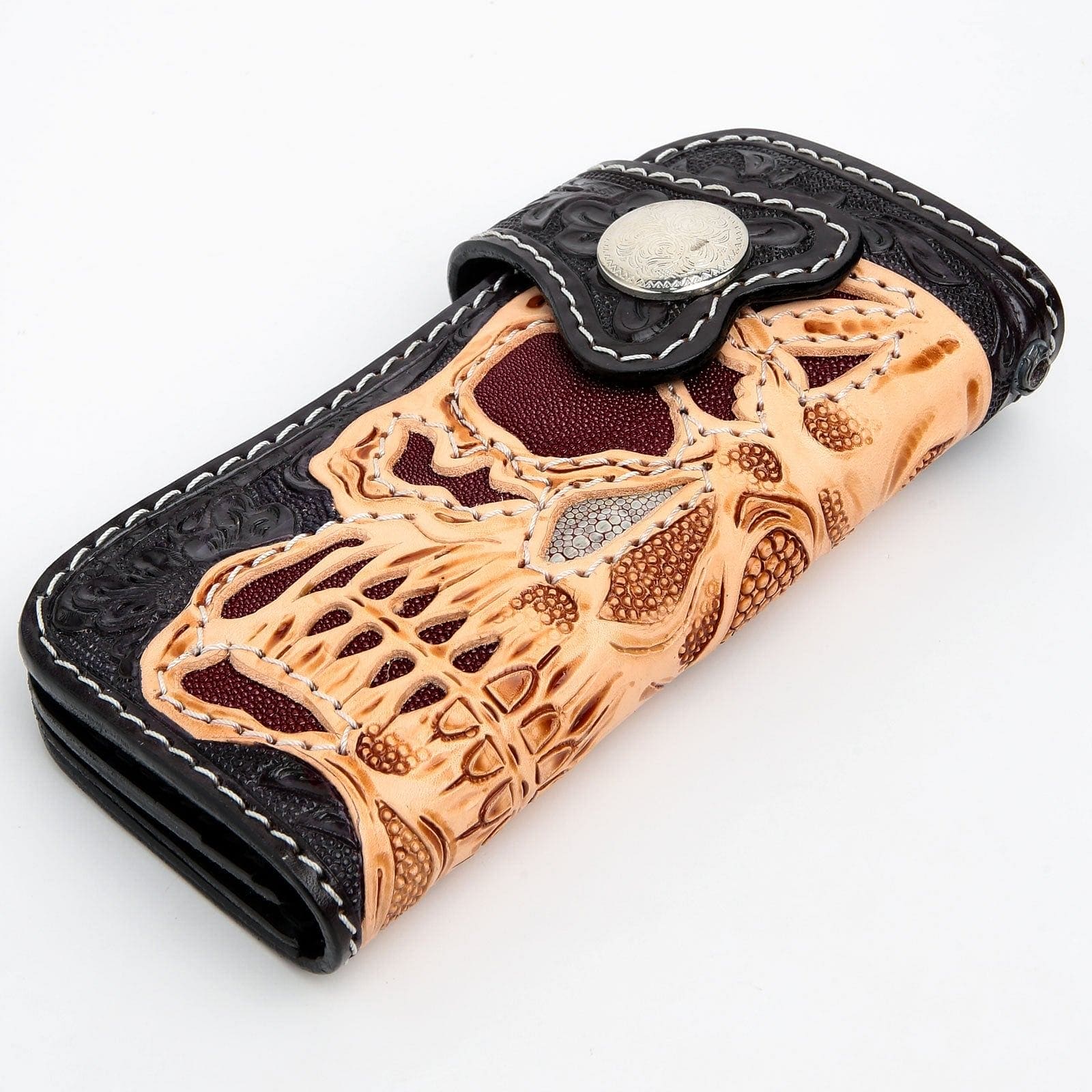 Features an intricate skull design with premium stingray leather accents, ensuring a rugged and striking appearance.