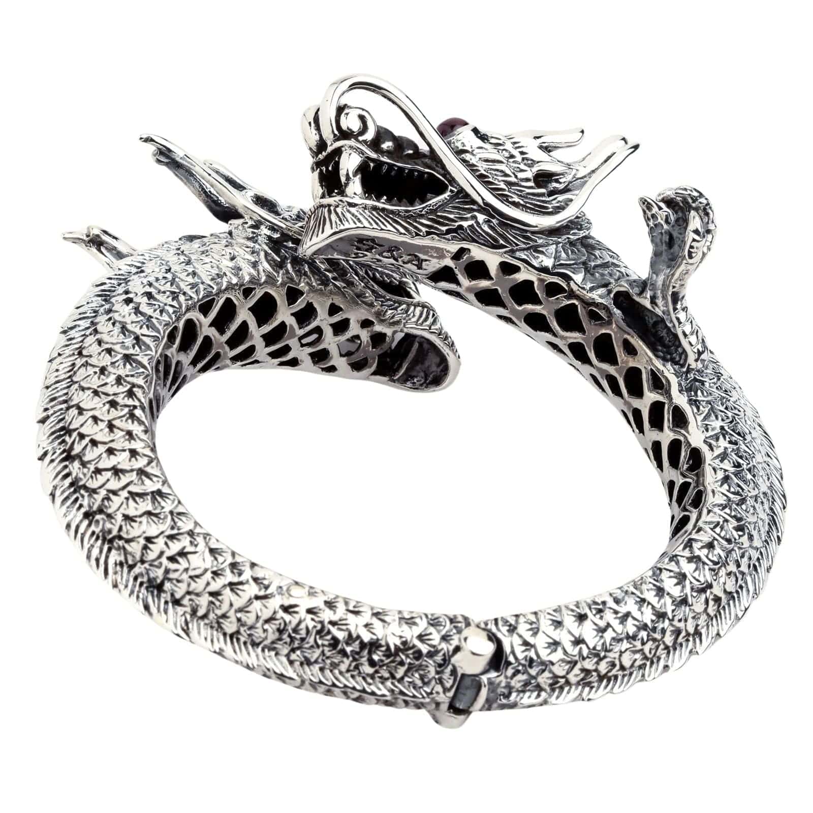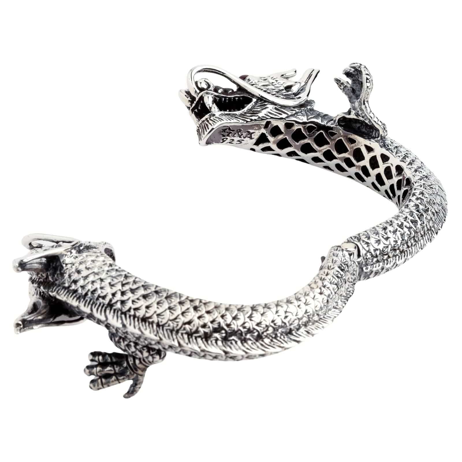 Q: How does the cuff open and close? A: This sterling silver dragon bracelet is not a traditional open cuff; it is a hinged bangle. It features a cleverly integrated and secure hinge mechanism that allows it to open wide for easy placement on the wrist, and then it closes securely with a hidden clasp, ensuring a safe fit for such a substantial piece.