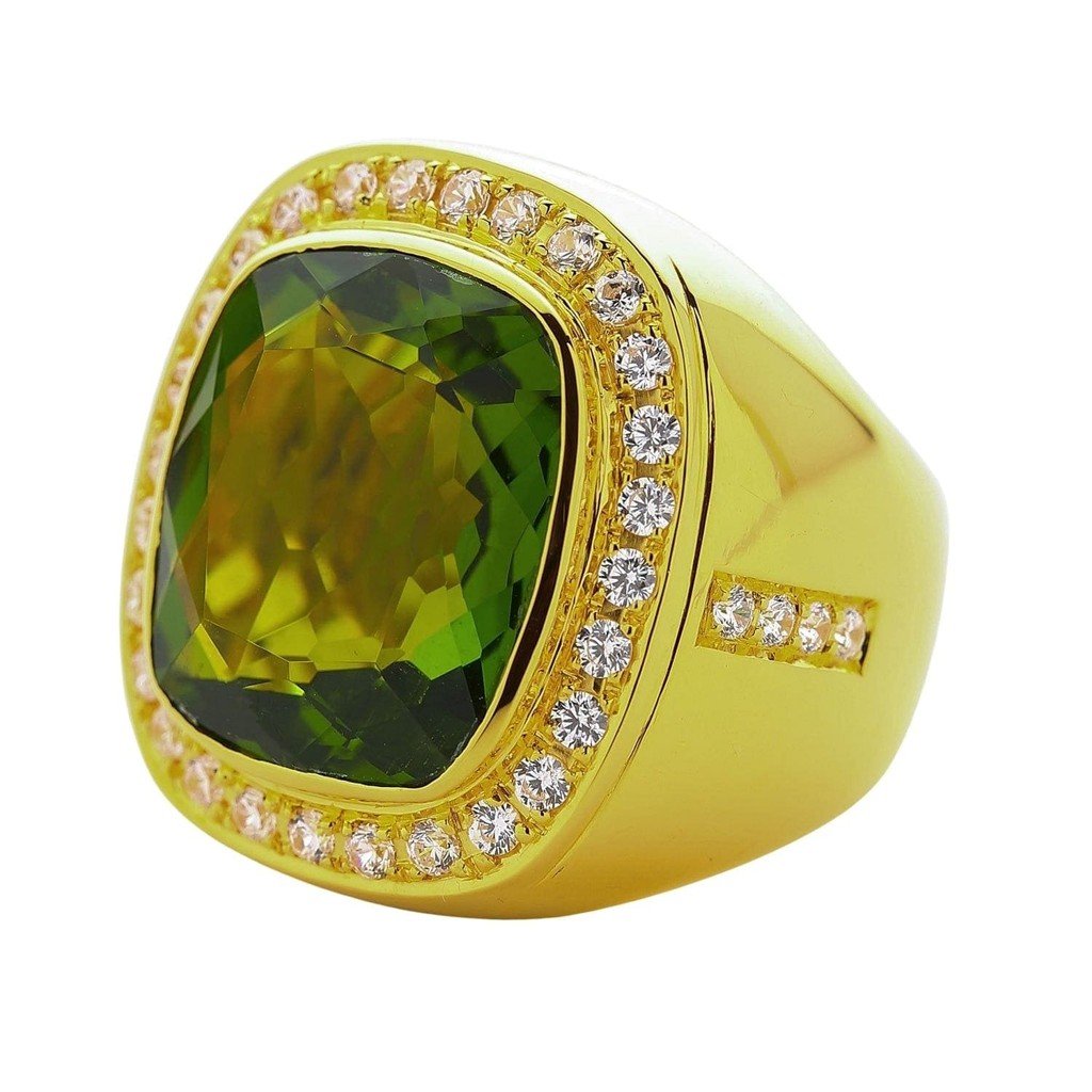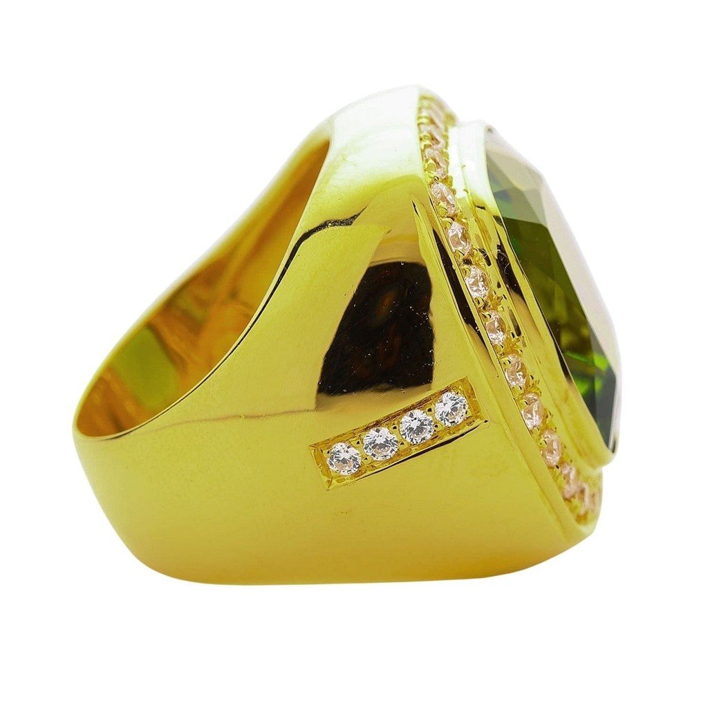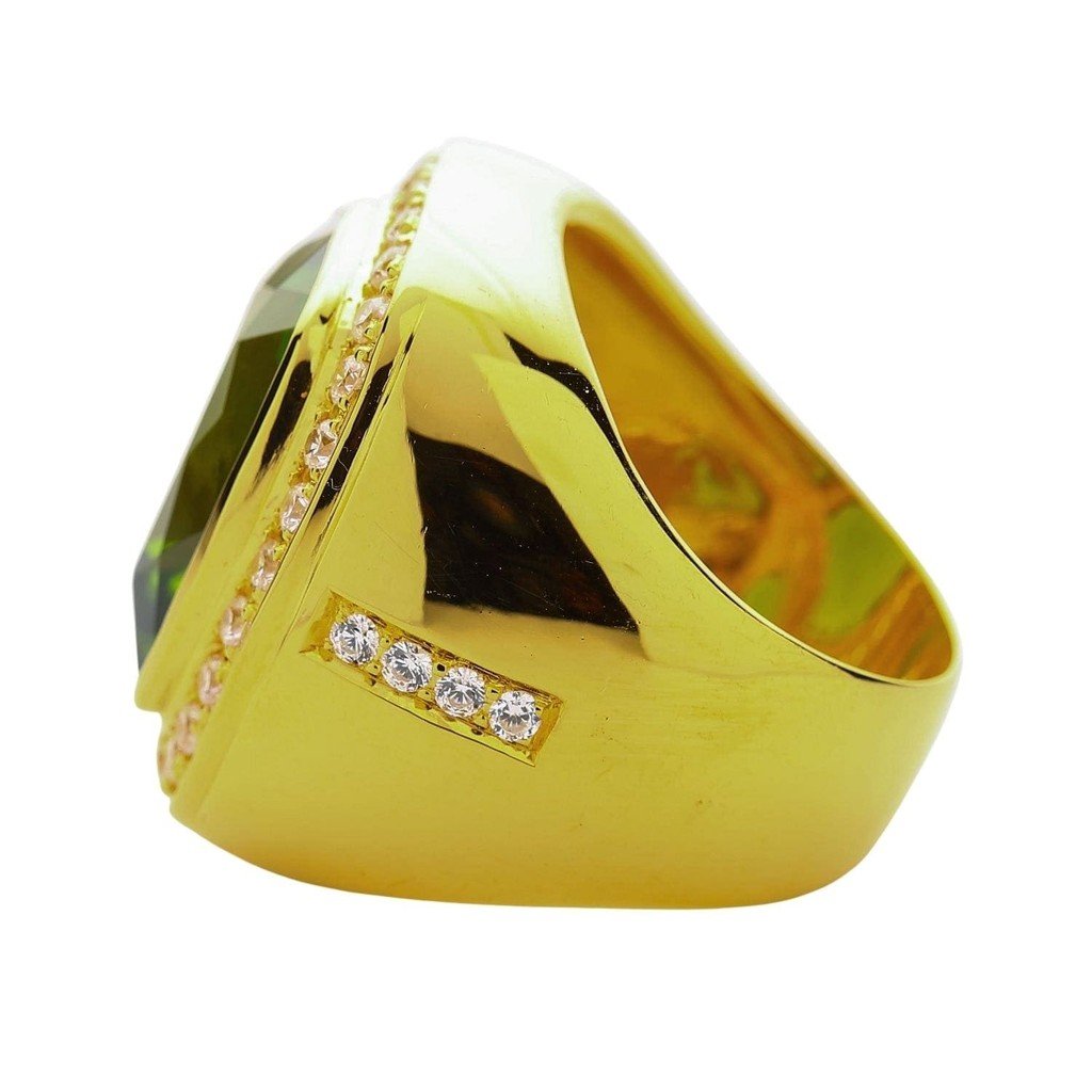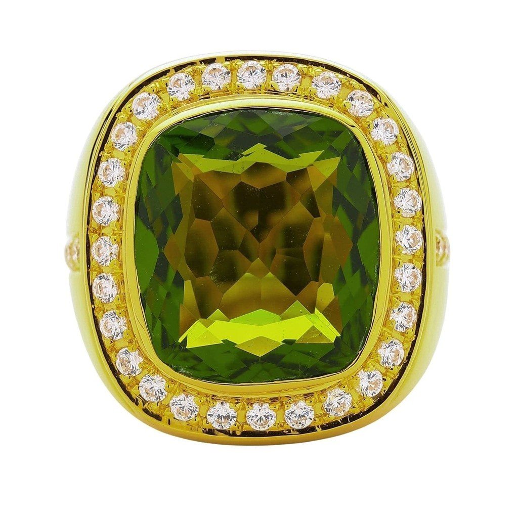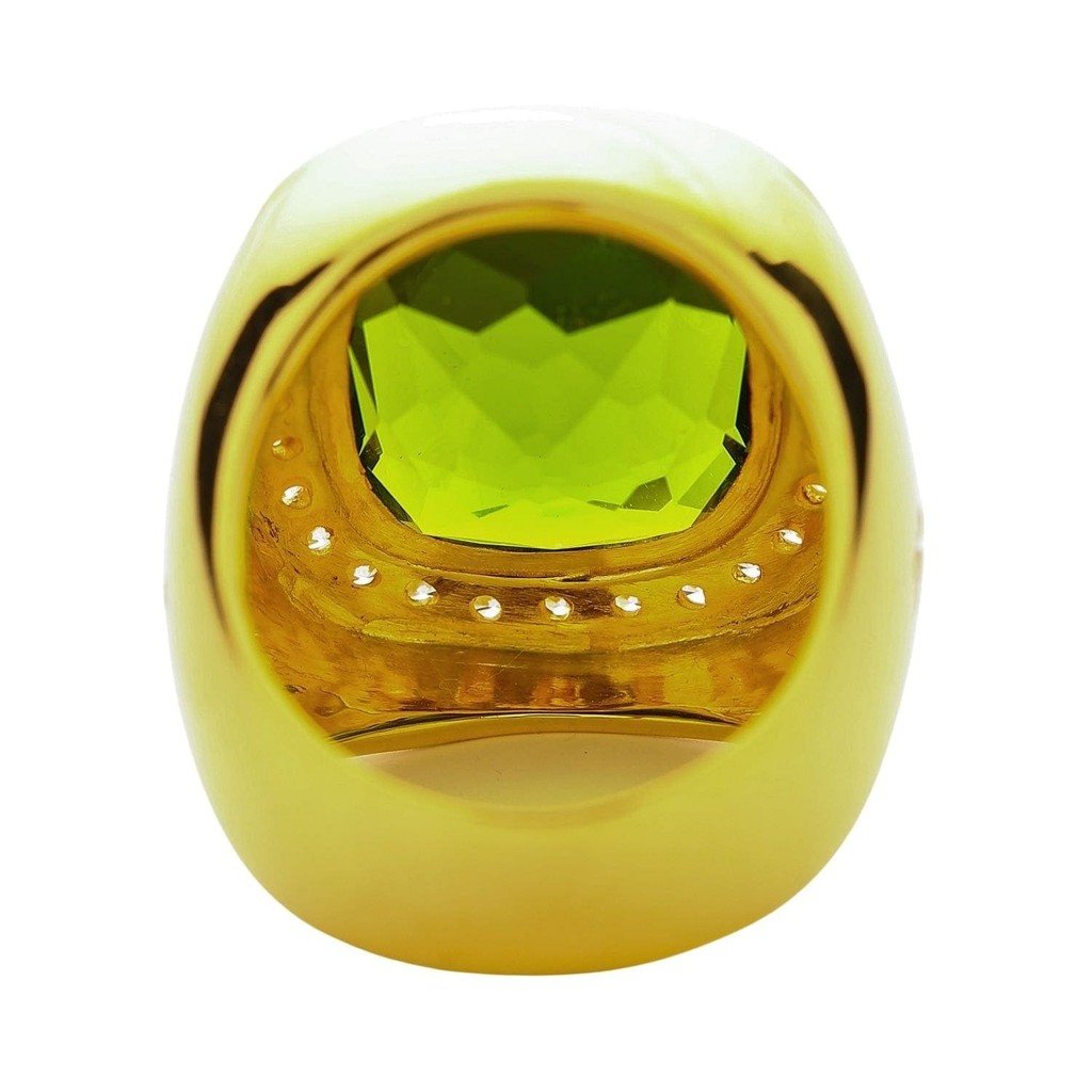 The peridot is the kind of green that makes people stop mid-sentence. Not emerald dark, not lime light — a vivid olive-chartreuse that shifts between yellow-green and pure green depending on the angle. Set in 14K gold at 24 grams total, this ring commands attention from across a room.