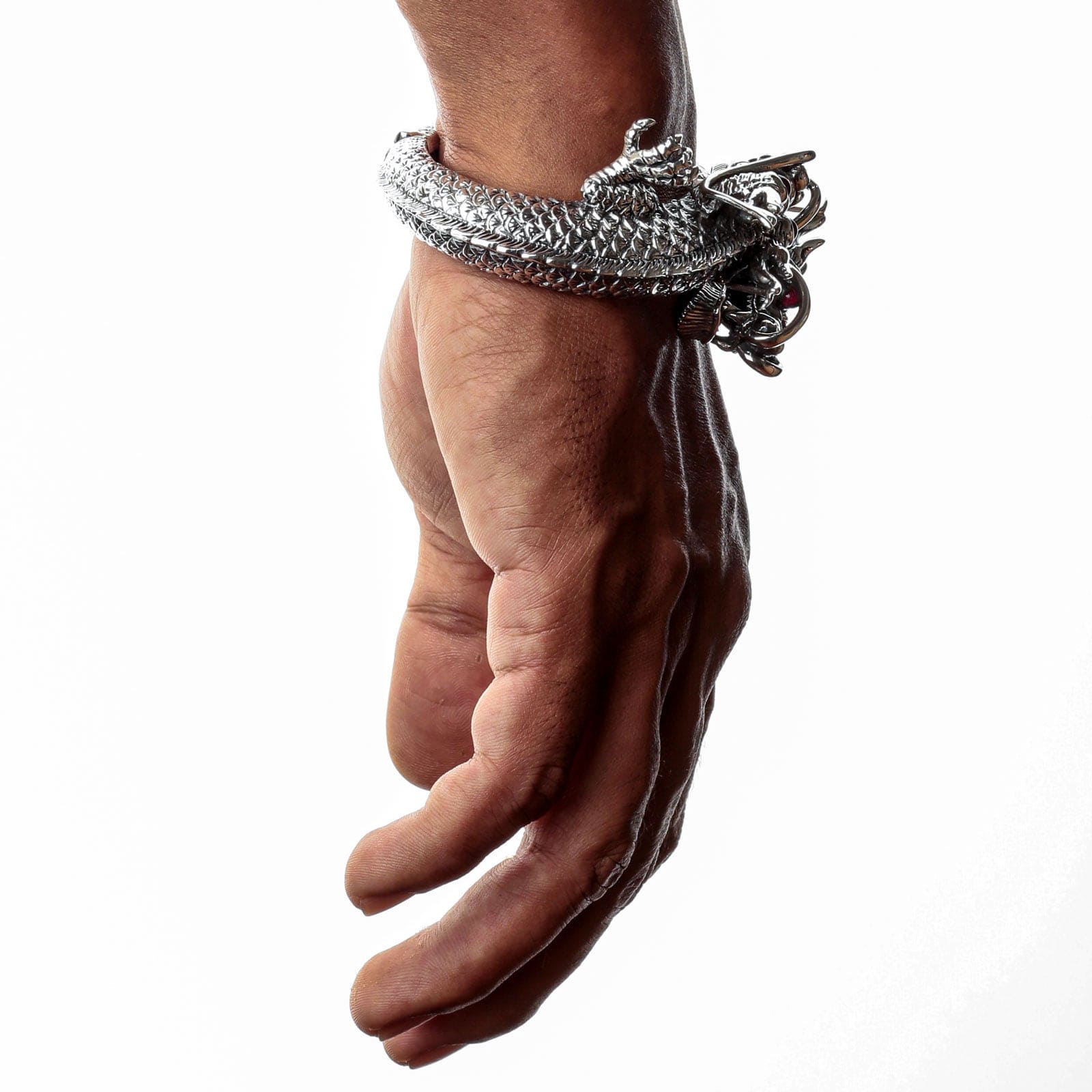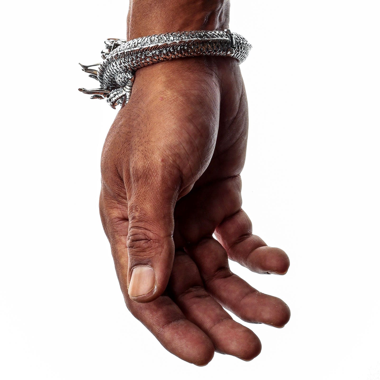 Q: How does the cuff open and close? A: This sterling silver dragon bracelet is not a traditional open cuff; it is a hinged bangle. It features a cleverly integrated and secure hinge mechanism that allows it to open wide for easy placement on the wrist, and then it closes securely with a hidden clasp, ensuring a safe fit for such a substantial piece.