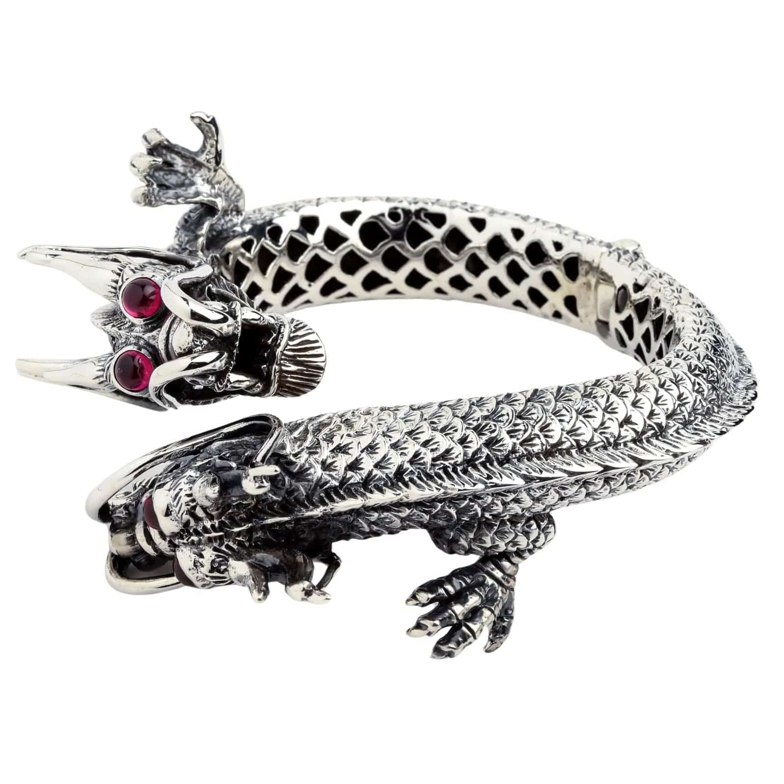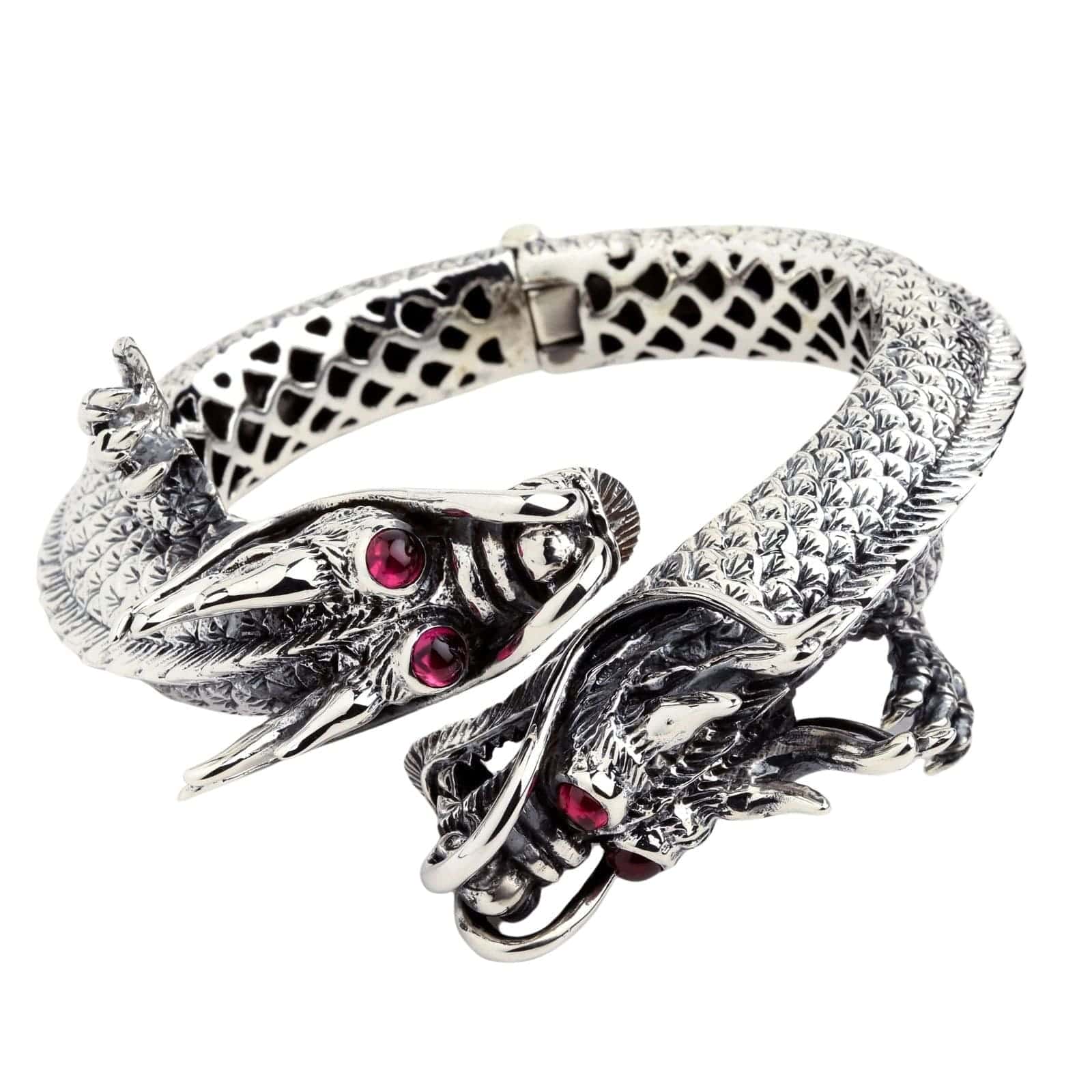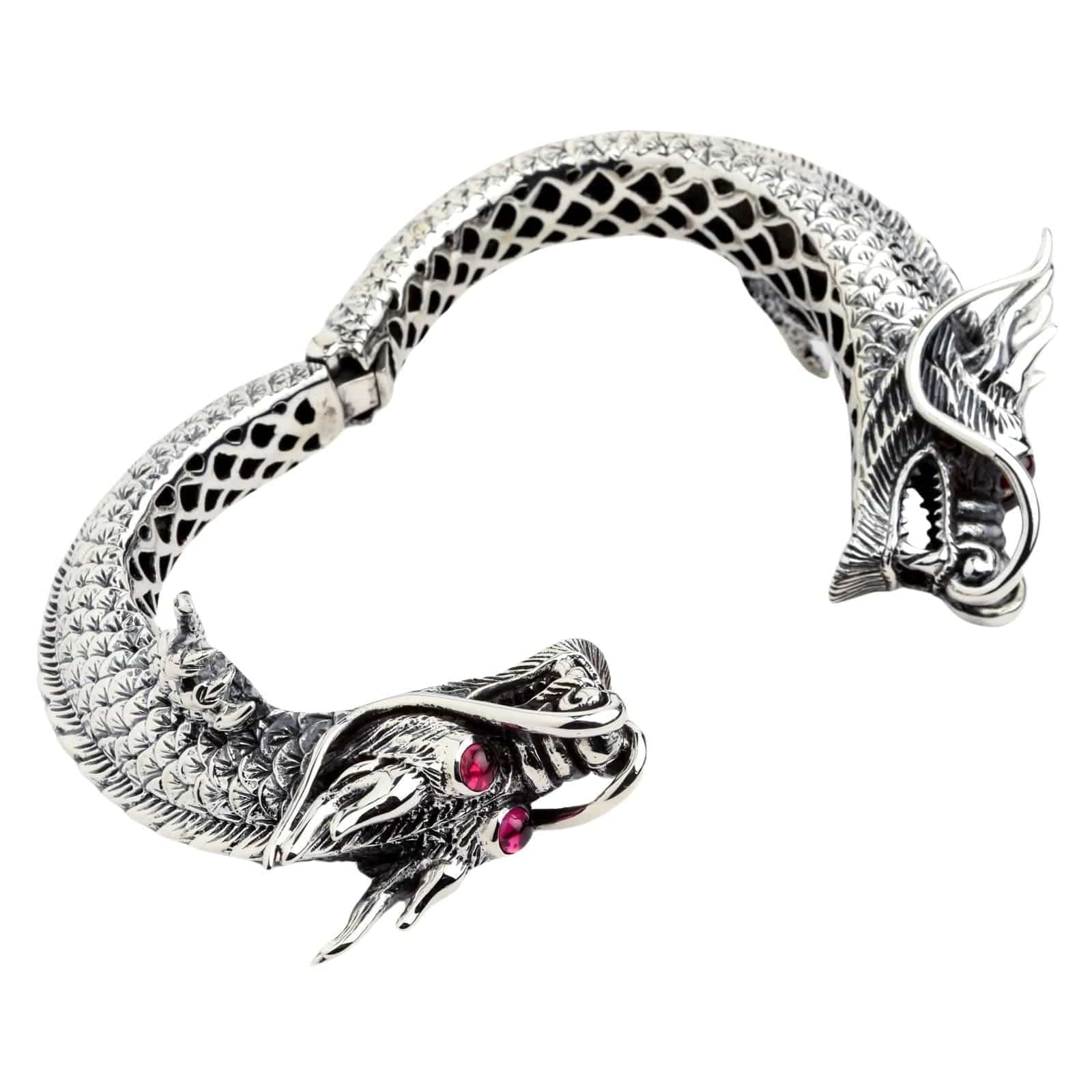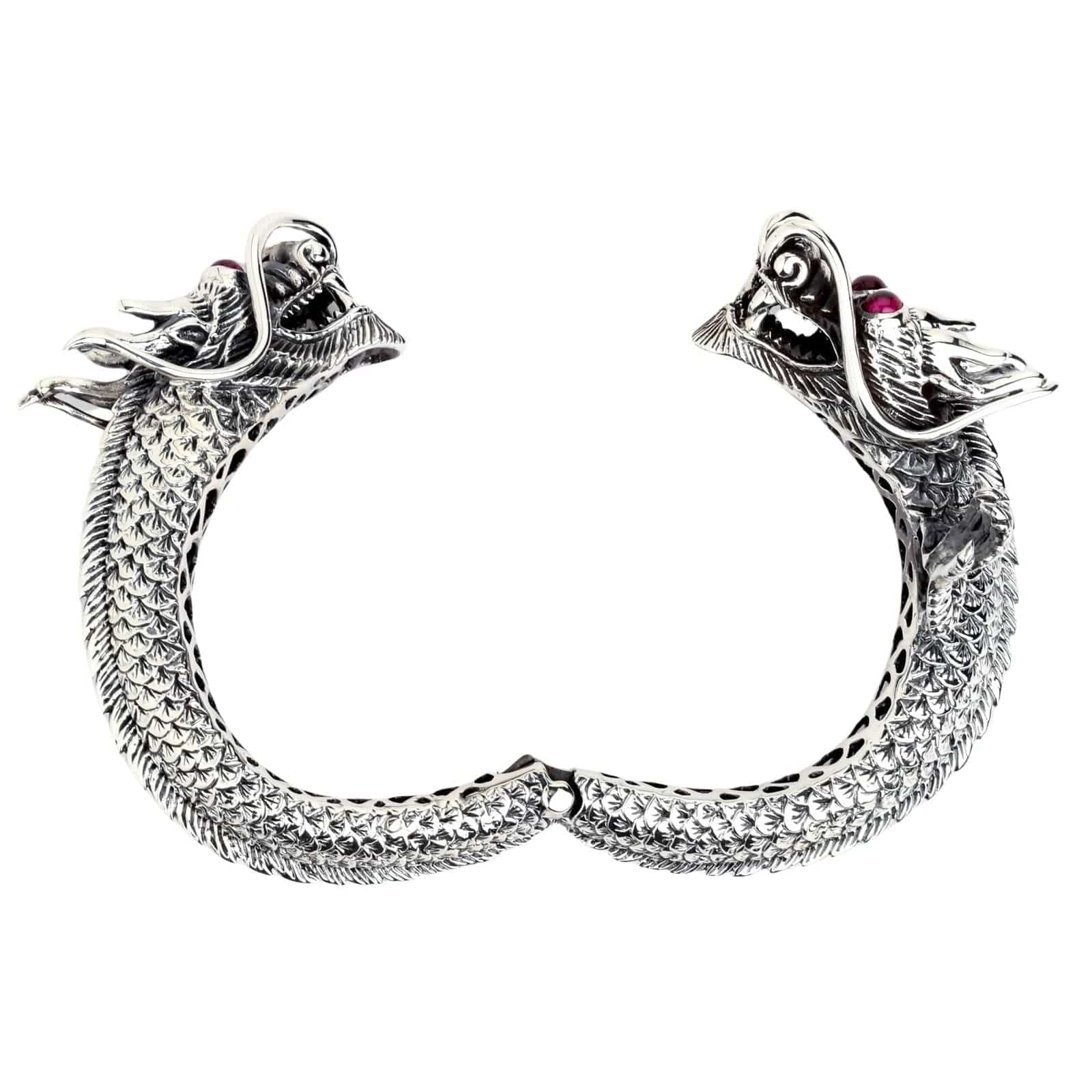 This masterpiece features two magnificent, intricately detailed twin dragon heads facing each other in a timeless display of formidable power. Their powerful bodies, a breathtaking tapestry of individually carved scales, form the band of this massive cuff. Their eyes, set with blazing red ruby stones, seem to glow with an inner fire, while their open-mouthed snarls and flared whiskers are captured in stunning, three-dimensional detail. Even the inside of the cuff reveals an intricate, cutout scale pattern, showcasing the incredible artistry from every angle.