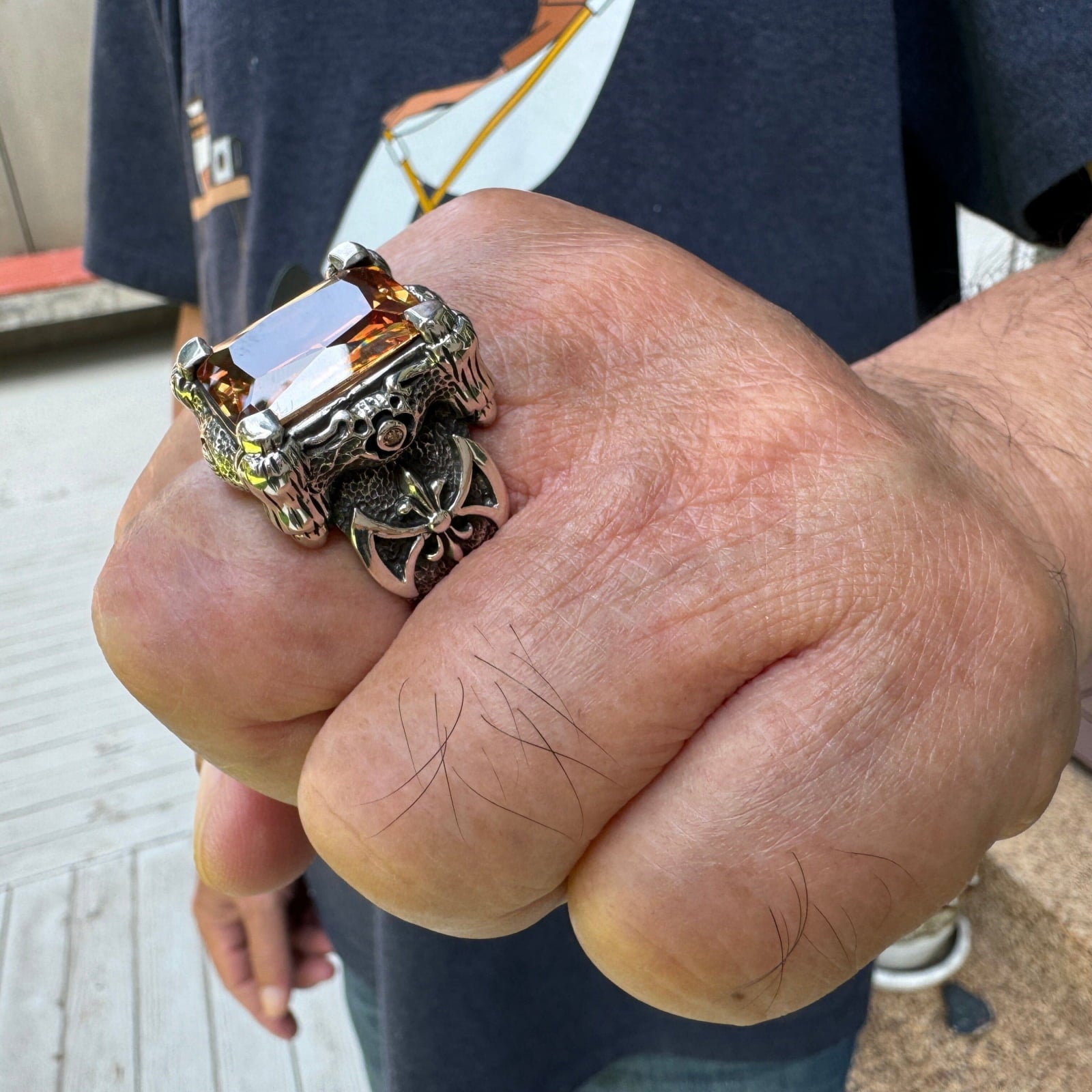 This dragon claw ring is a potent talisman, combining the raw, primal strength of the dragon with the solar energy and abundance symbolized by the Imperial Topaz. This men's gothic ring is a monument to handcrafted excellence, weighing a substantial 22 grams. It's an unforgettable statement of fantasy and might, built to be treasured for a lifetime.