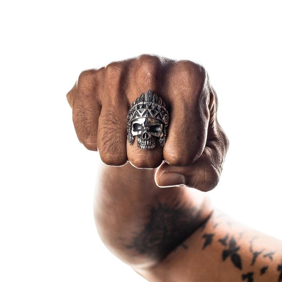 Channel the powerful spirit of a tribal leader with this commanding indian chief skull ring. This is no ordinary accessory; it's a massive, heavyweight statement of honor, freedom, and untamed strength. Forged for the modern warrior and the independent free-thinker, this indian skull ring masterfully combines the solemn symbol of the skull with the revered imagery of a chieftain's war bonnet, creating a piece that radiates authority and demands respect.
