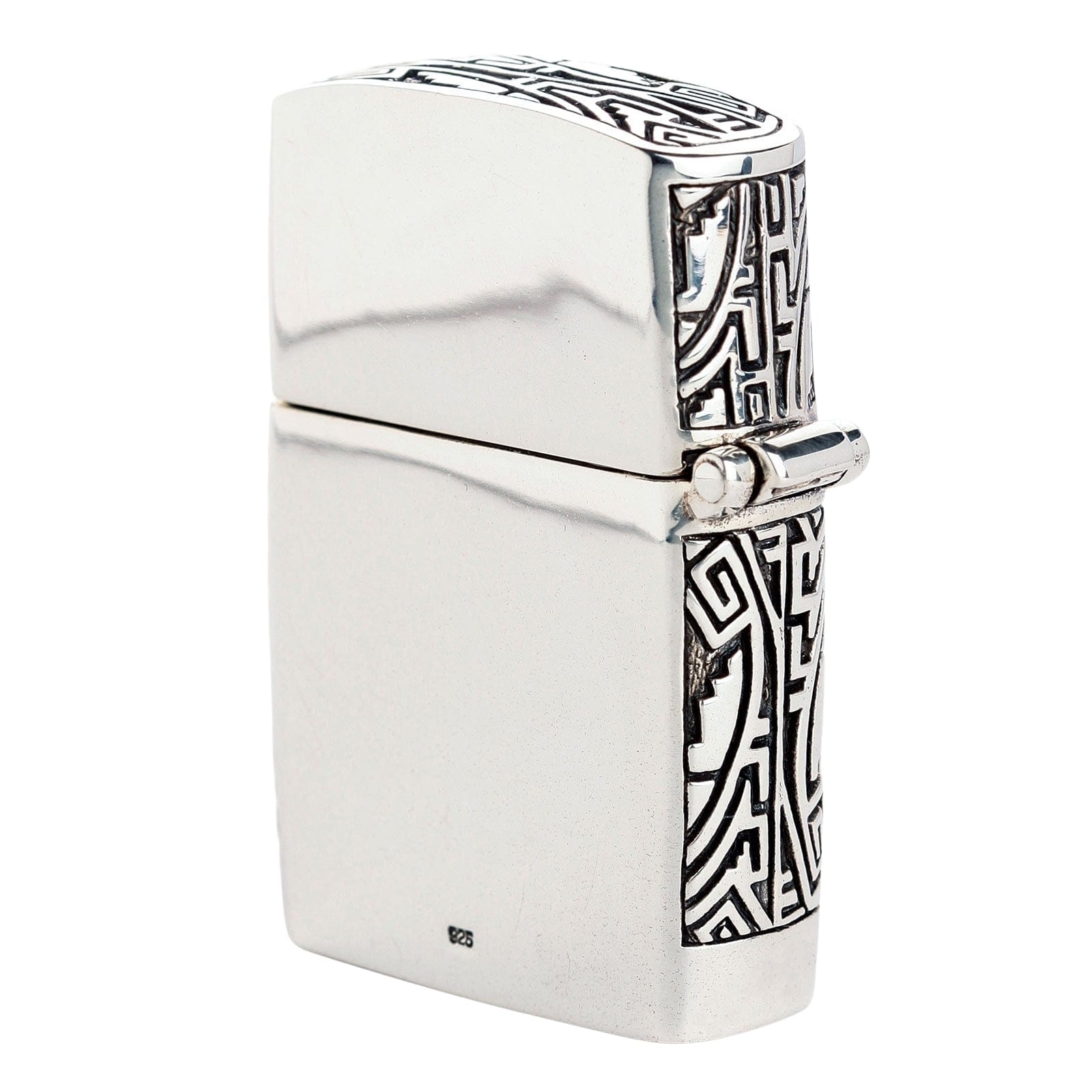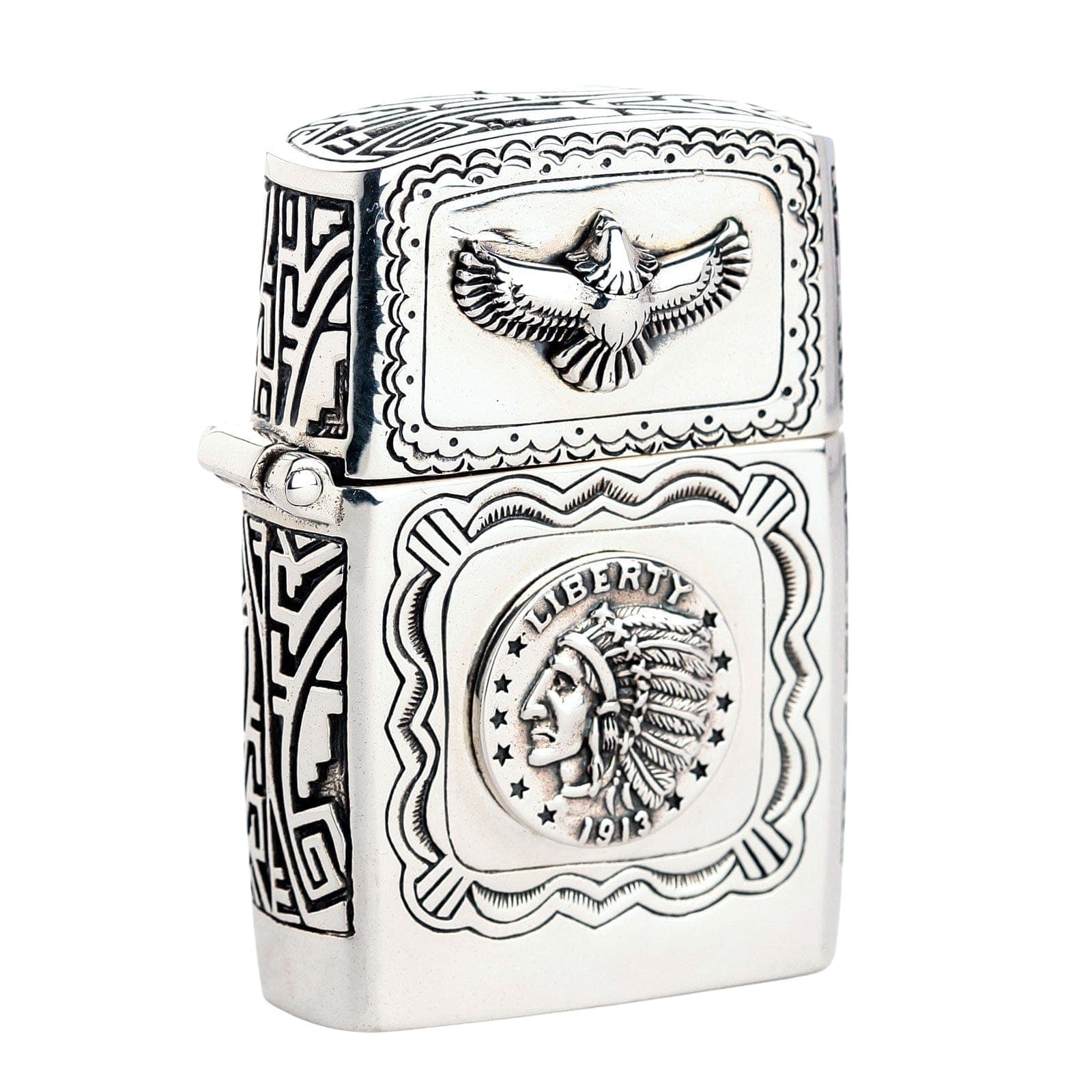 This Zippo case is a canvas of iconic Americana. The body proudly displays a faithful recreation of the classic Indian Head Nickel, complete with the 'Liberty' inscription and a proud chief in a full feather headdress. Above it, on the lid, a majestic eagle soars with its wings spread wide—a timeless emblem of freedom and strength. The sides of the case are deeply engraved with geometric tribal patterns, completing the rugged Southwestern aesthetic. The true power of this piece is in its substance. Forged from a massive 106 grams of solid 925 sterling silver, it has an incredible, authoritative weight. This is a true heirloom-quality piece of functional art, designed to last for generations.