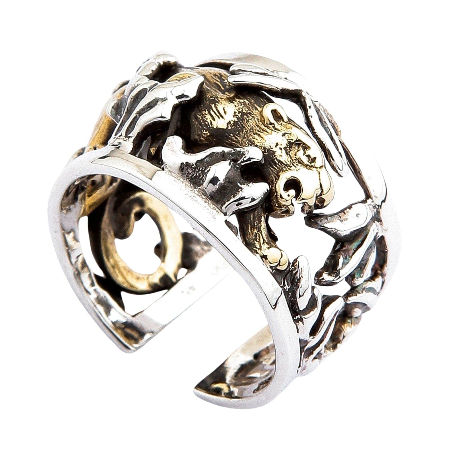 Embody the spirit of the East with our Japanese Gold Tiger Sterling Silver Ring. This dynamic piece captures the raw power and ferocity of the tiger, a revered symbol of strength, courage, and protection against bad luck. Expertly handcrafted, this ring features a stunning two-tone design where a fierce, gold-plated tiger prowls through a silver bamboo forest. It is the perfect accessory for the man who appreciates bold symbolism and the versatility of an adjustable silver ring.