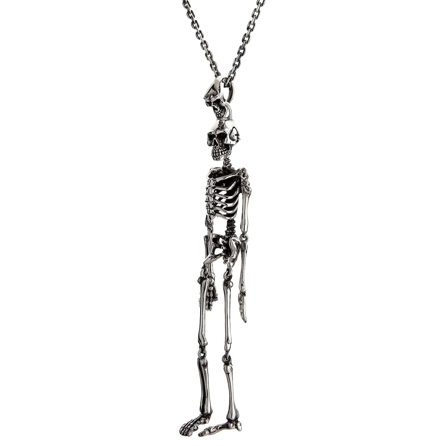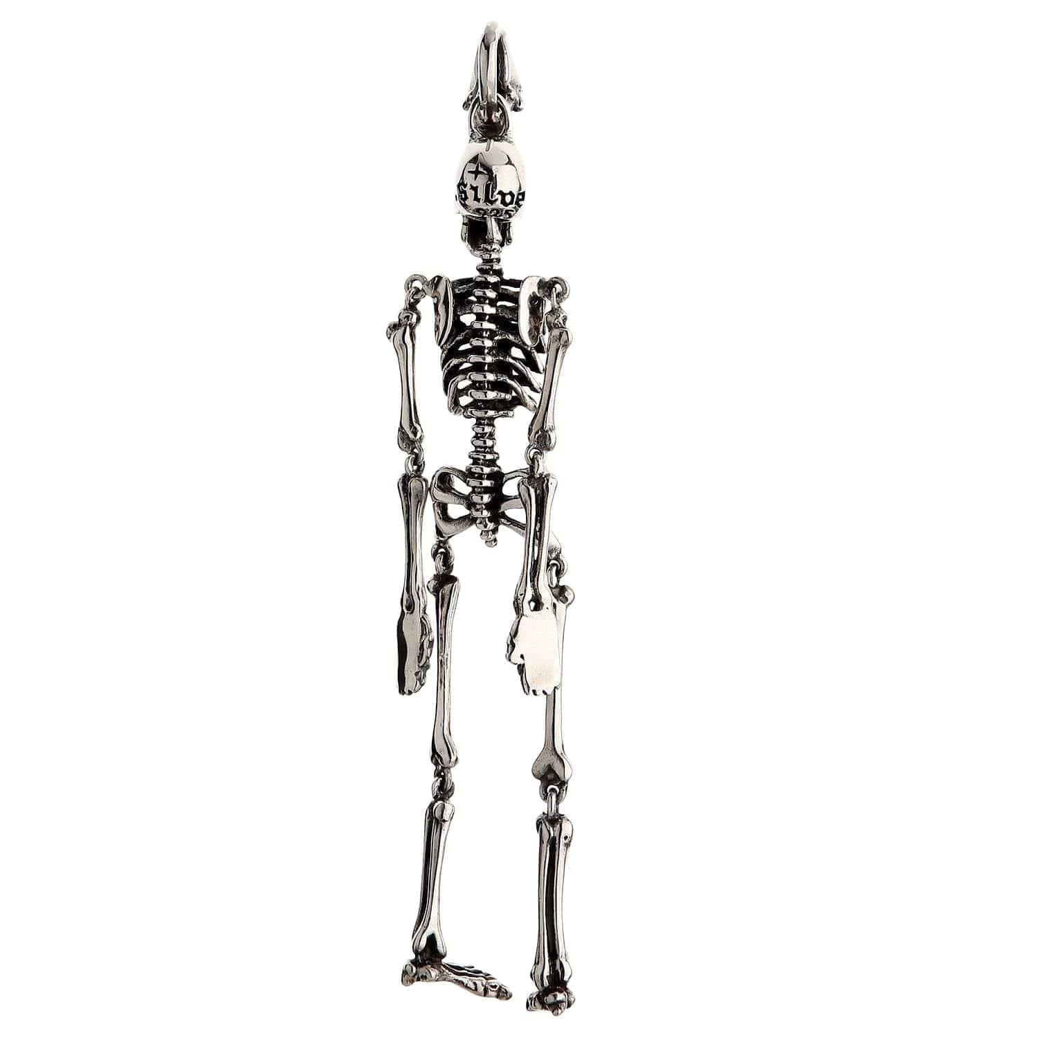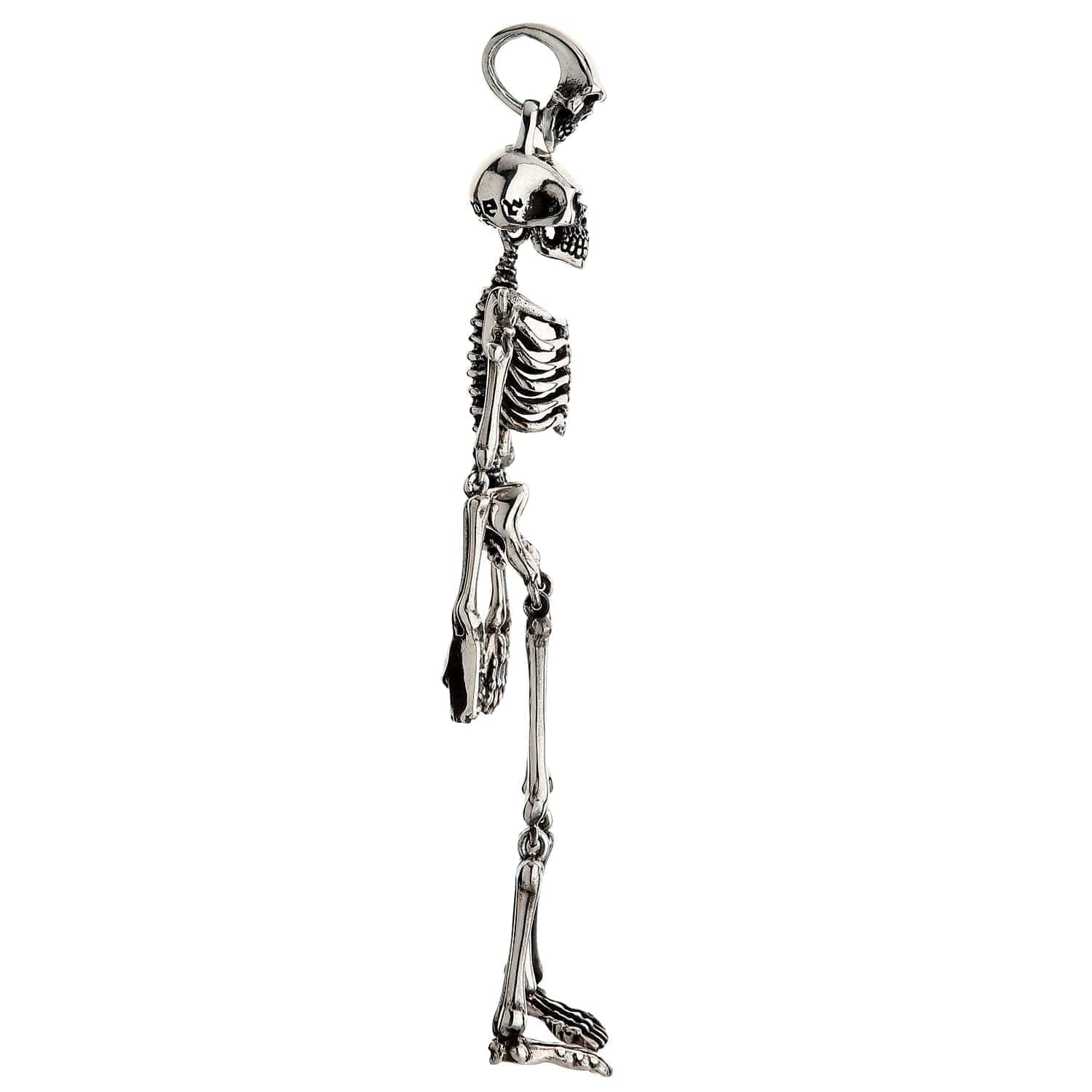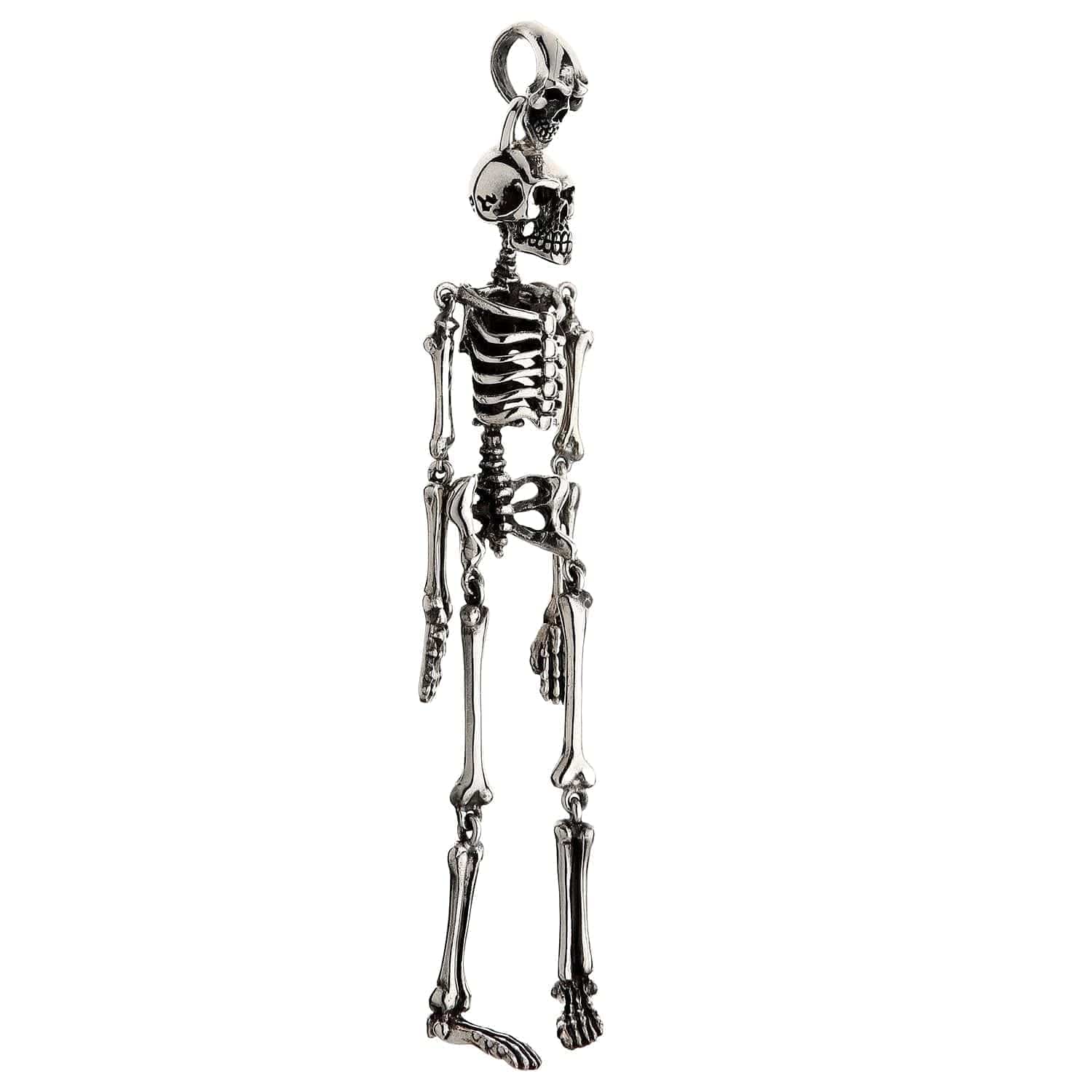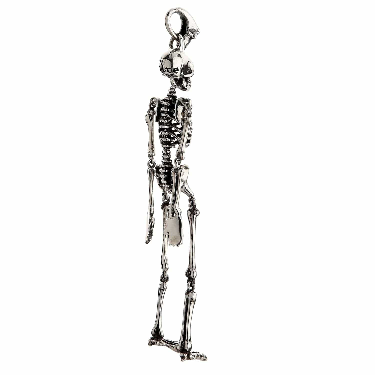 The sterling silver skeleton pendant showcases extraordinary craftsmanship, with every bone—from the skull down to the toes—meticulously sculpted for anatomical accuracy. At an impressive 125 mm (4.9 inches) tall, it’s a true statement piece, with movable joints that give it a dynamic, lifelike presence. The bale itself is topped with a secondary skull, adding to its gothic appeal. The combination of polished silver and oxidized detailing enhances depth, giving the piece an aged, mysterious character.