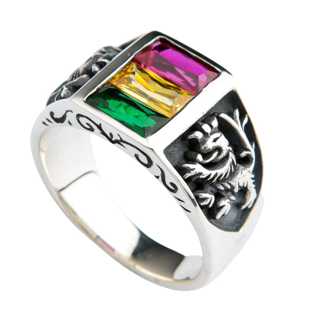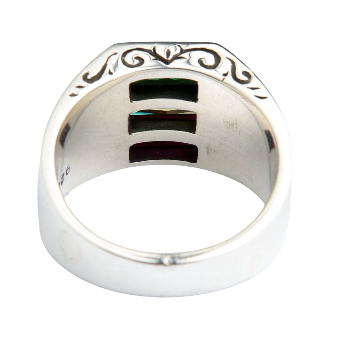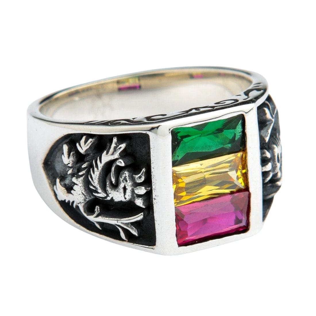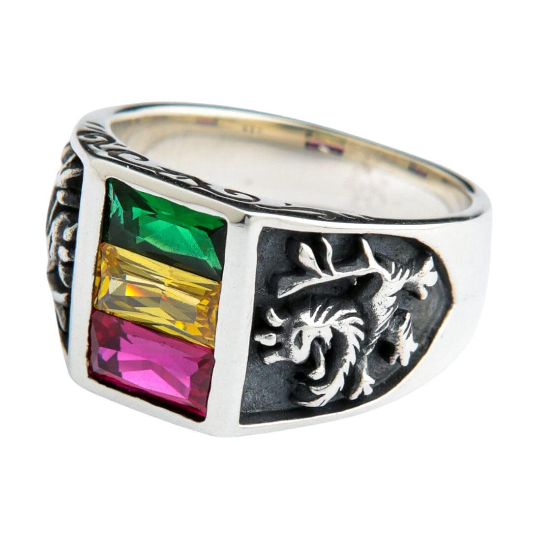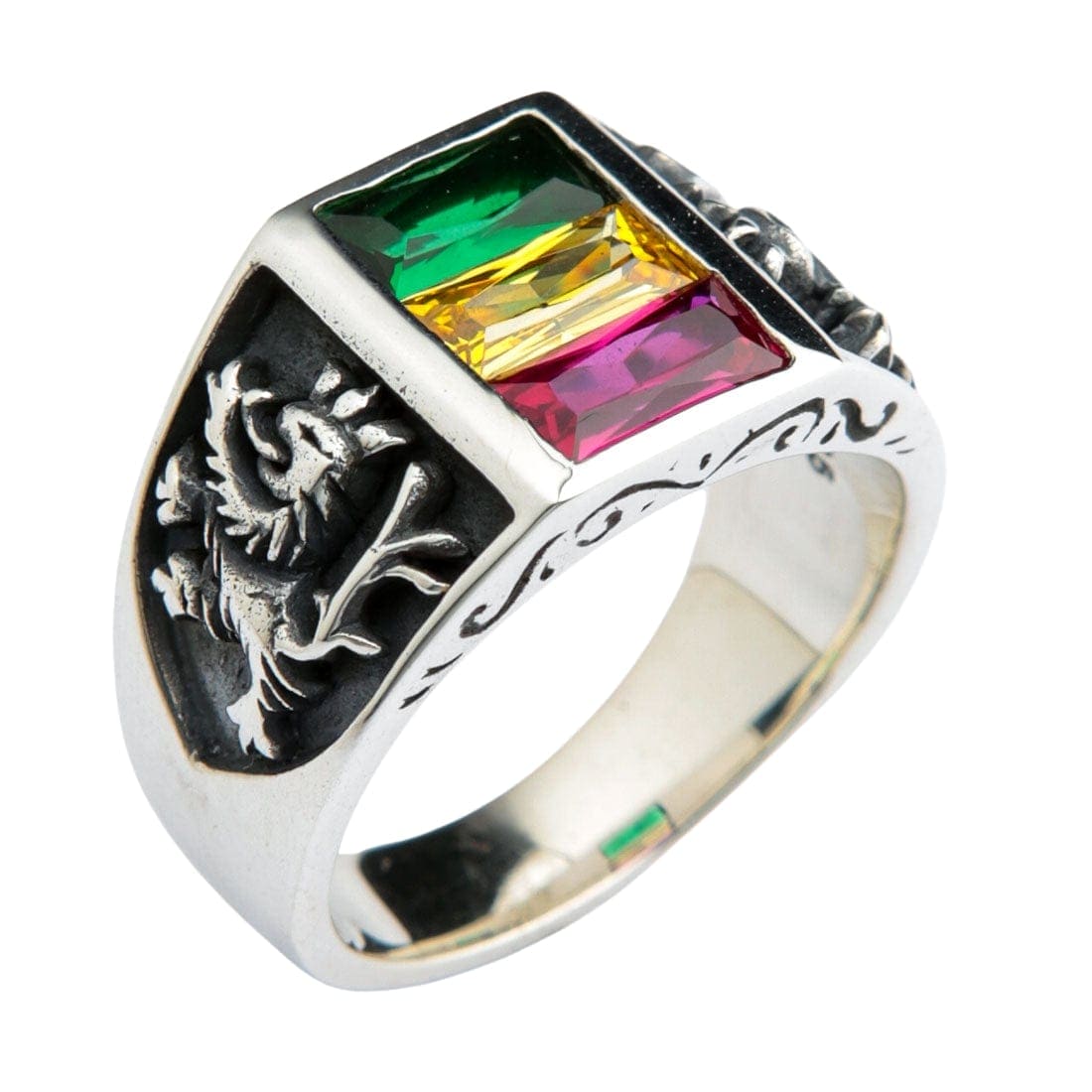 The ring's face is proudly set with three vivid, baguette-cut gemstones in green, yellow, and red. These are the iconic Pan-African colors of the Ethiopian flag, each carrying deep spiritual significance in Rastafarian culture: green for the fertile promised land, yellow for its wealth and prosperity, and red for the blood shed for freedom. This vibrant display makes it the ultimate Rasta ring for followers and admirers alike. Handcrafted by our skilled artisans, this piece of reggae jewelry is a meaningful addition to any collection of Men's Rings.