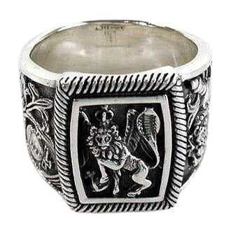 Q: What is a winged lion ring? A: A winged lion ring depicts the Lion of Saint Mark, the traditional and historic symbol of the city of Venice and its patron saint, St. Mark the Evangelist. It's a powerful piece of heraldry that symbolizes majesty, courage, power, and wisdom.