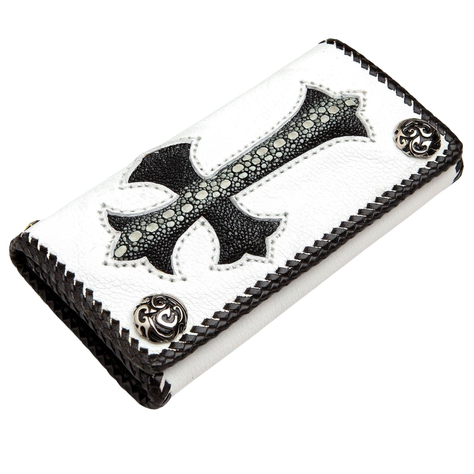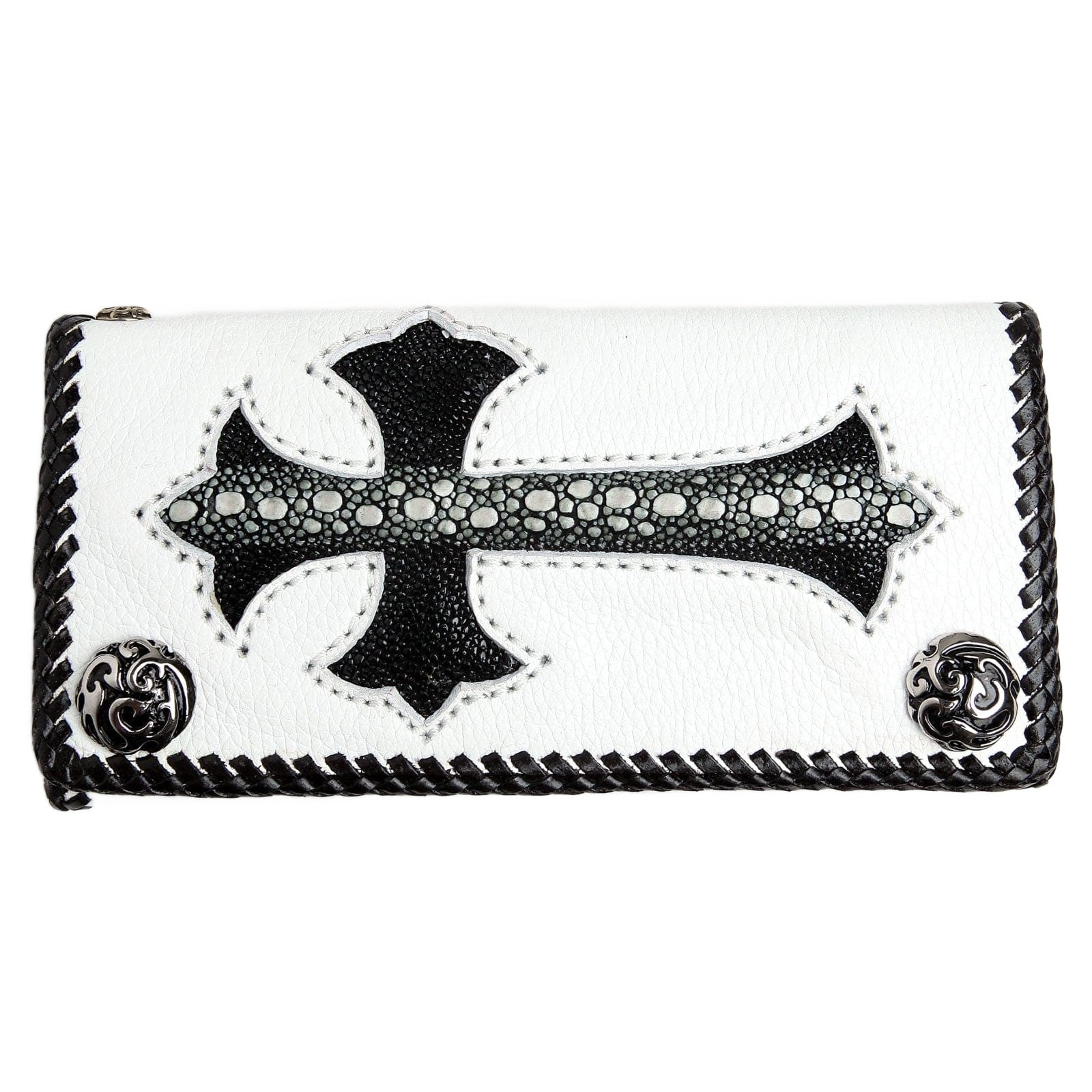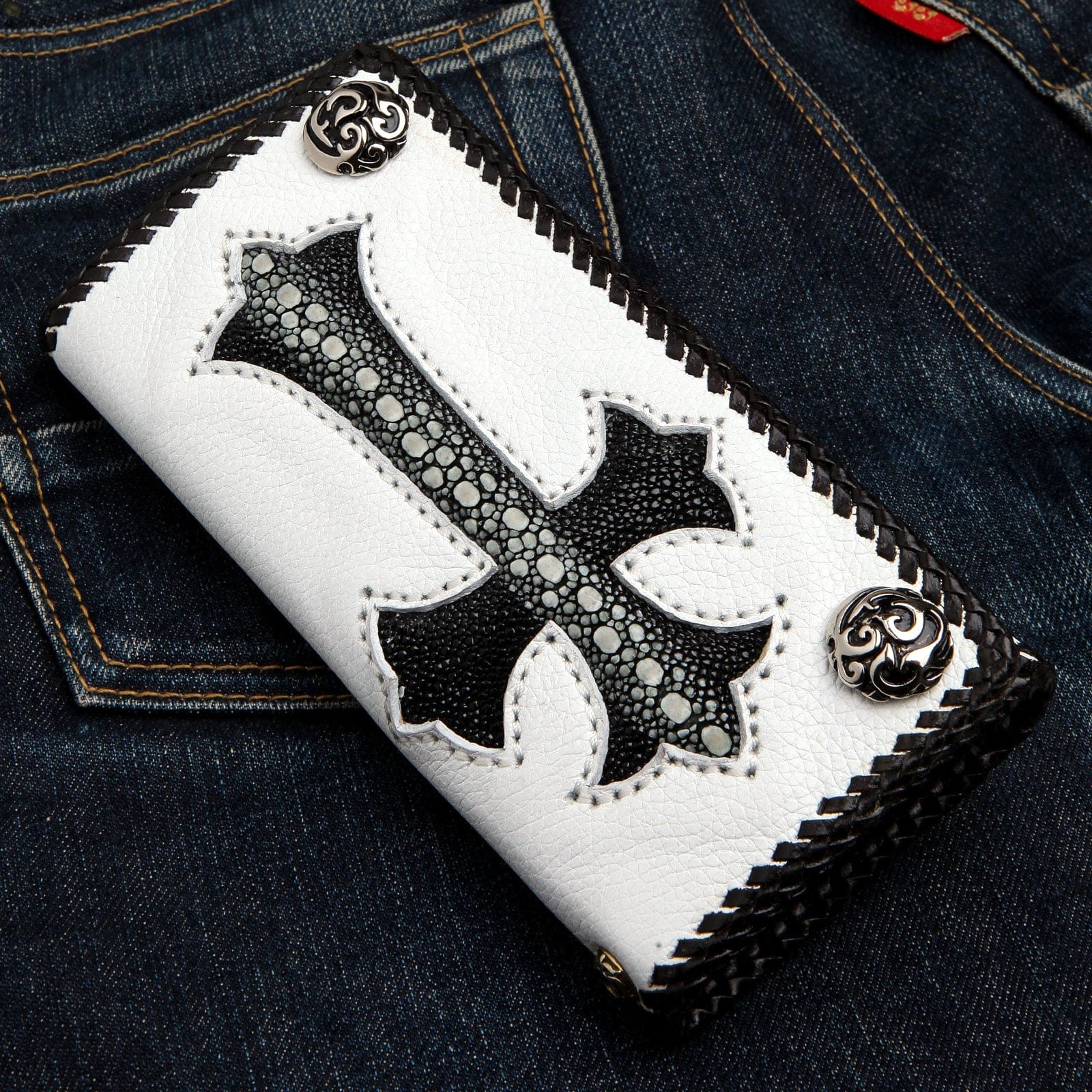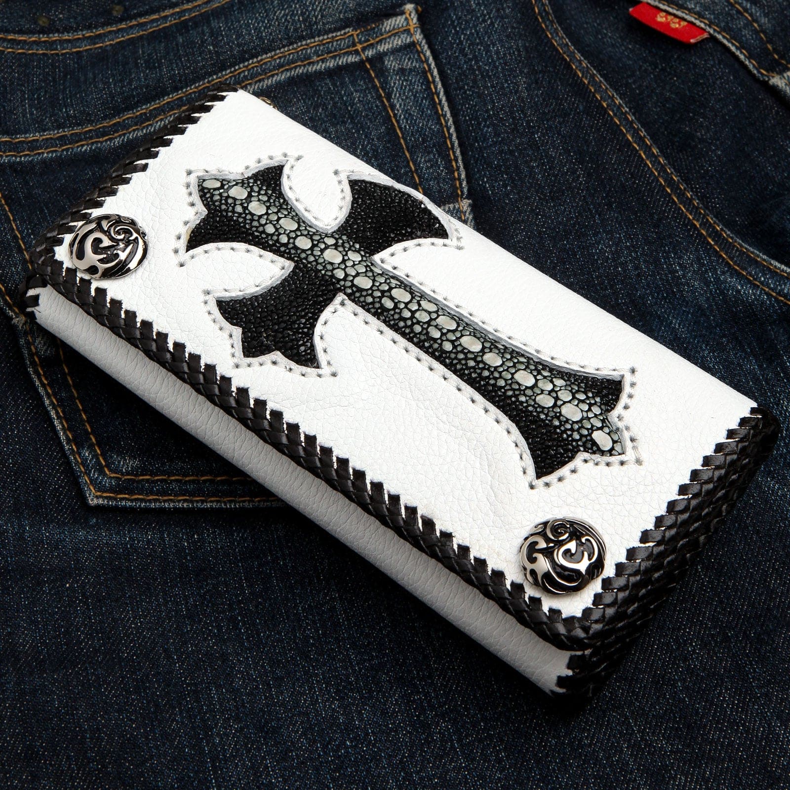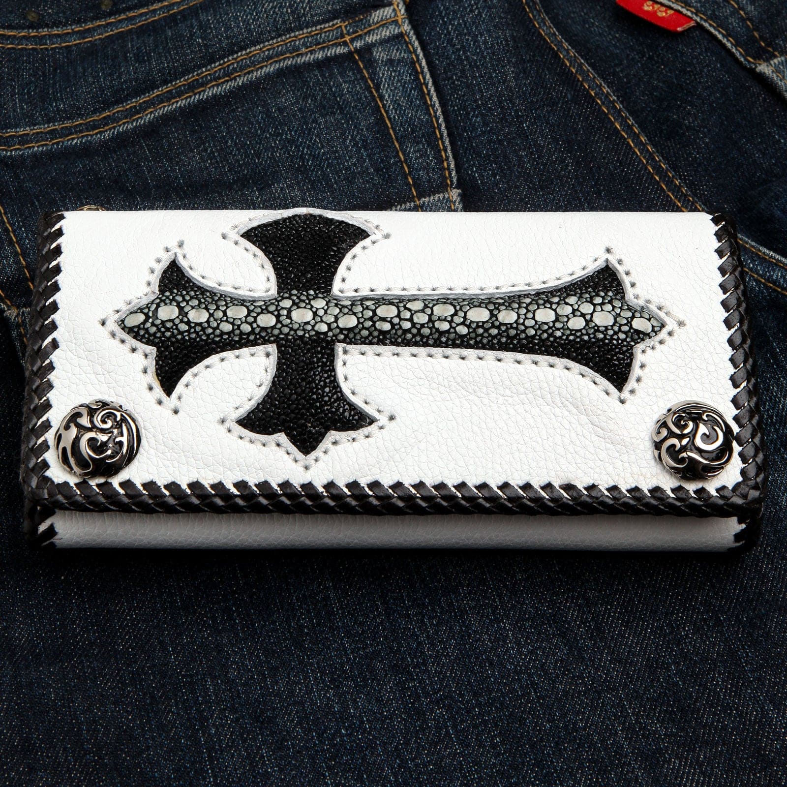 The power of this wallet lies in its dramatic visual contrast. The body is crafted from premium white cowhide leather, a bold and clean canvas. Inlaid into this is a formidable, gothic-style cross made from genuine black stingray leather. Renowned for its unique, caviar-like texture and near-indestructible nature, the stingray inlay provides a stunning focal point. The entire piece is framed with a tough, hand-braided black leather edge, tying the design together. The hardware is just as impressive, with two silver-plated flame concho snaps for secure closure and a solid sterling silver grommet ready for your favorite wallet chain. Inside, the practical trifold design opens to reveal ample storage, including a secure buttoned pocket for coins or small items.